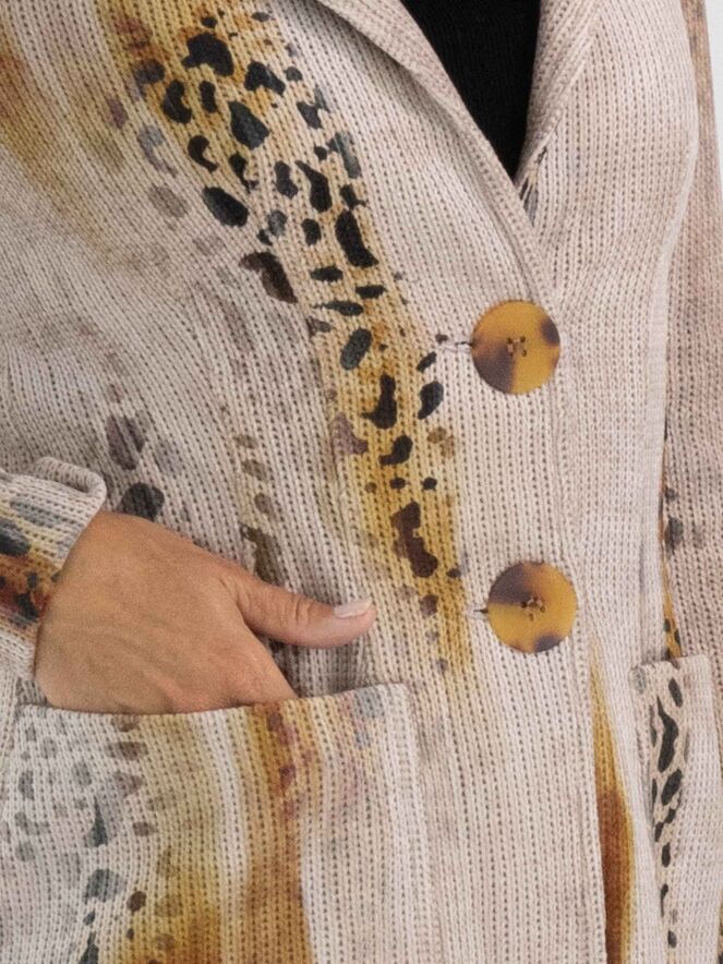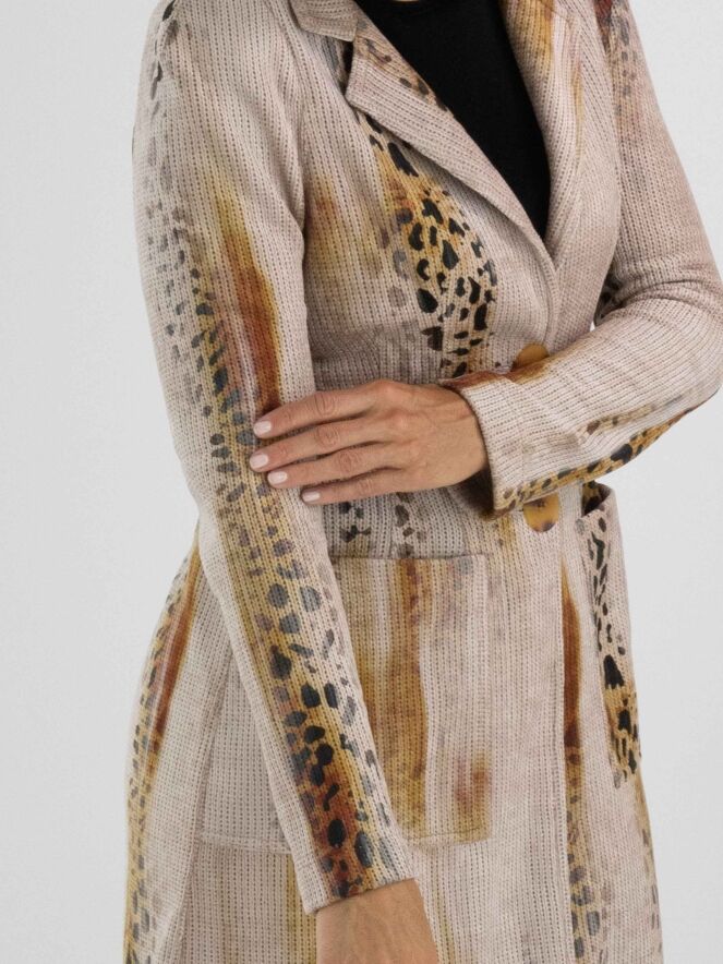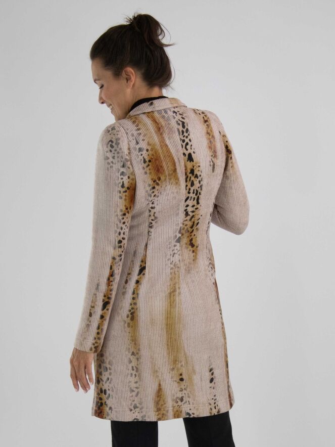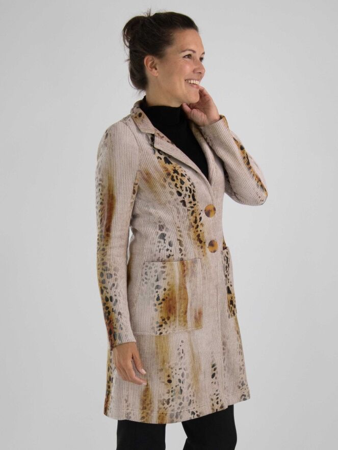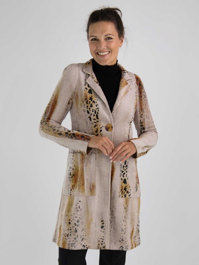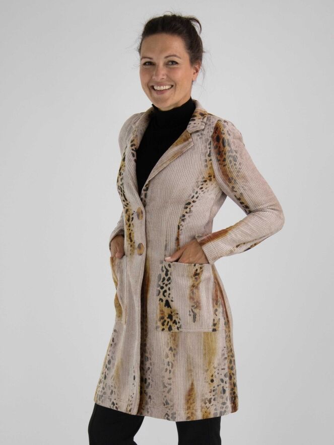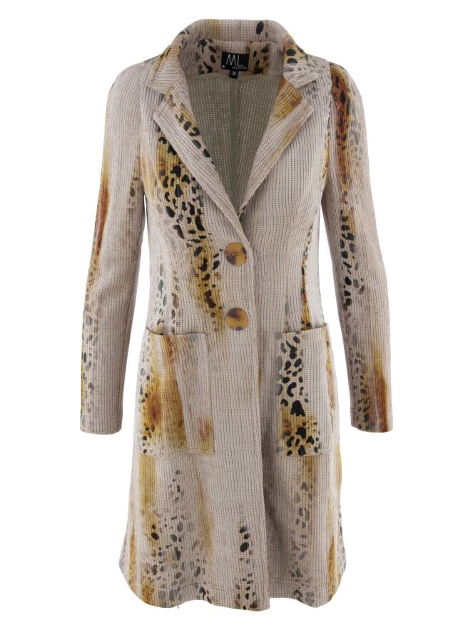 Un long blazer de ML Collections de couleur camel avec un motif panthère imprimé sur le tissu en plusieurs nuances de cognac et noir. Le blazer possède une fermeture à deux boutons et est non doublé. Ce blazer ne doit pas être lavé.