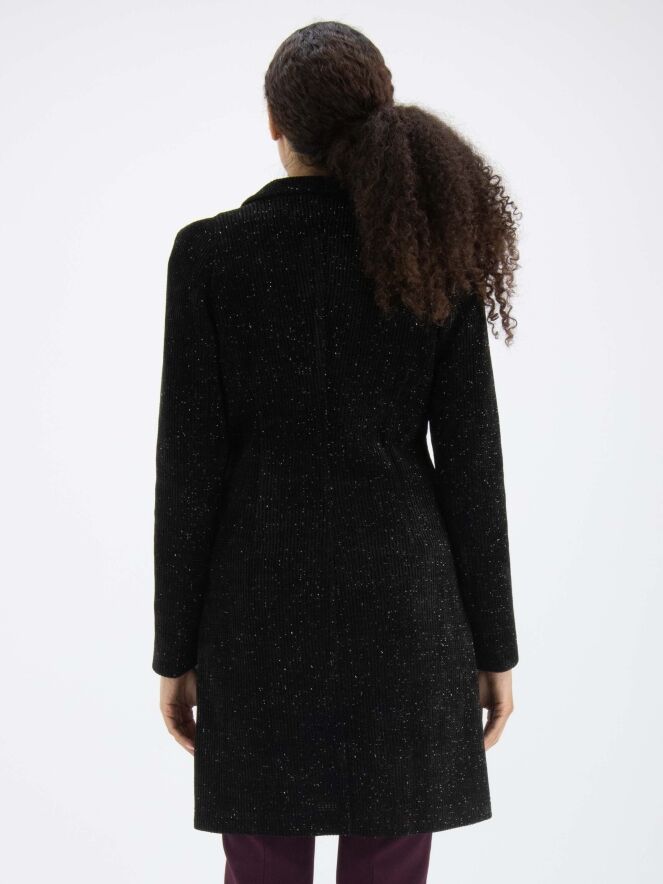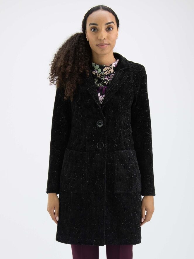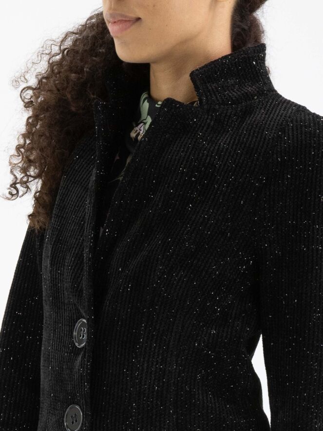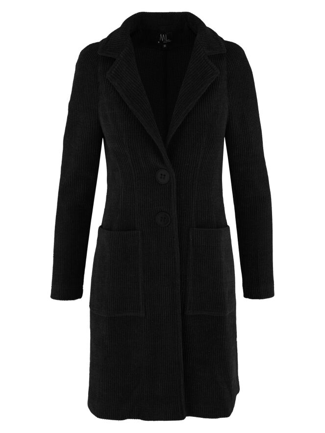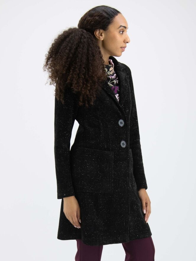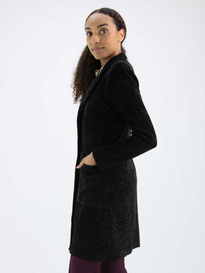 Une longue veste de ML Collections de couleur noire chinée. La veste a une fermeture à deux boutons et n'est pas doublée. Un fil d'argent est tissé dans le tissu. Cette veste ne doit pas être lavée.