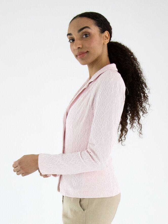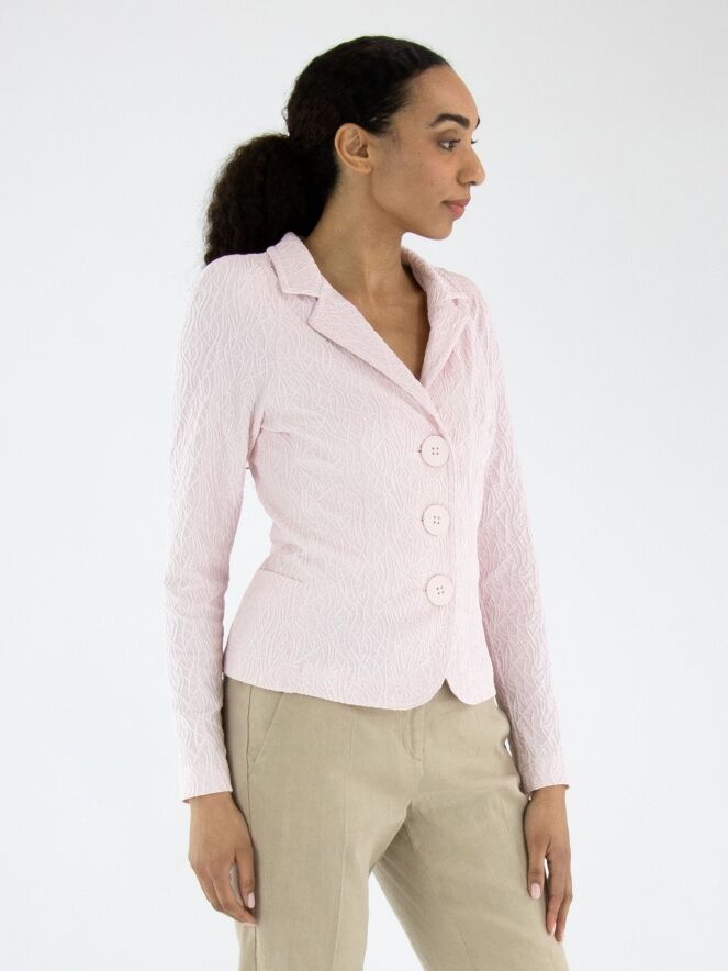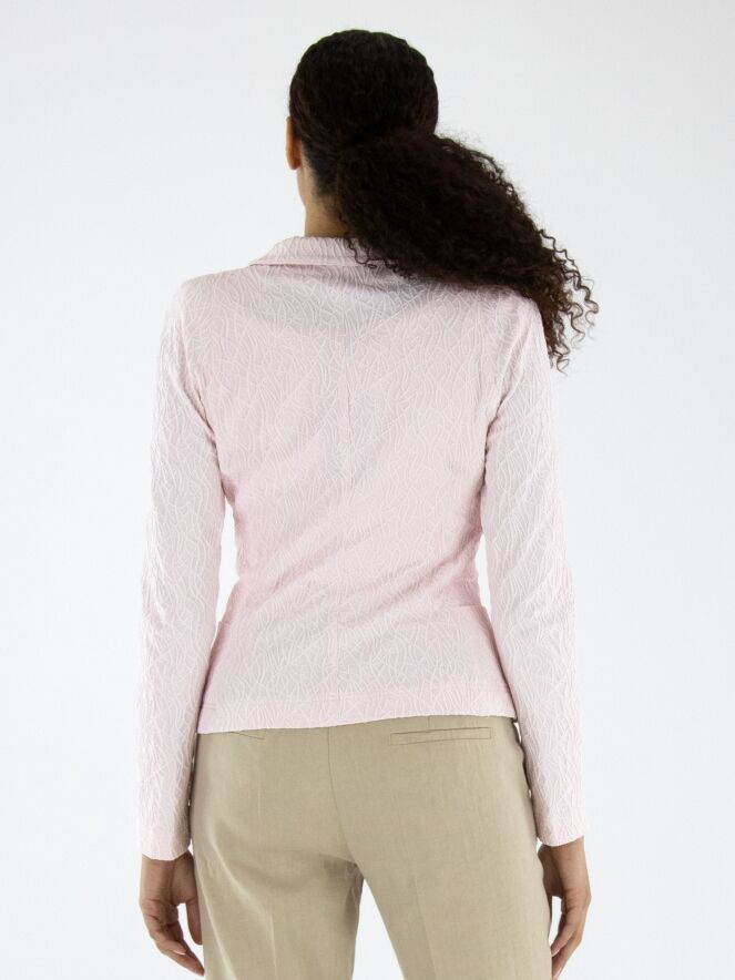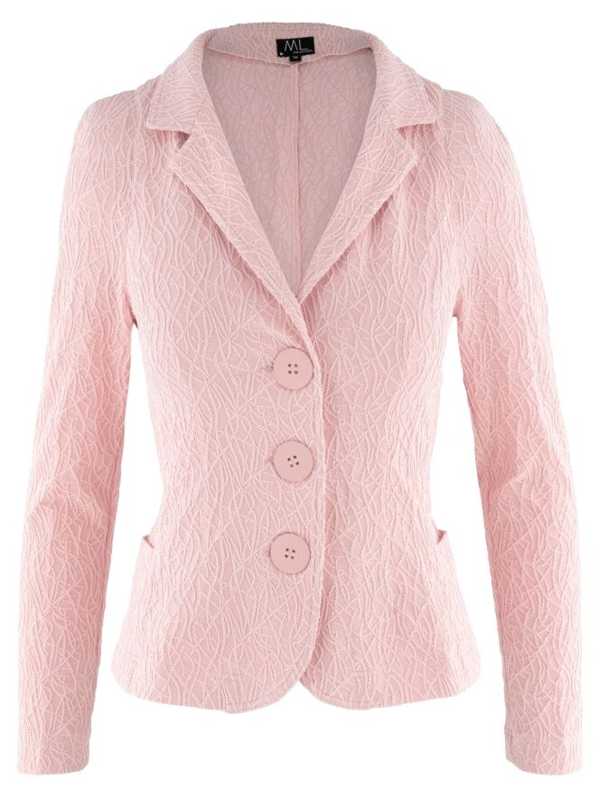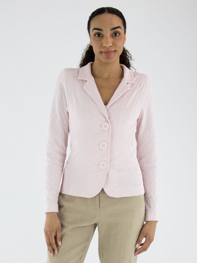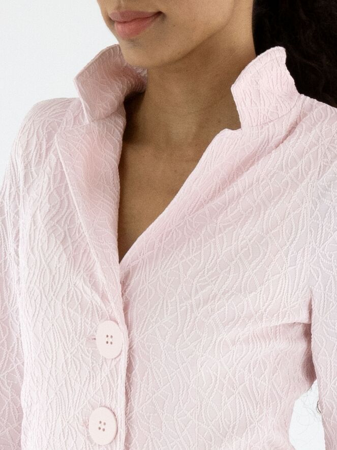 Un blazer de ML Collections avec un motif de rubans décoratifs en rose pastel. Ce blazer possède une fermeture à trois boutons et n'est pas doublé. Ce blazer ne doit pas être lavé.