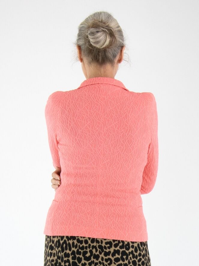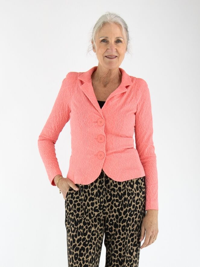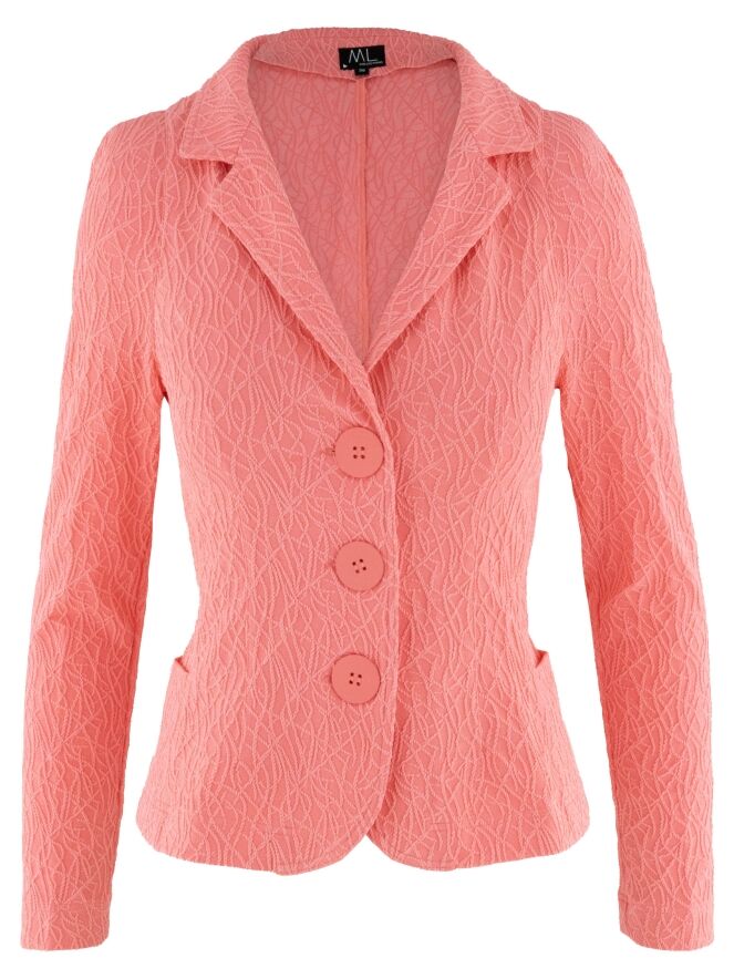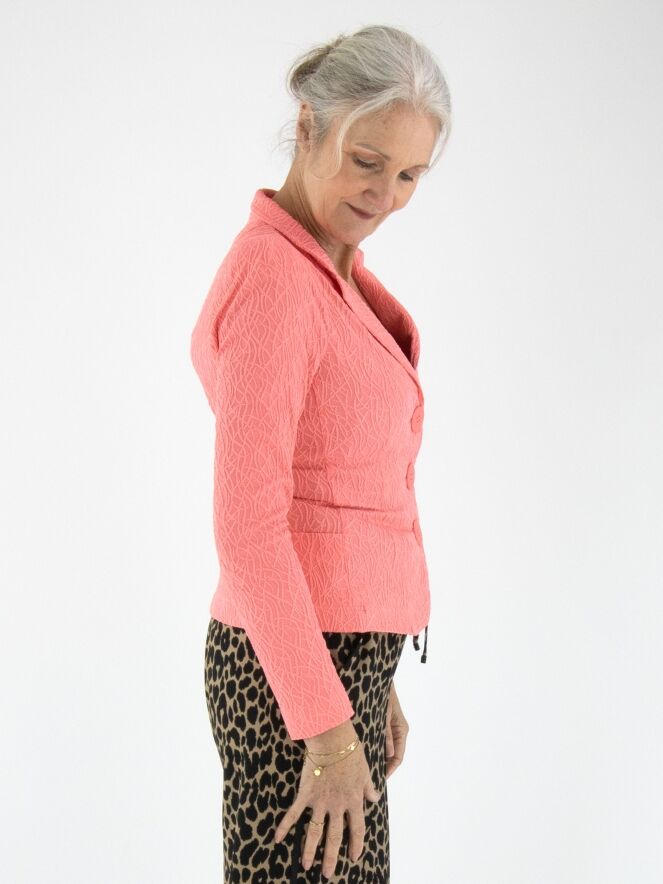Un blazer de ML Collections avec un motif de rubans décoratifs en rouge corail doux. Ce blazer possède une fermeture à trois boutons et n'est pas doublé. Ce blazer ne doit pas être lavé.