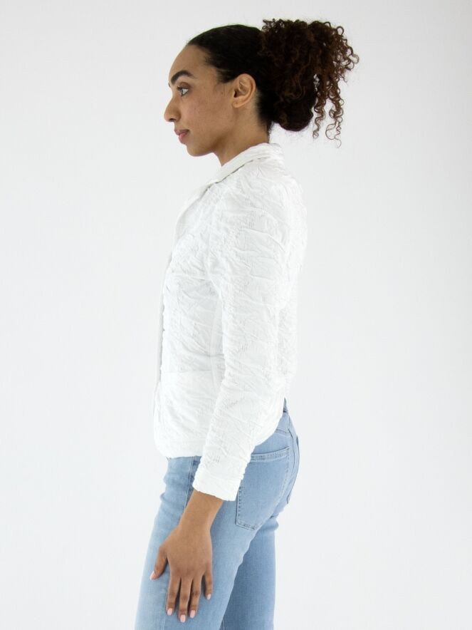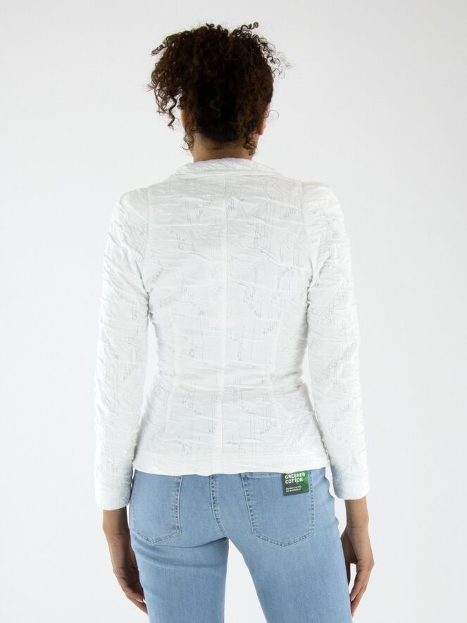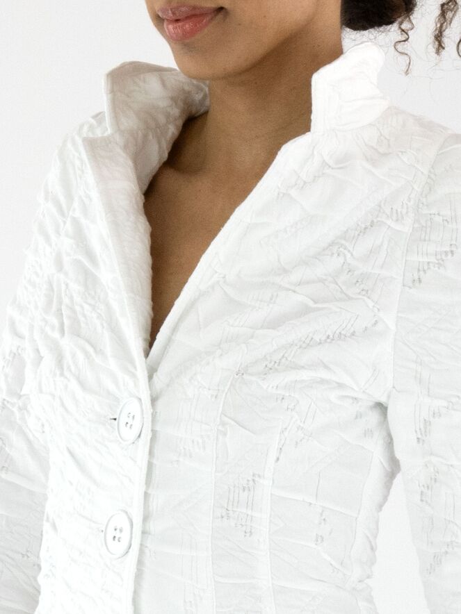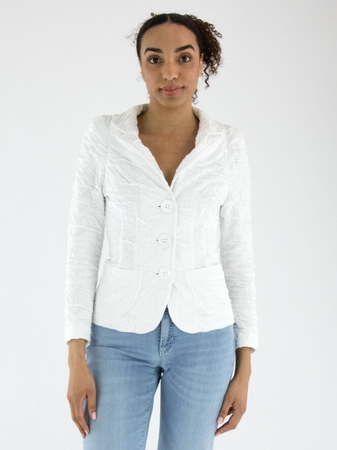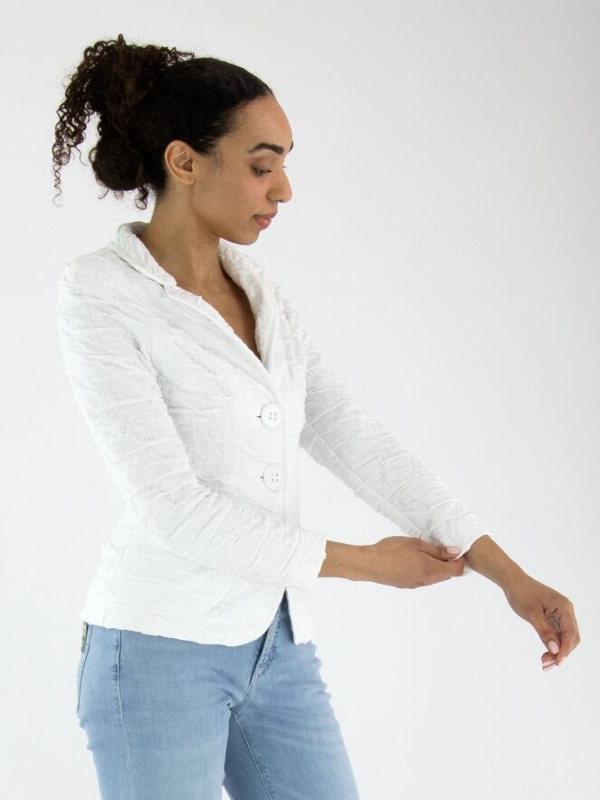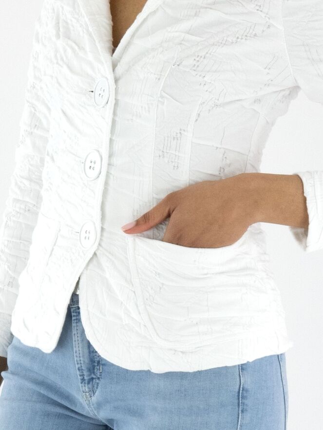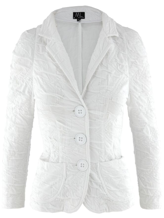 Un blazer de ML Collections en blanc. Le tissu présente une texture smockée. Ce blazer est non doublé et se ferme avec trois boutons. Ce blazer ne doit pas être lavé.