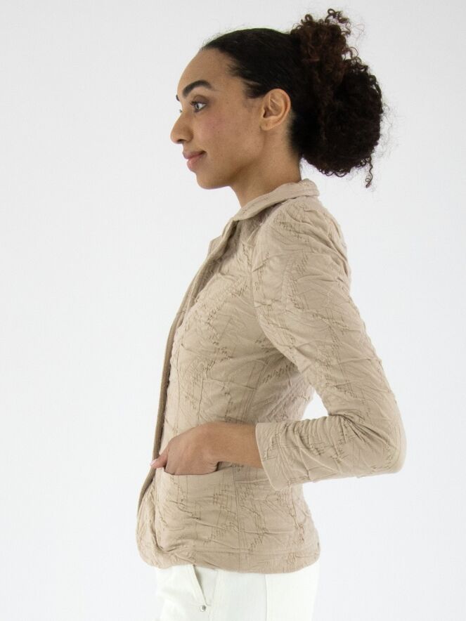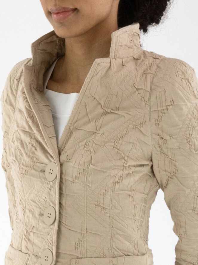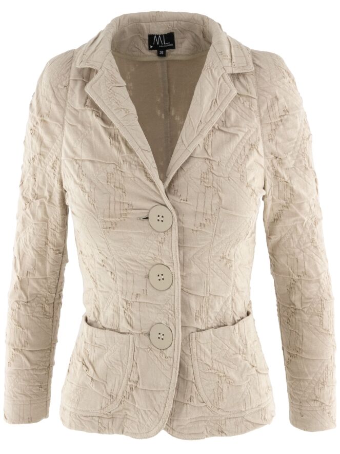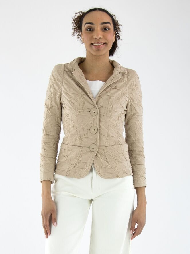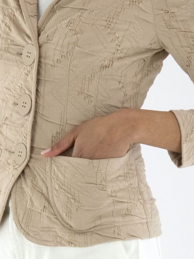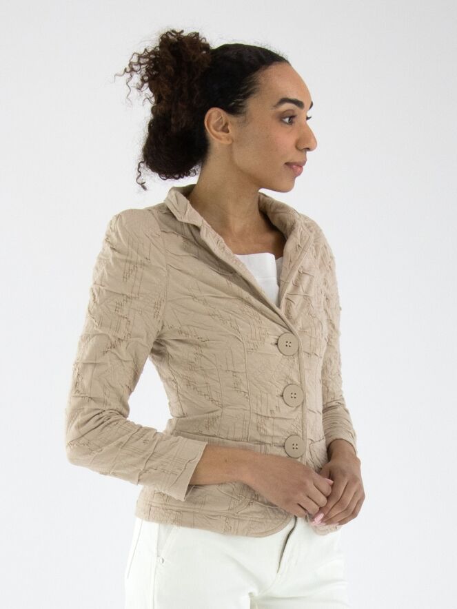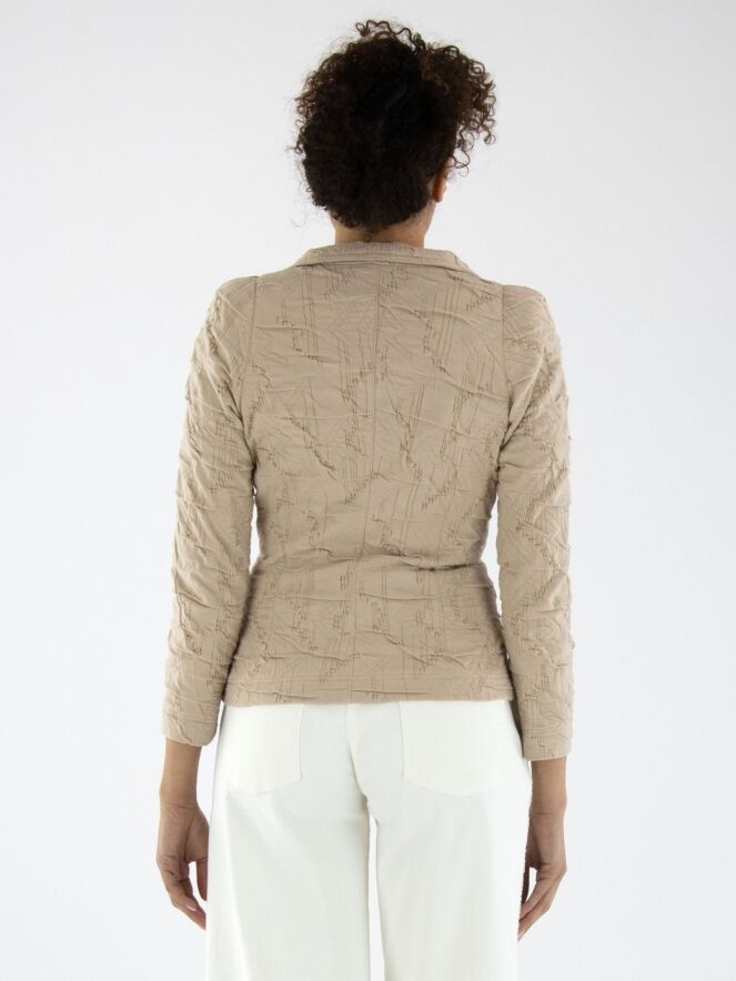 Un blazer de ML Collections en couleur sable. Le tissu présente une texture smockée. Ce blazer n'est pas doublé et possède une fermeture à trois boutons. Ce blazer ne doit pas être lavé.