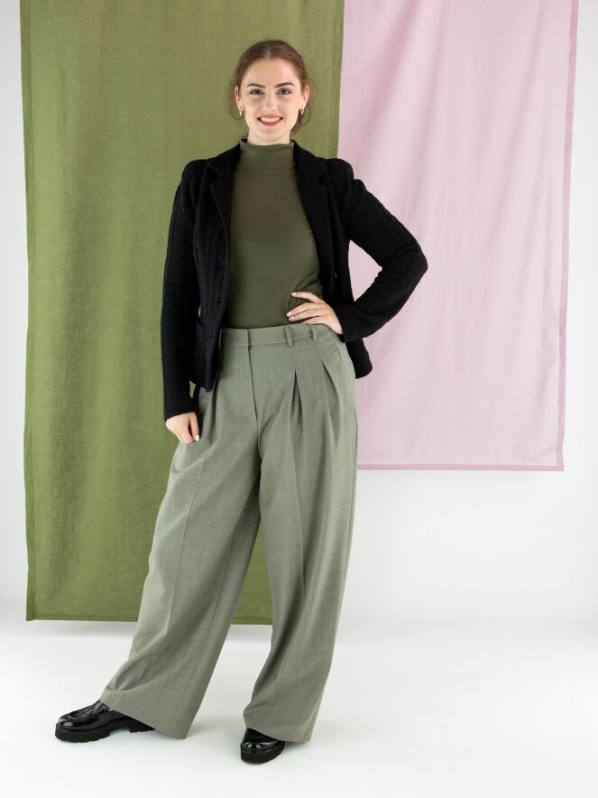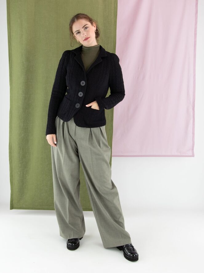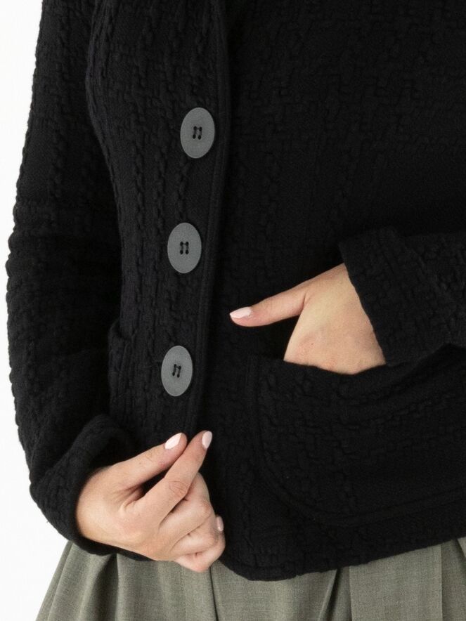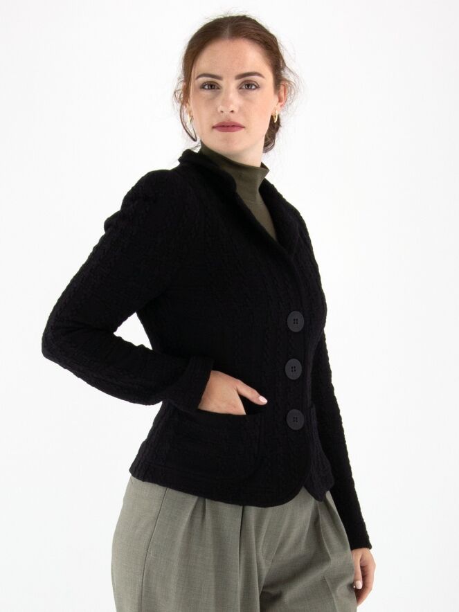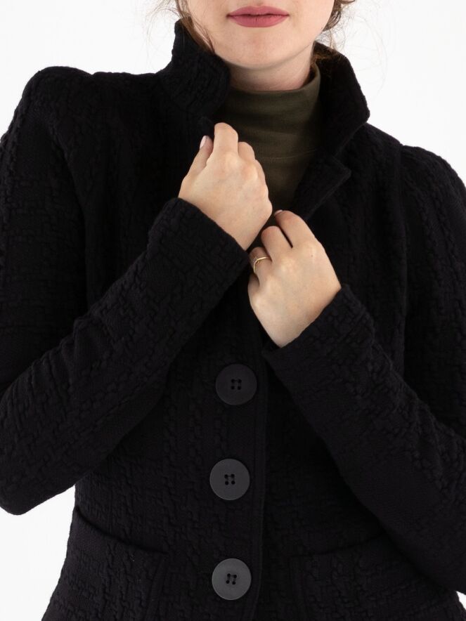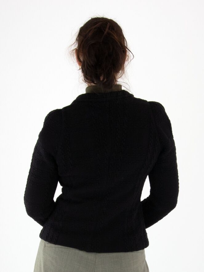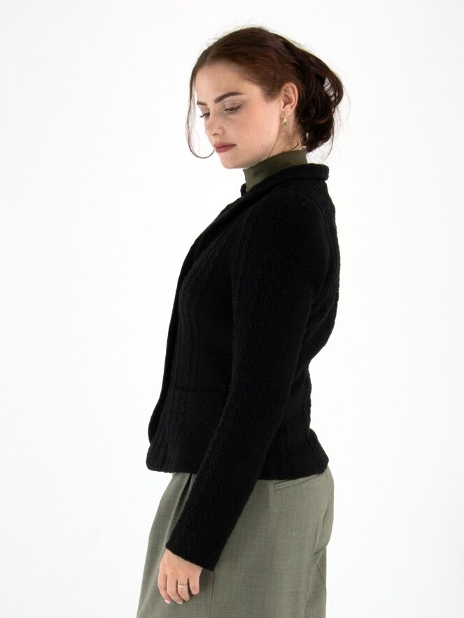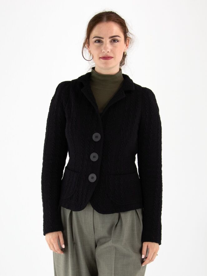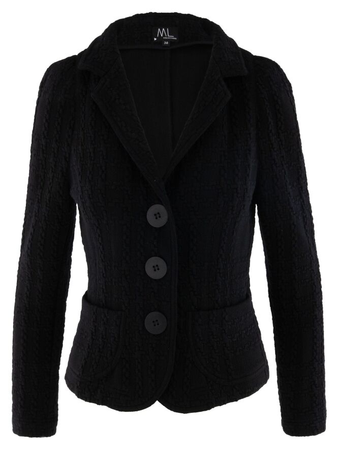 Blazer de la marque ML Collections en noir. Le tissu présente une structure en lignes verticales et horizontales et n’est pas doublé. La fermeture se fait par trois boutons. Ce blazer ne doit pas être lavé.