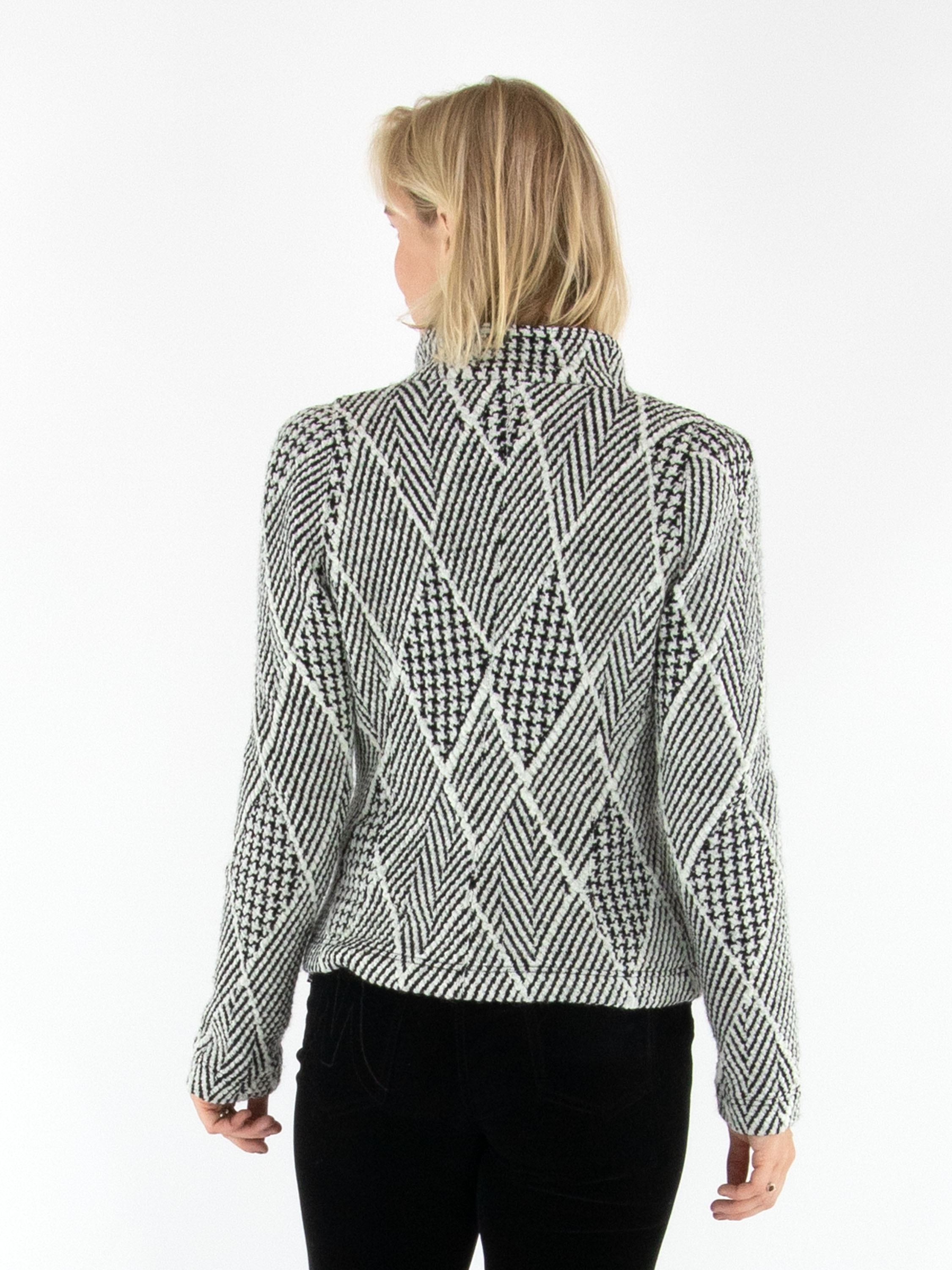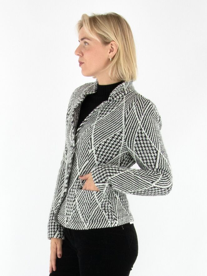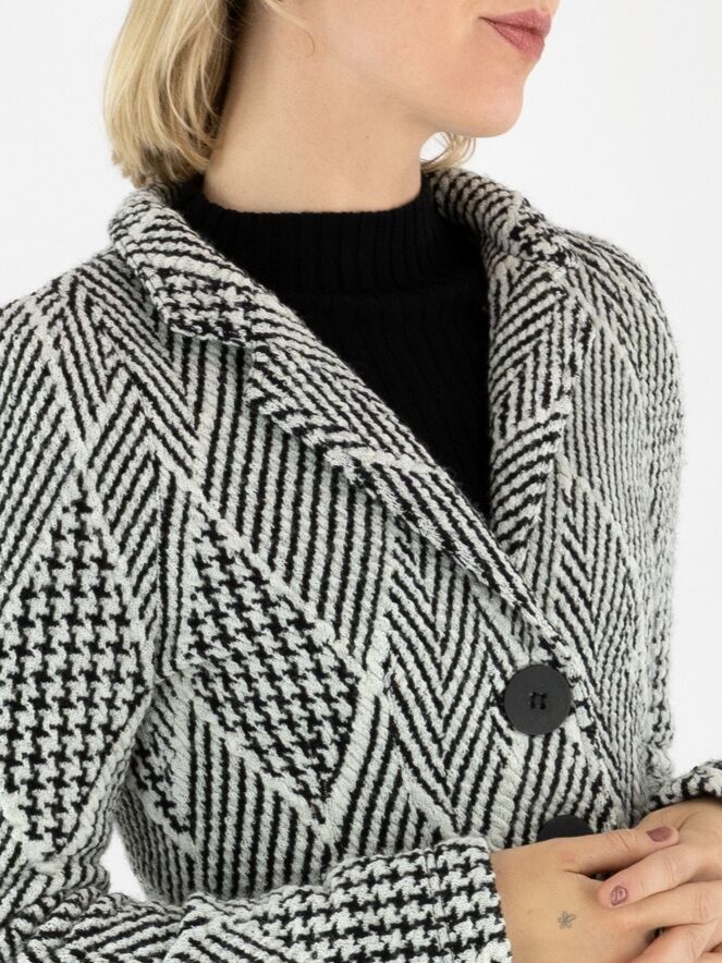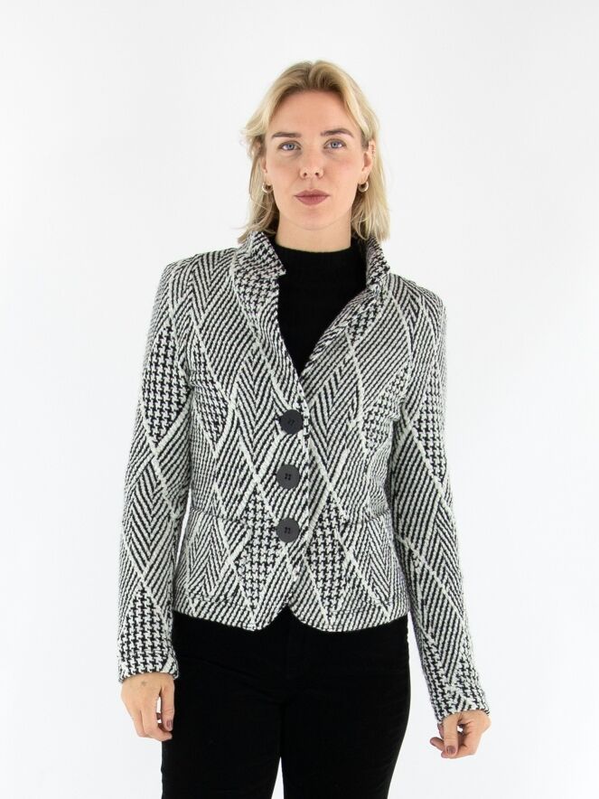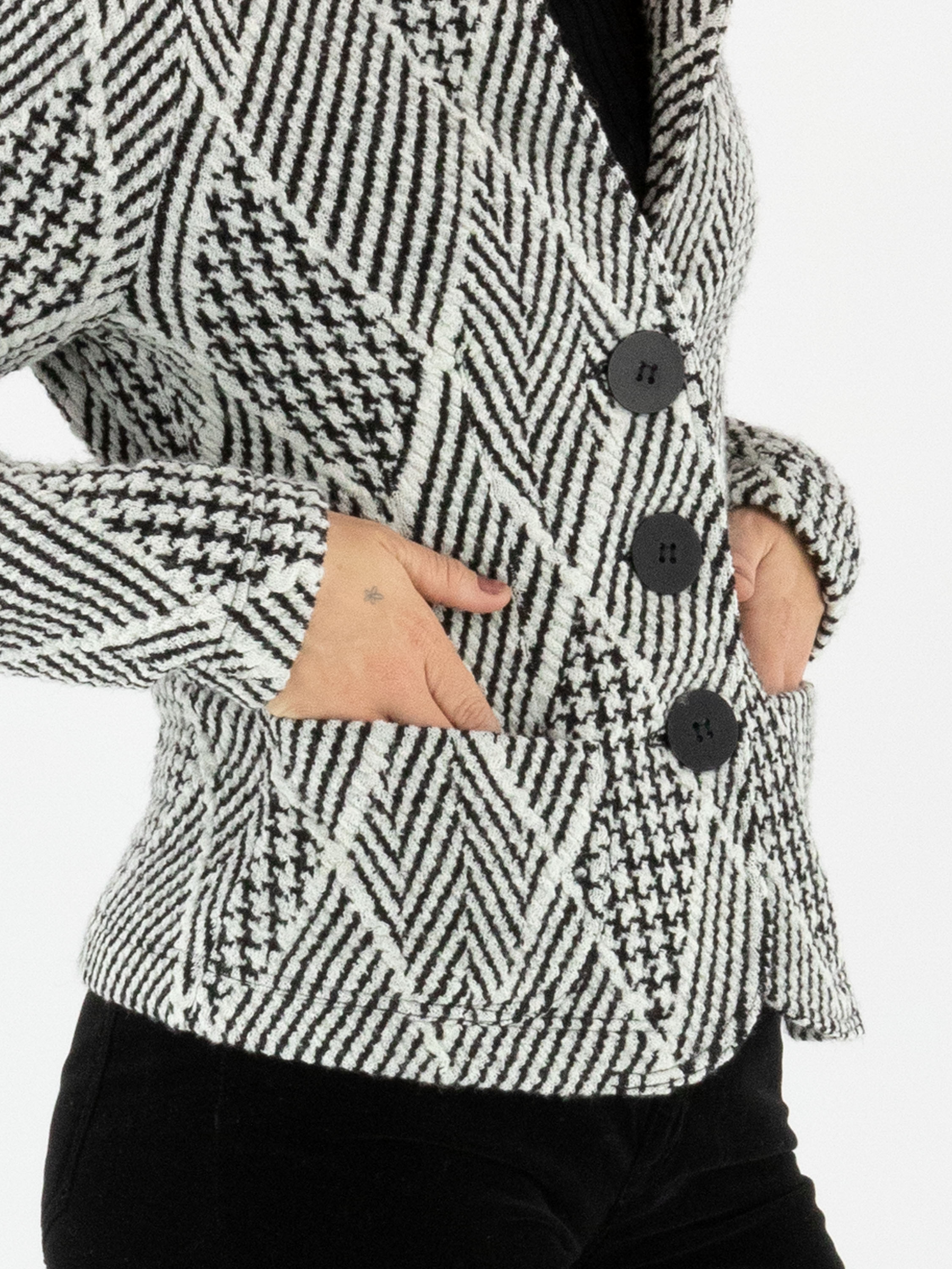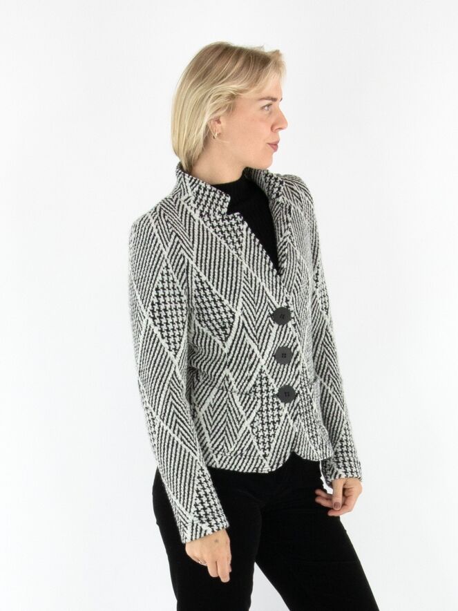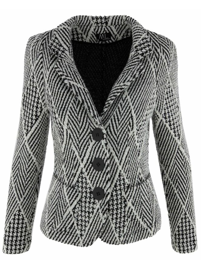 Un blazer de ML Collections réalisé dans un tissu aux multiples structures, comprenant un motif à chevrons, un pied-de-coq et un carreau. Les dessins sont déclinés en blanc cassé et noir, conférant au blazer une allure luxueuse et graphique. Le modèle se ferme par trois boutons et n’est pas doublé. Ce blazer ne doit pas être lavé.