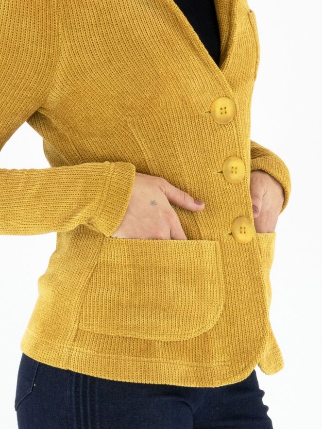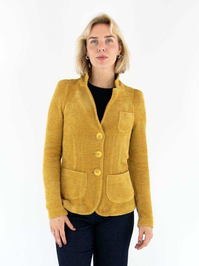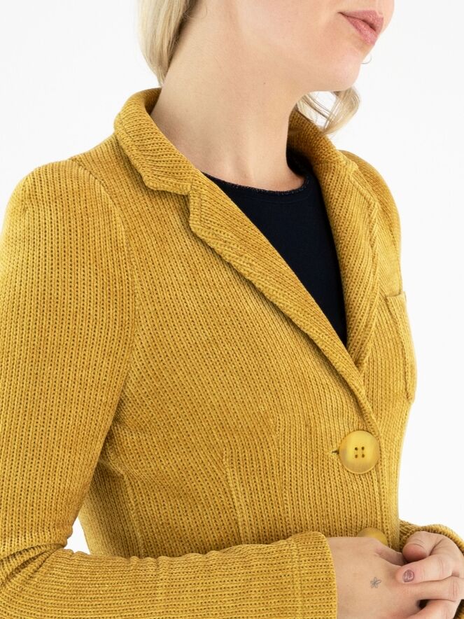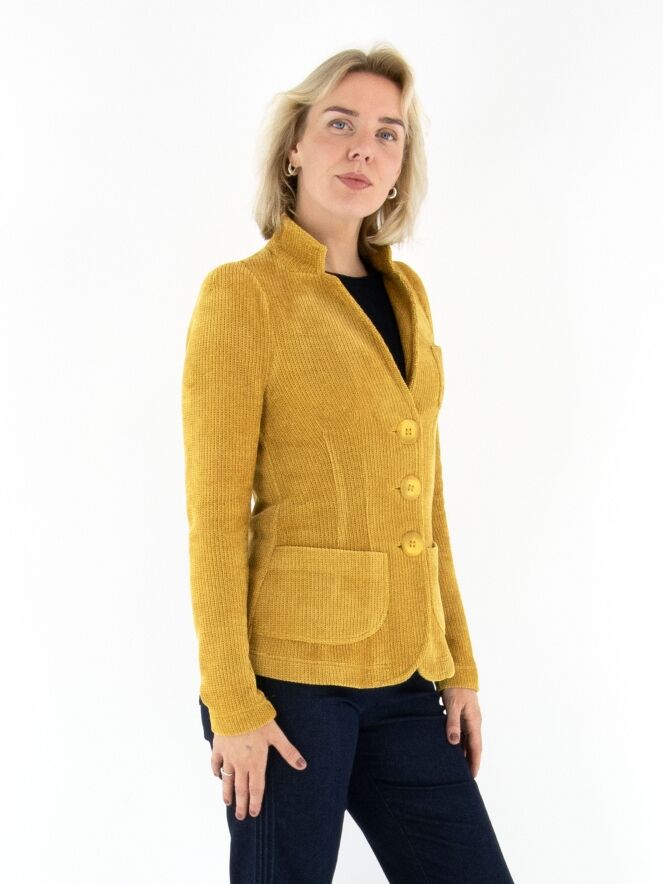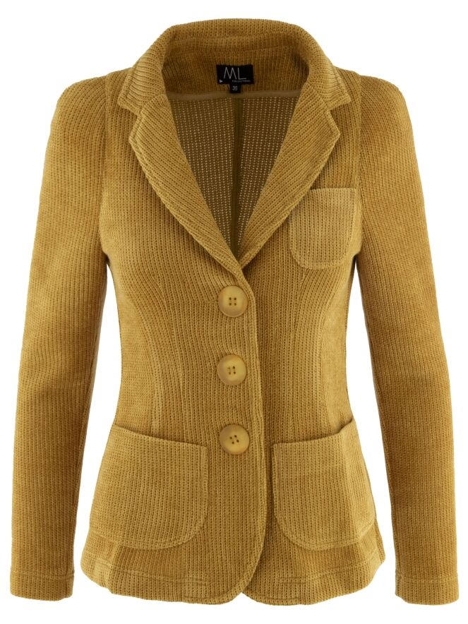 Blazer de ML Collections dans une élégante teinte ocre. Ce blazer féminin exclusif est confectionné en luxueux velours côtelé et non doublé, offrant une allure fluide et raffinée. Sa fermeture à trois boutons souligne une silhouette intemporelle et féminine. Pour préserver sa qualité haut de gamme, il est conseillé de ne pas laver ce blazer.
