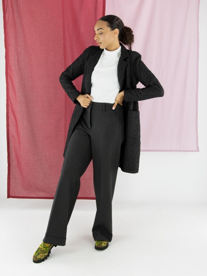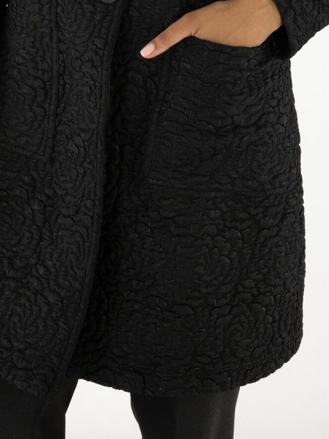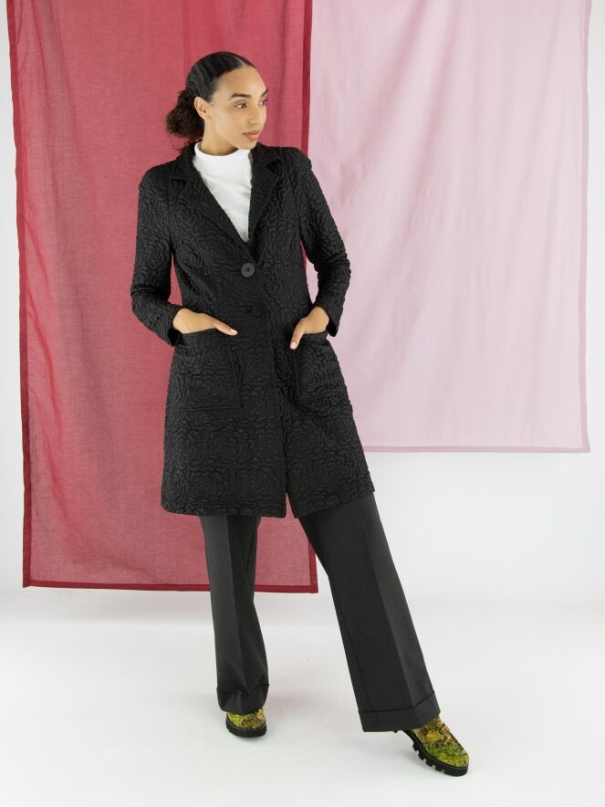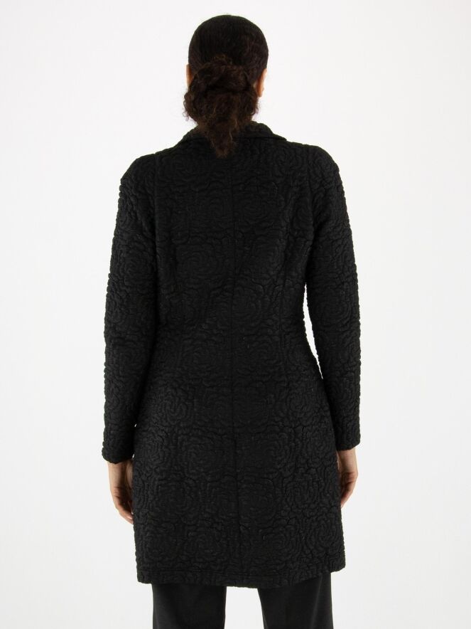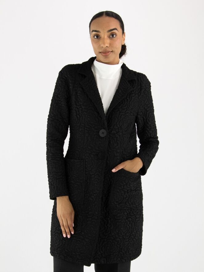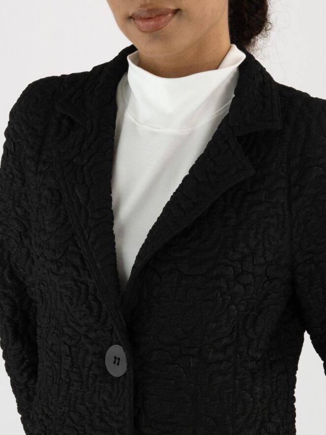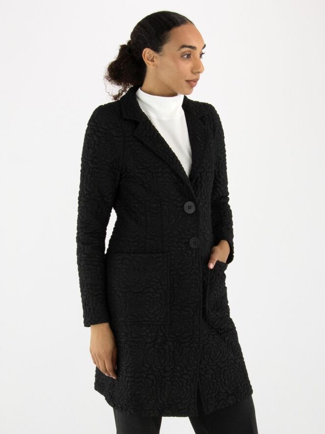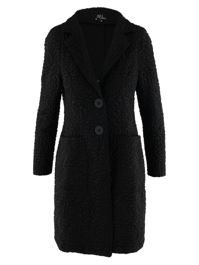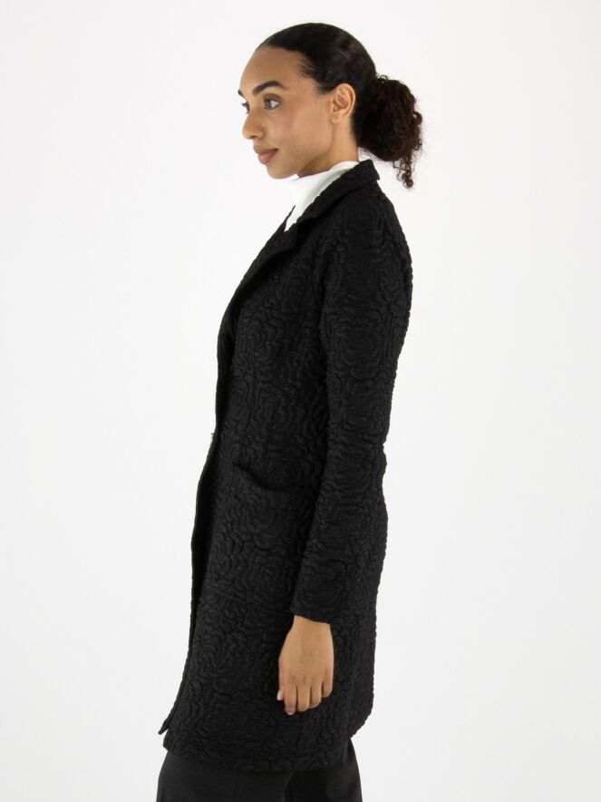 Blazer long de la marque ML Collections en noir. Le tissu est froncé. Il se ferme par deux boutons et n’est pas doublé. Ce blazer ne doit pas être lavé.