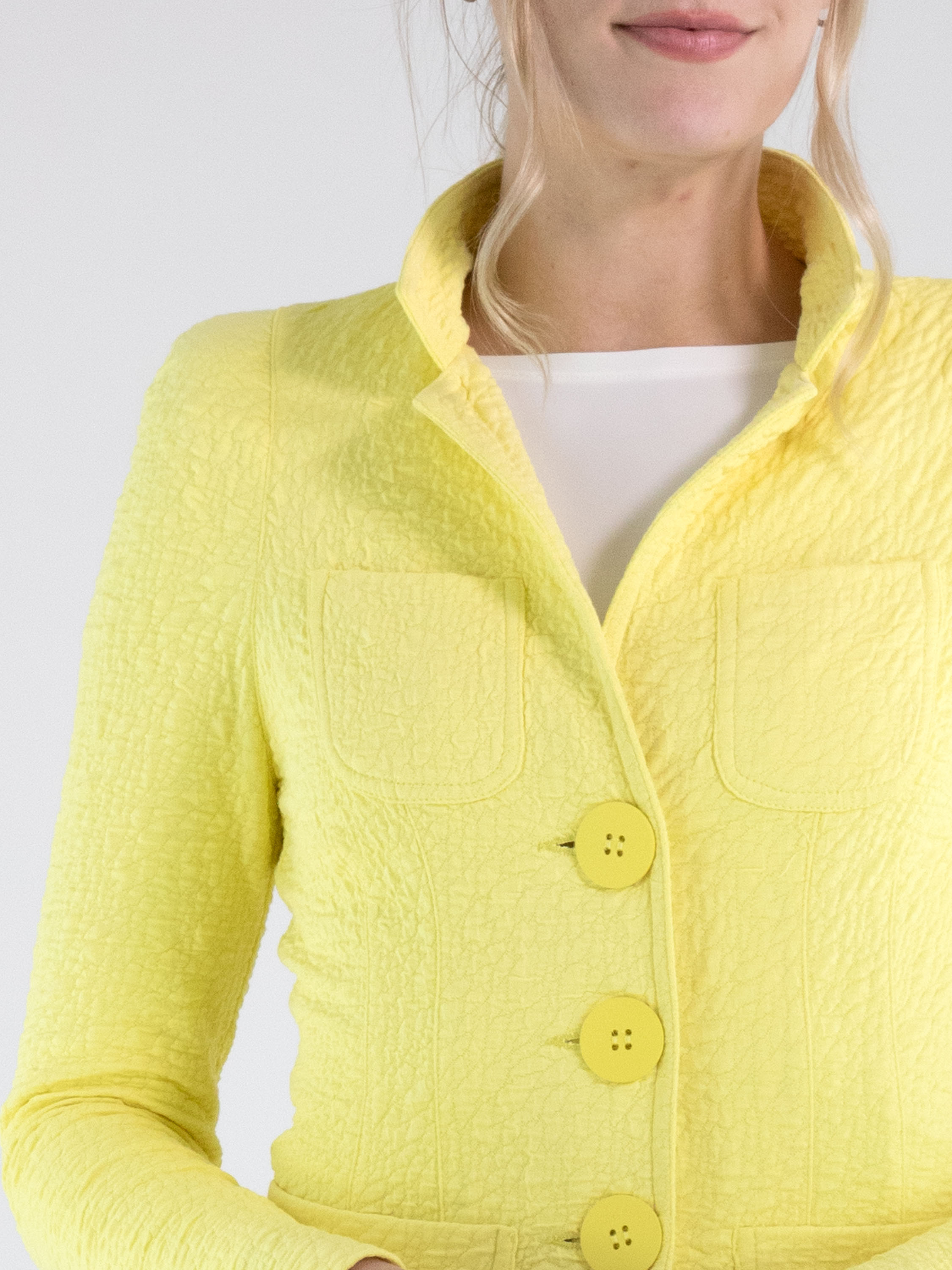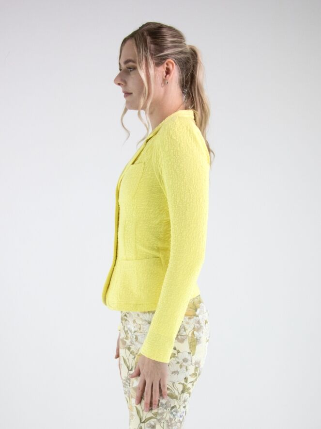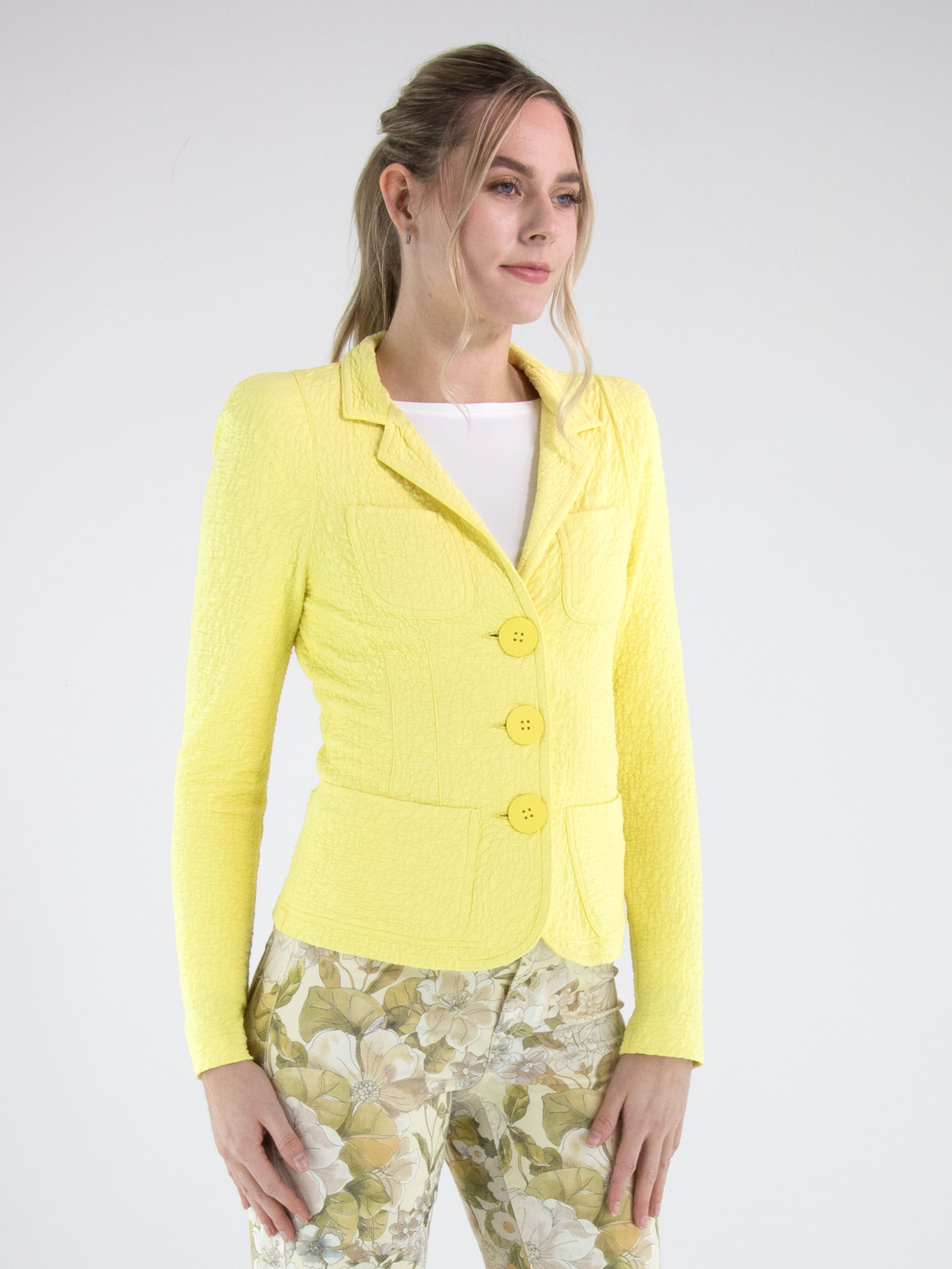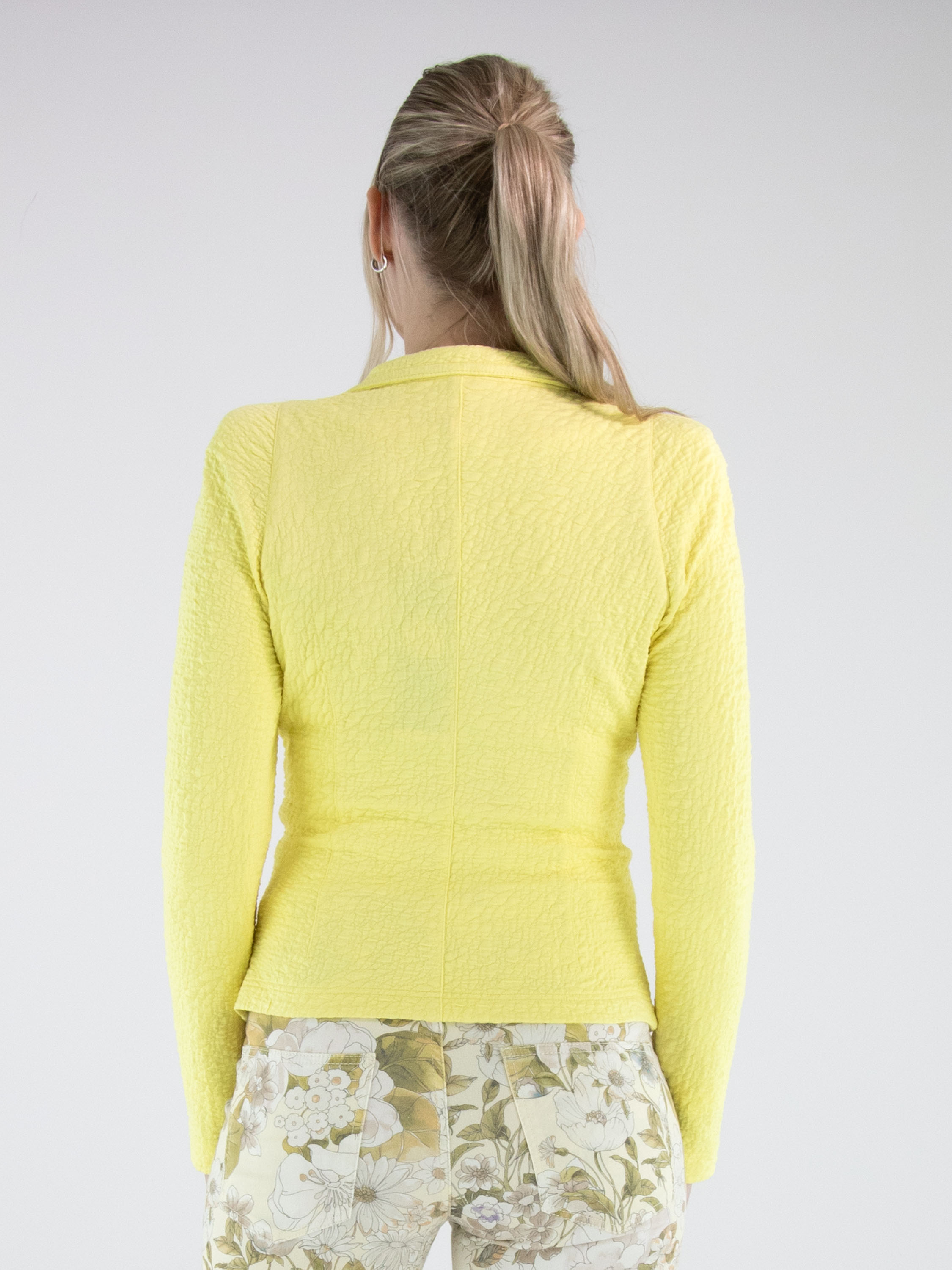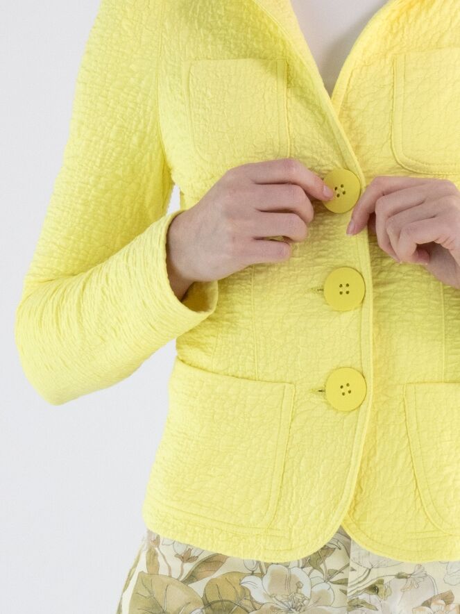 Blazer de ML Collections en tissu finement smocké dans une douce teinte jaune pastel. La texture délicate apporte une touche à la fois ludique et raffinée au modèle. Fermé par trois boutons et conçu sans doublure, il offre une tombée légère et fluide. Ce blazer ne doit pas être lavé.