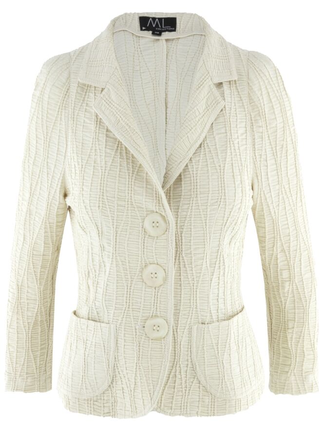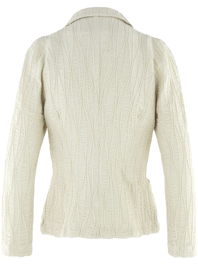Un blazer de ML Collections en beige. Le tissu est smocké horizontalement, avec des lignes verticales ondulées superposées. Le blazer est doté d’une fermeture à trois boutons et n’est pas doublé. Ce blazer ne doit pas être lavé.
