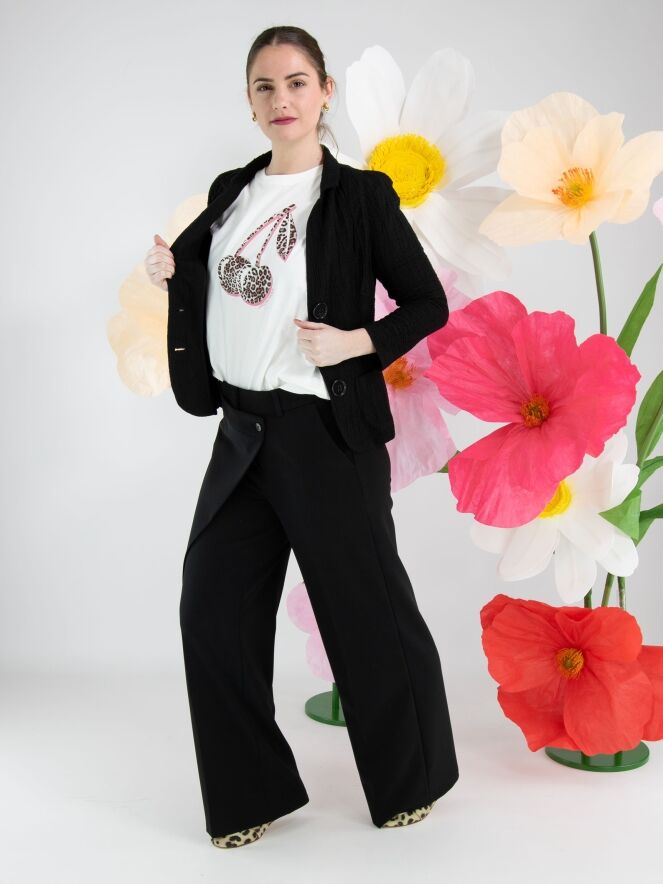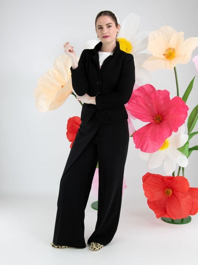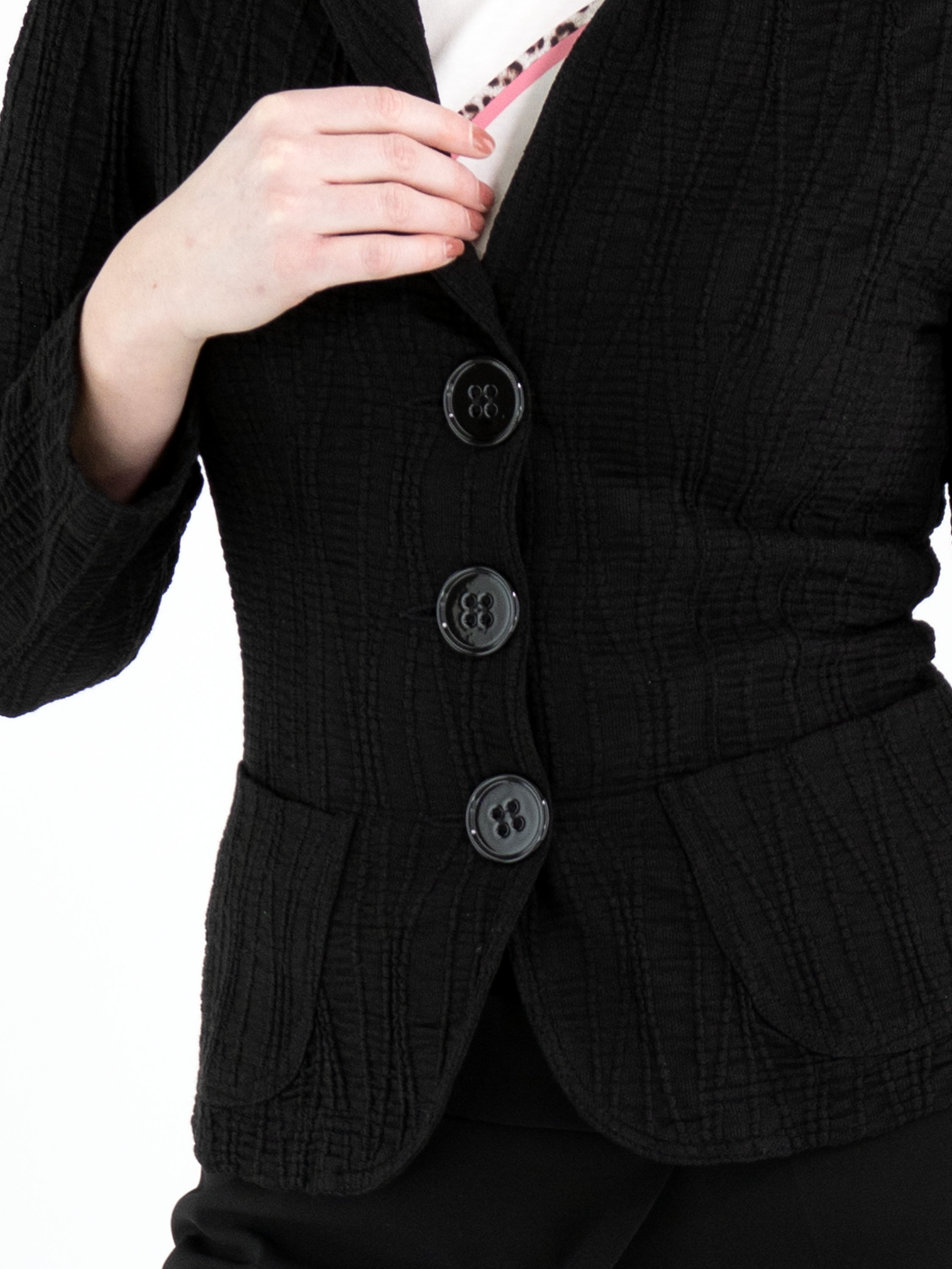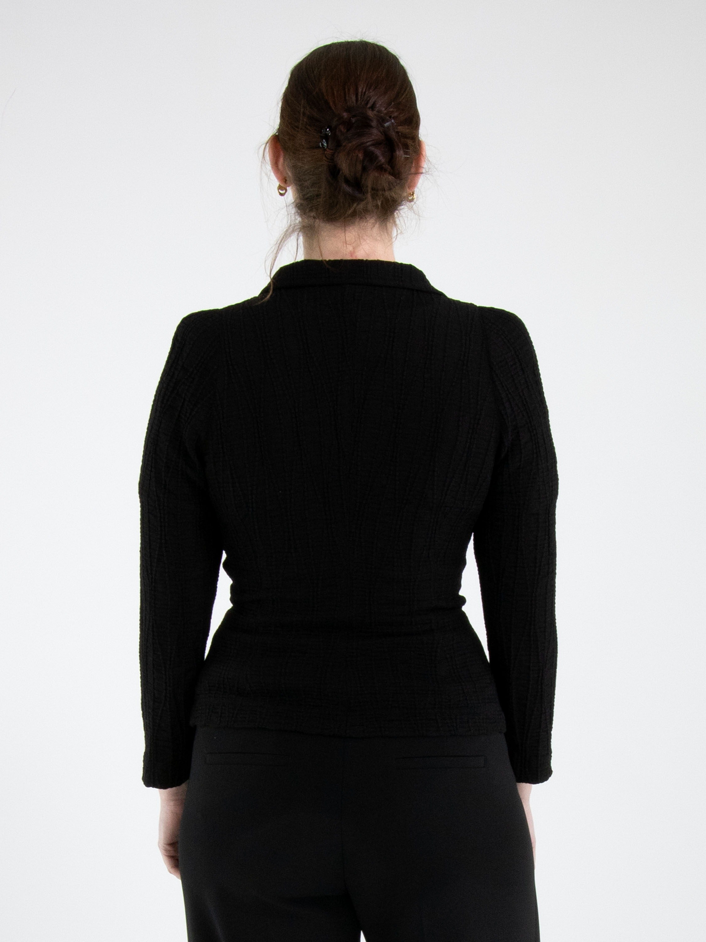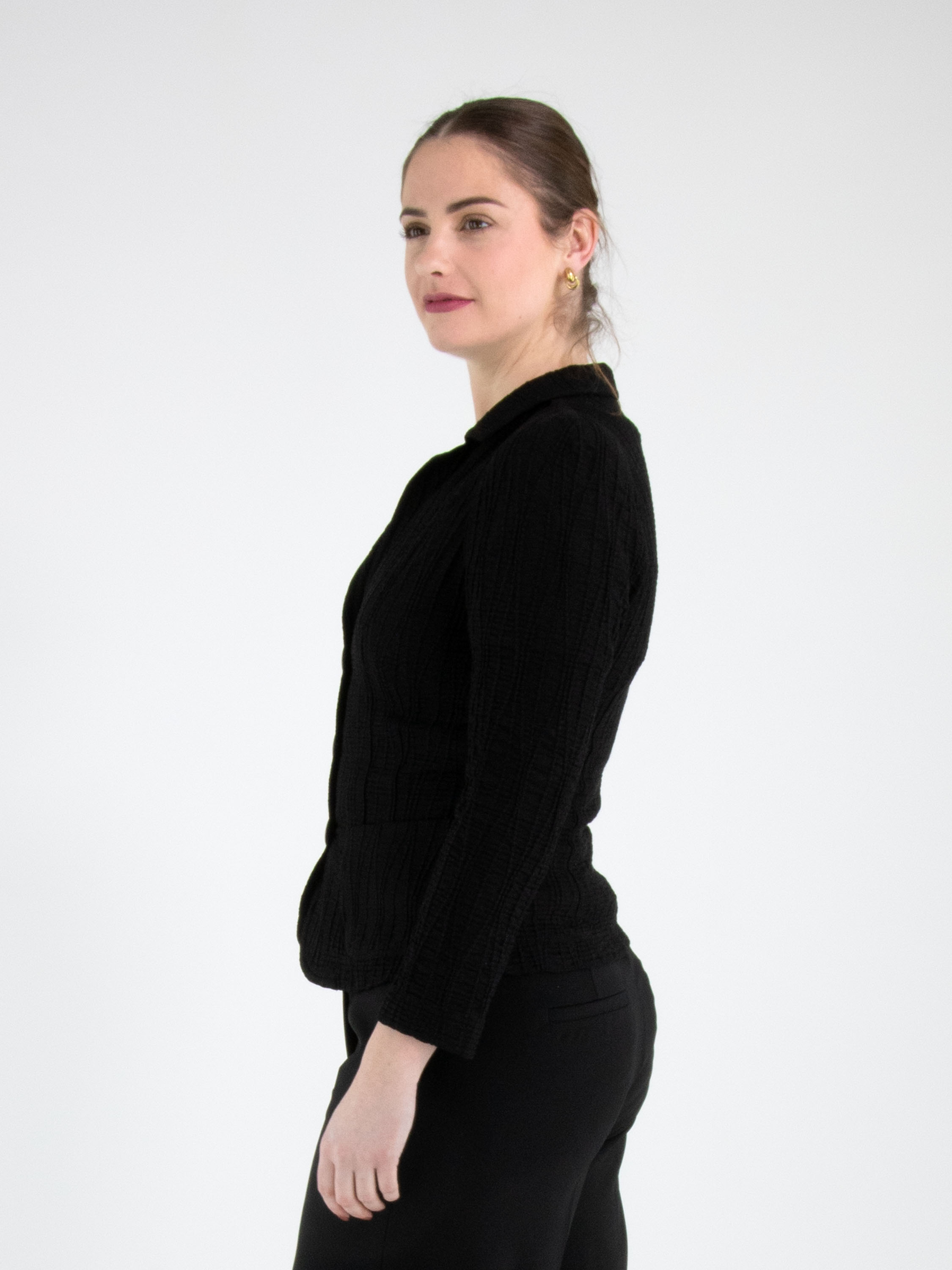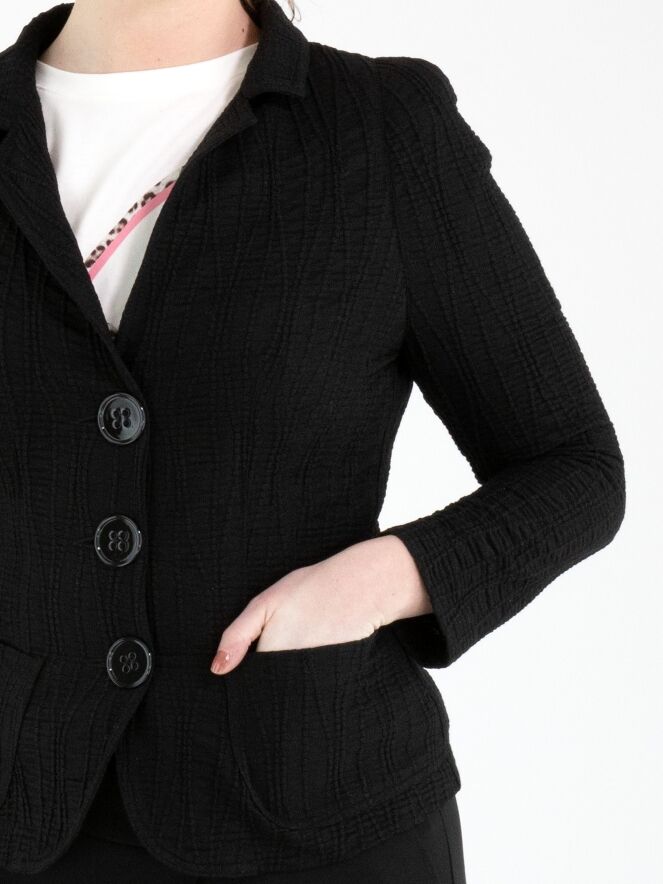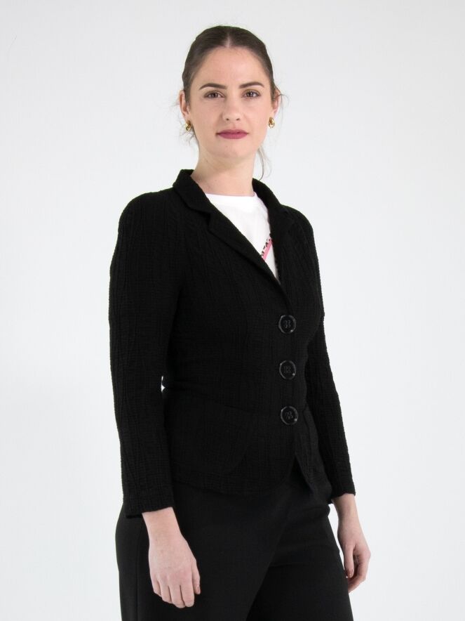 Un blazer de ML Collections en noir. Le tissu est smocké horizontalement, avec par-dessus des lignes verticales ondulantes. Le blazer est doté d’une fermeture à trois boutons et n’est pas doublé. Ce blazer ne doit pas être lavé.