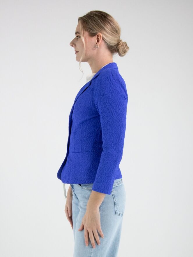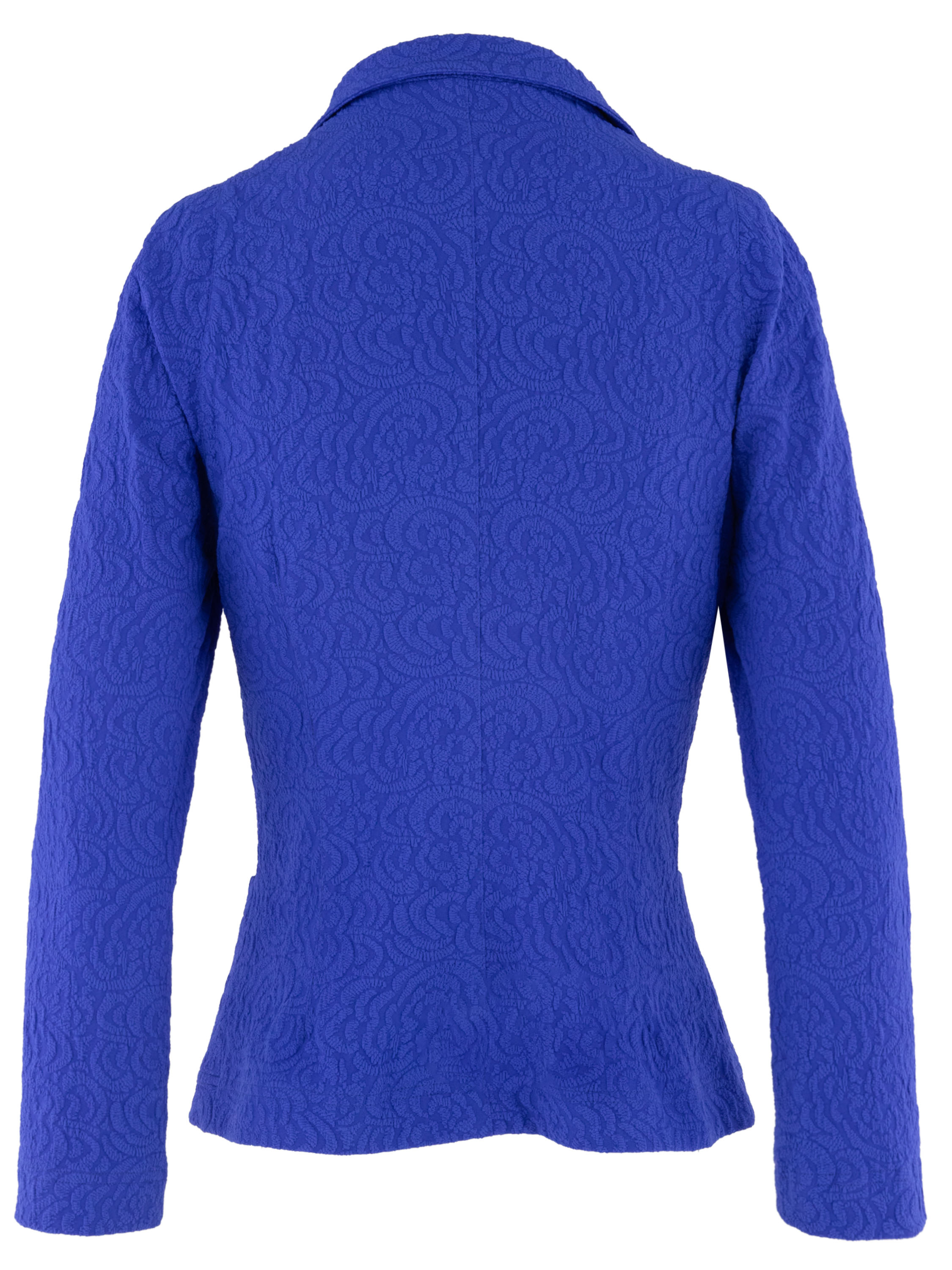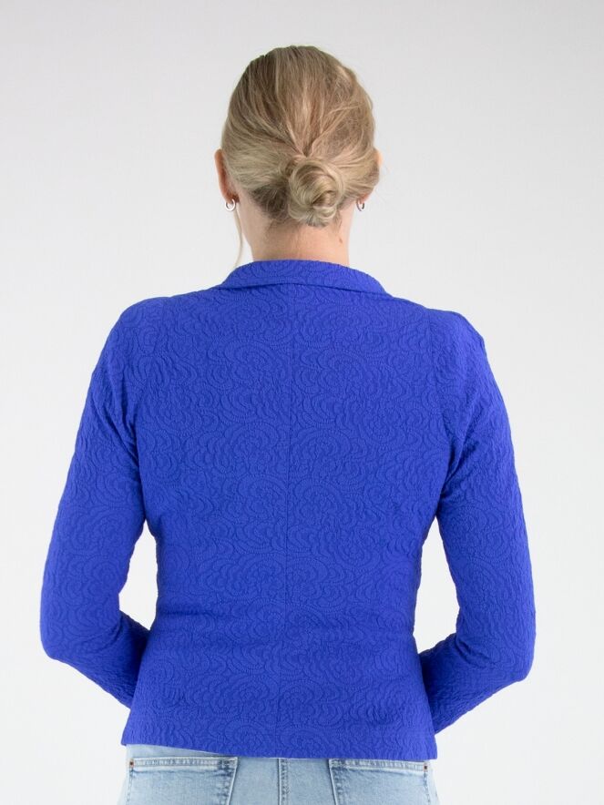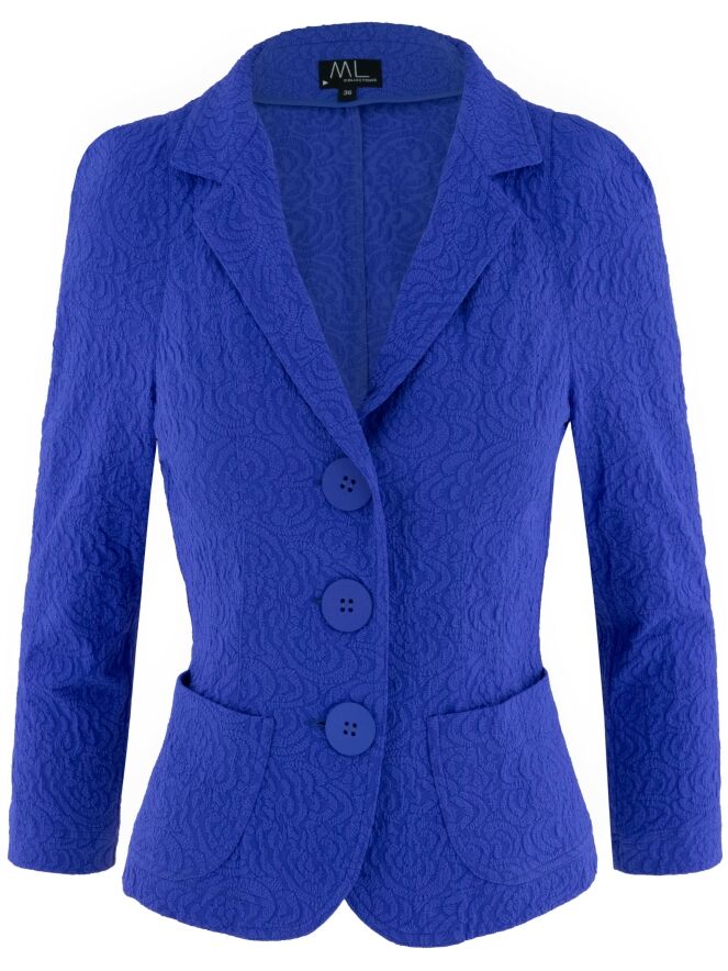Blazer de ML Collections dans une teinte cobalt intense. Le tissu présente un jacquard en relief ton sur ton, apportant profondeur et raffinement au modèle. Fermé par trois boutons et conçu sans doublure, il offre une tombée légère et fluide. Ce blazer ne doit pas être lavé.
