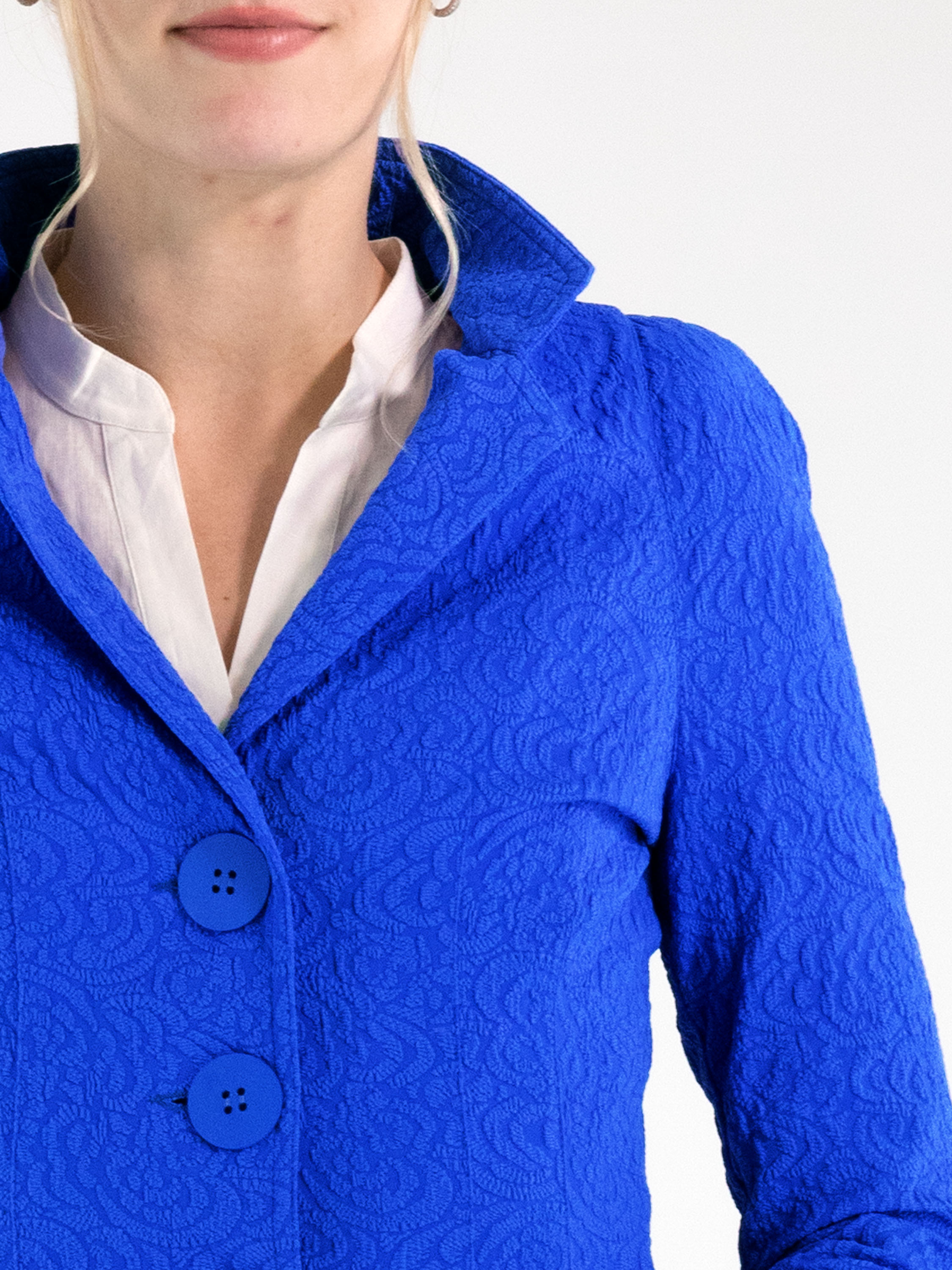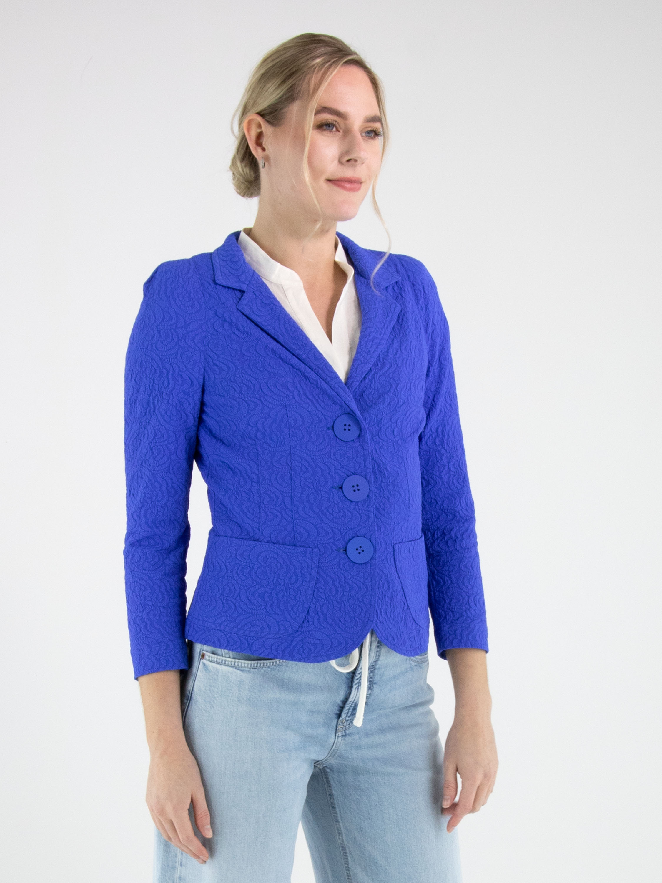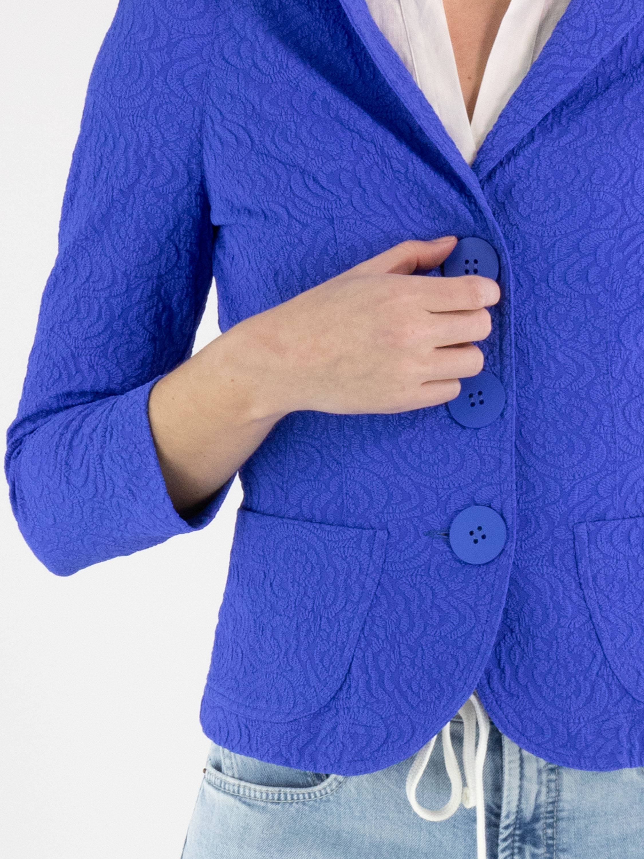 Blazer de ML Collections dans une teinte cobalt intense. Le tissu présente un jacquard en relief ton sur ton, apportant profondeur et raffinement au modèle. Fermé par trois boutons et conçu sans doublure, il offre une tombée légère et fluide. Ce blazer ne doit pas être lavé.
