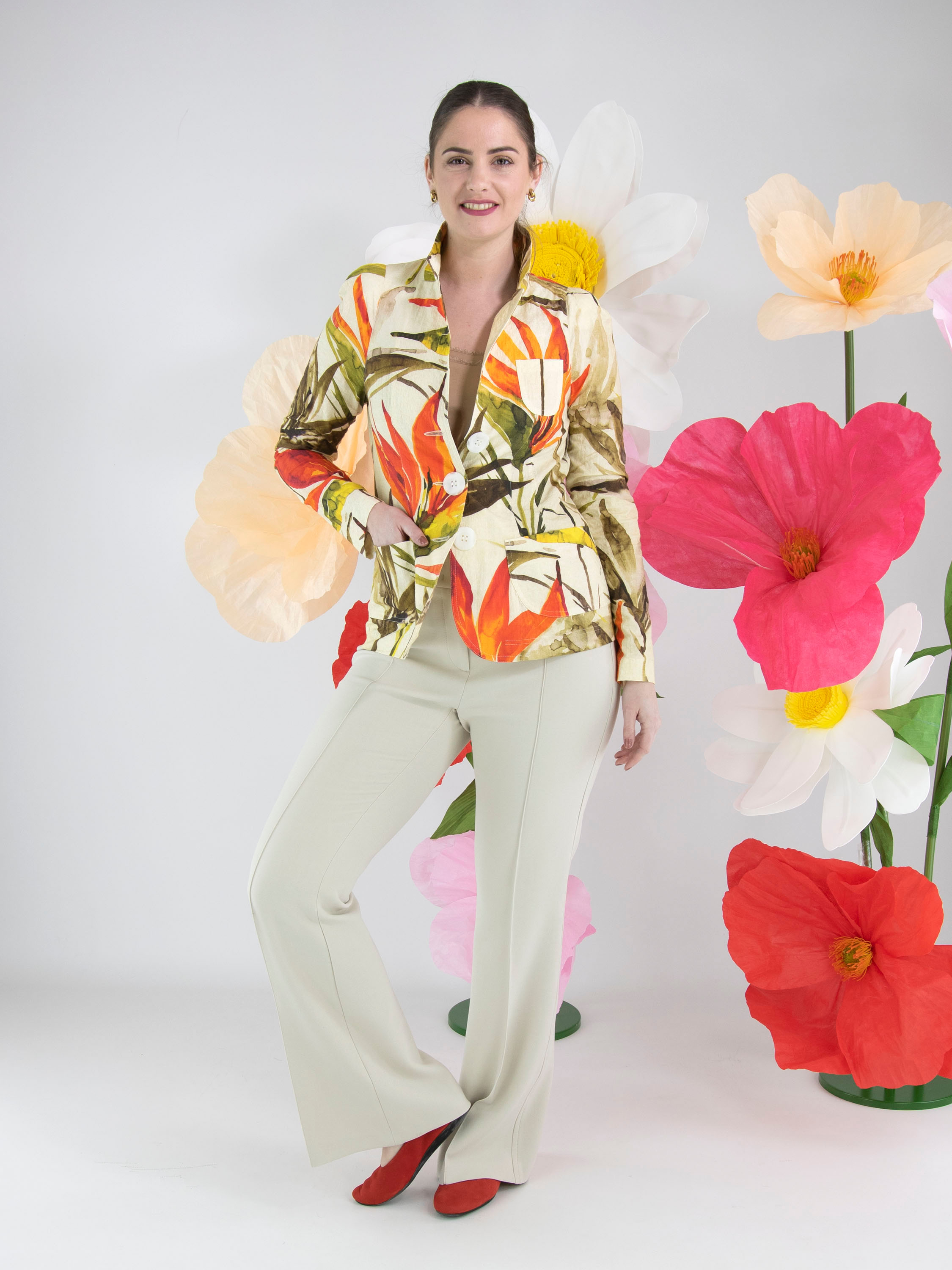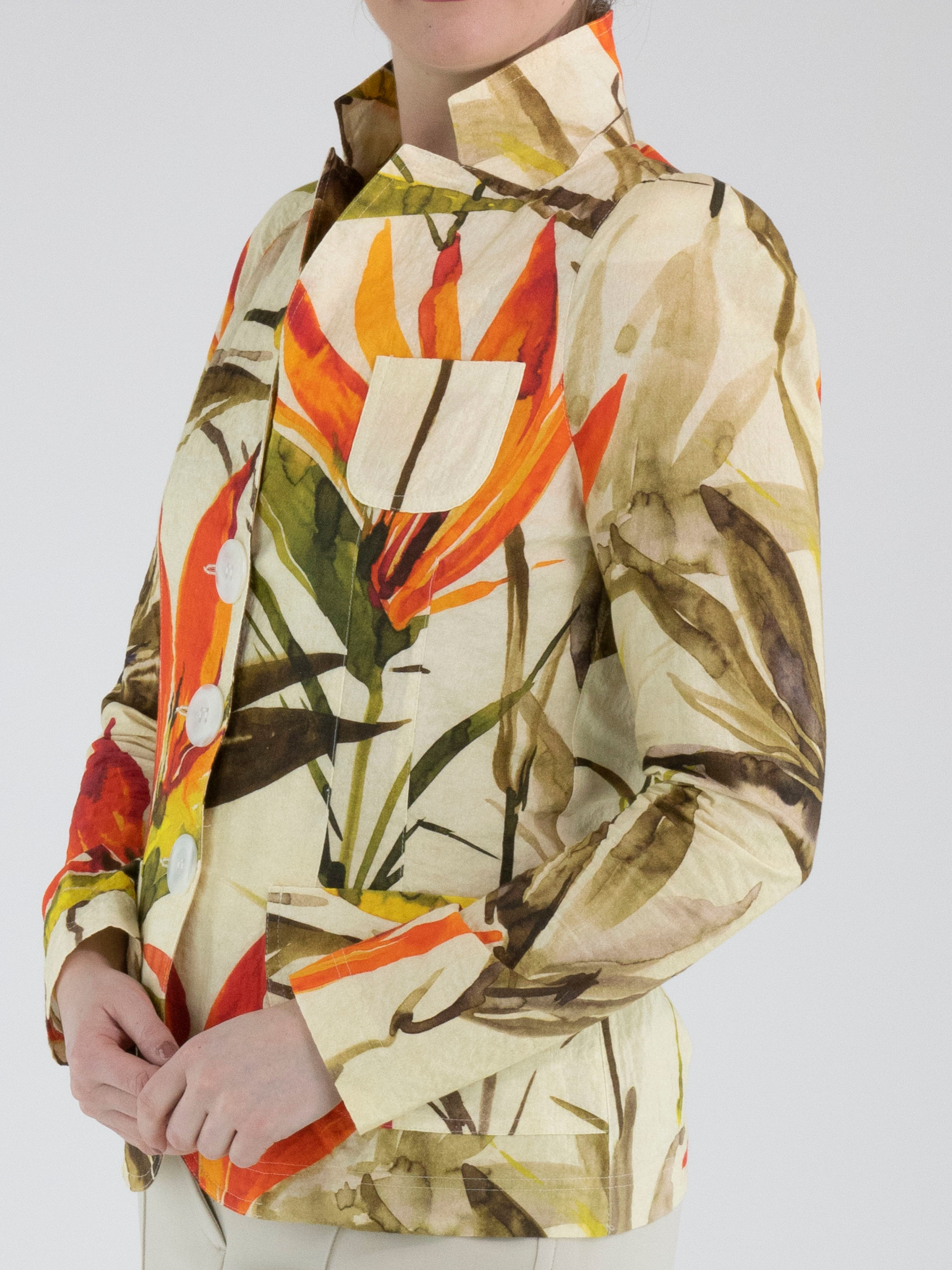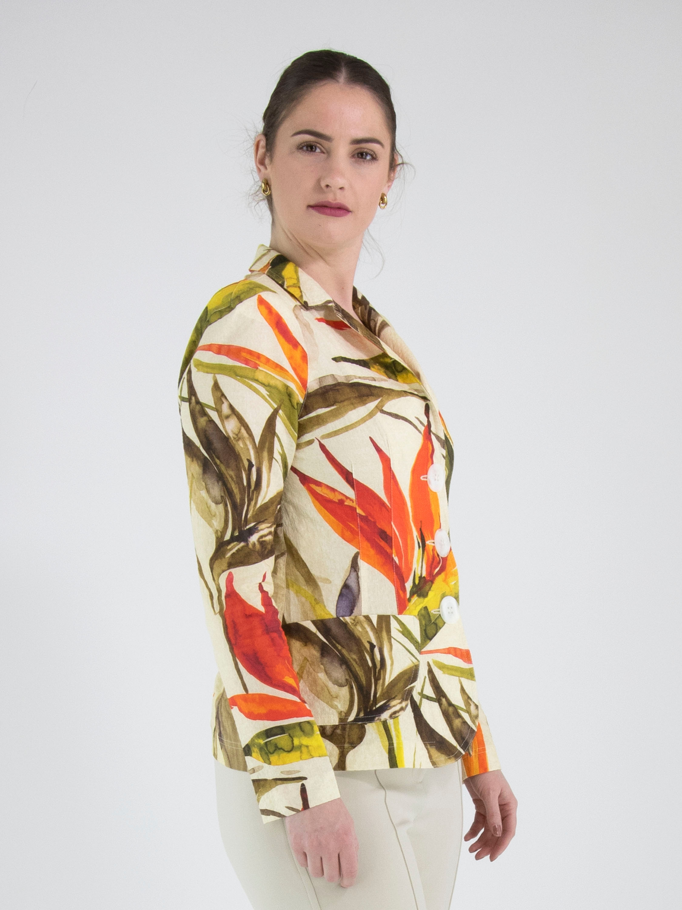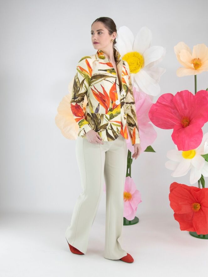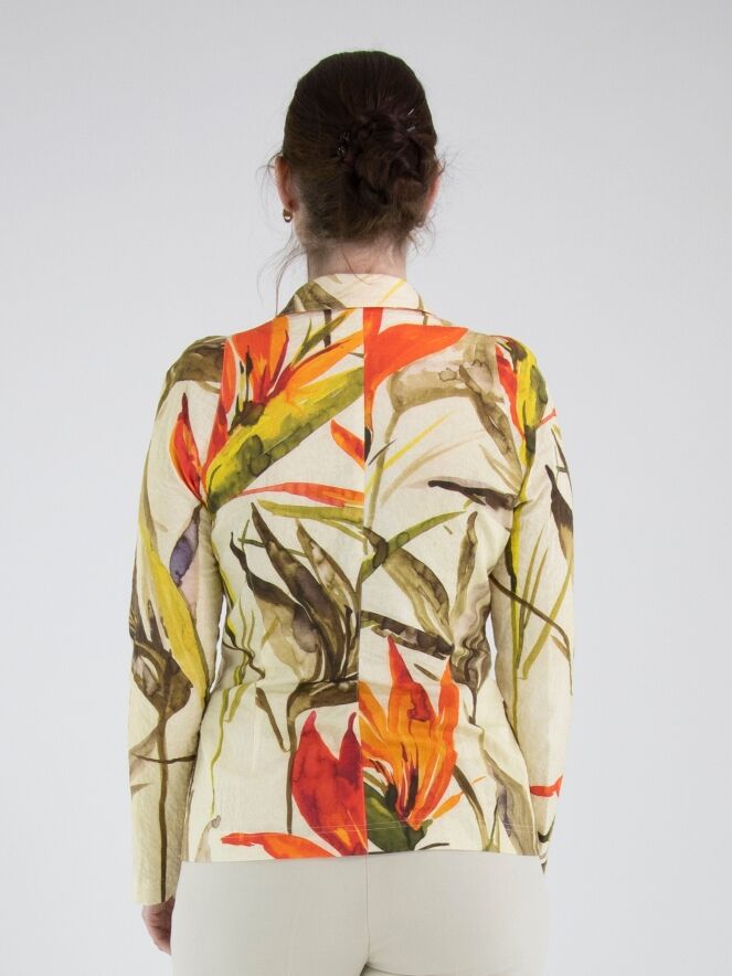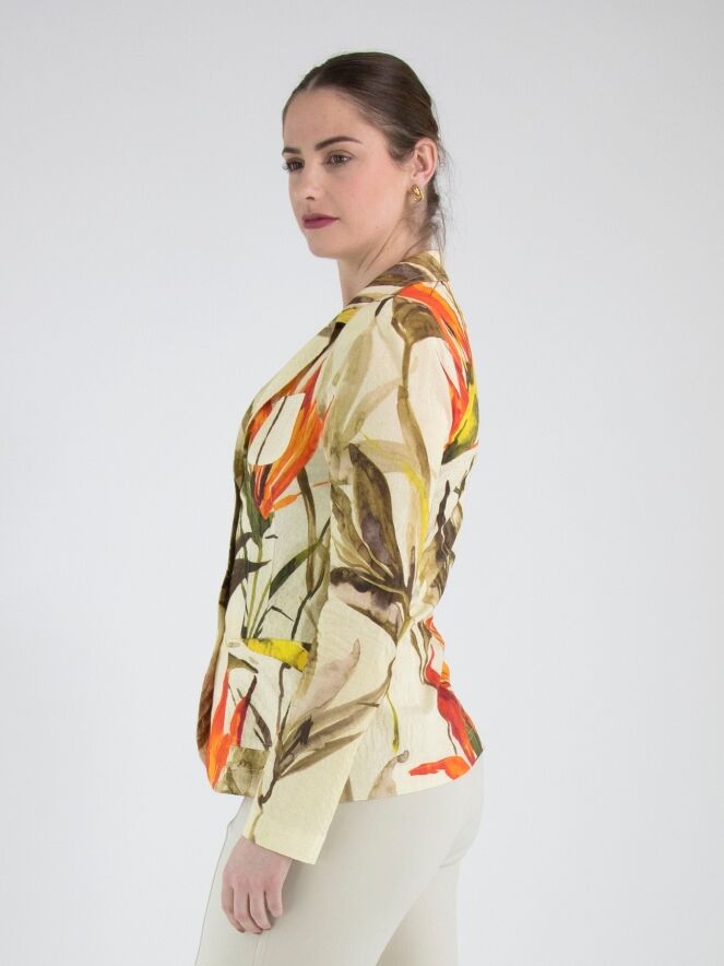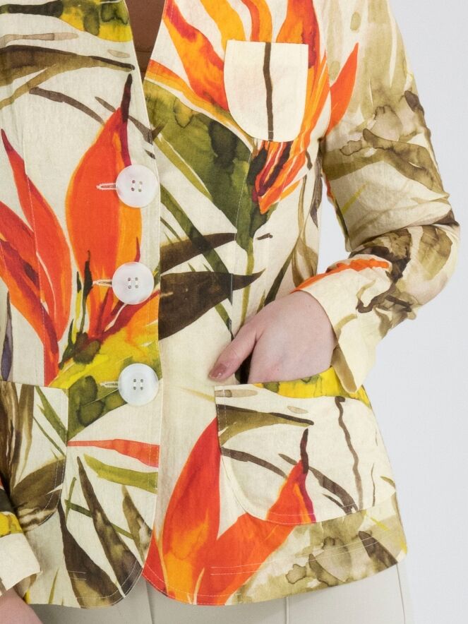 Un blazer de ML Collections avec un imprimé de fleurs et de feuilles dans les tons rouge, orange et plusieurs nuances de vert sur un fond beige. Le blazer est doté d’une fermeture à trois boutons et n’est pas doublé. Ce blazer ne doit pas être lavé.