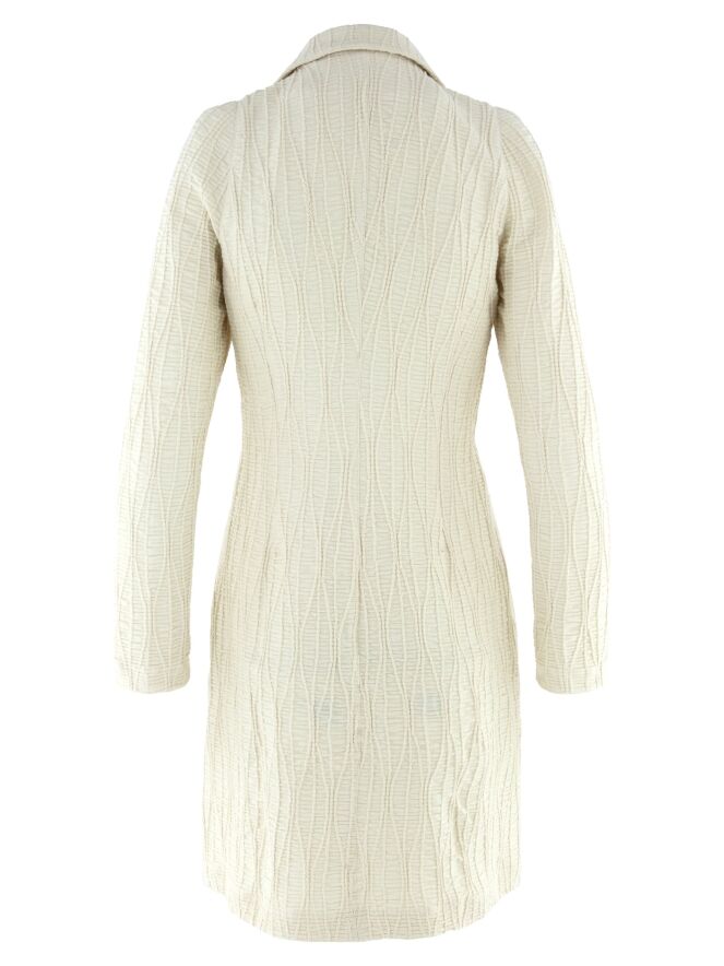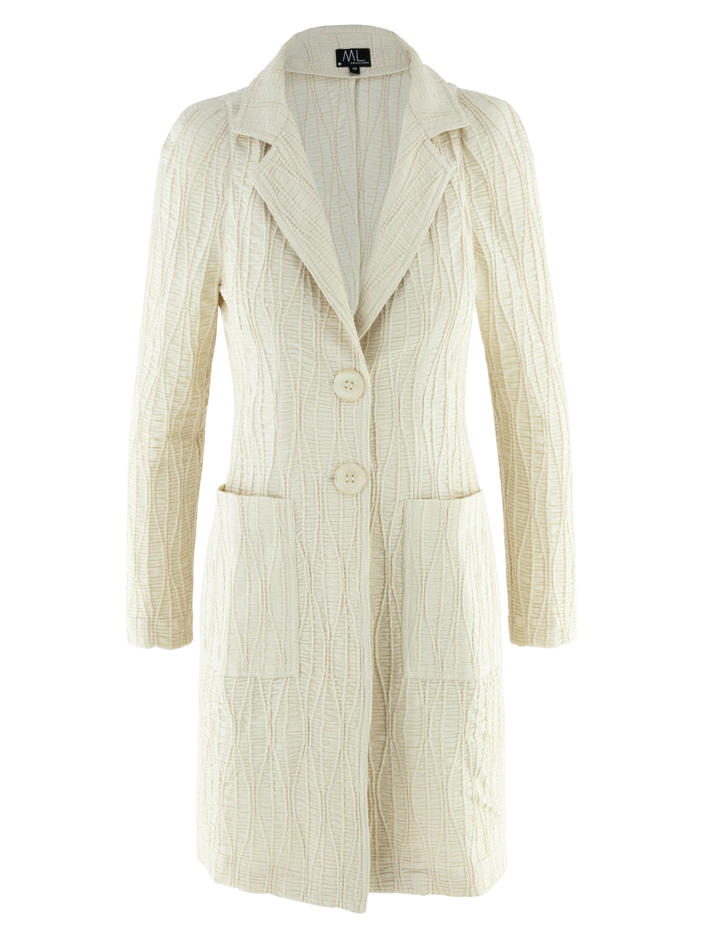 Un blazer long de ML Collections en beige. Le tissu est smocké horizontalement, rehaussé de lignes verticales ondulées. Le blazer est doté d’une fermeture à deux boutons et n’est pas doublé. Ce blazer ne doit pas être lavé.