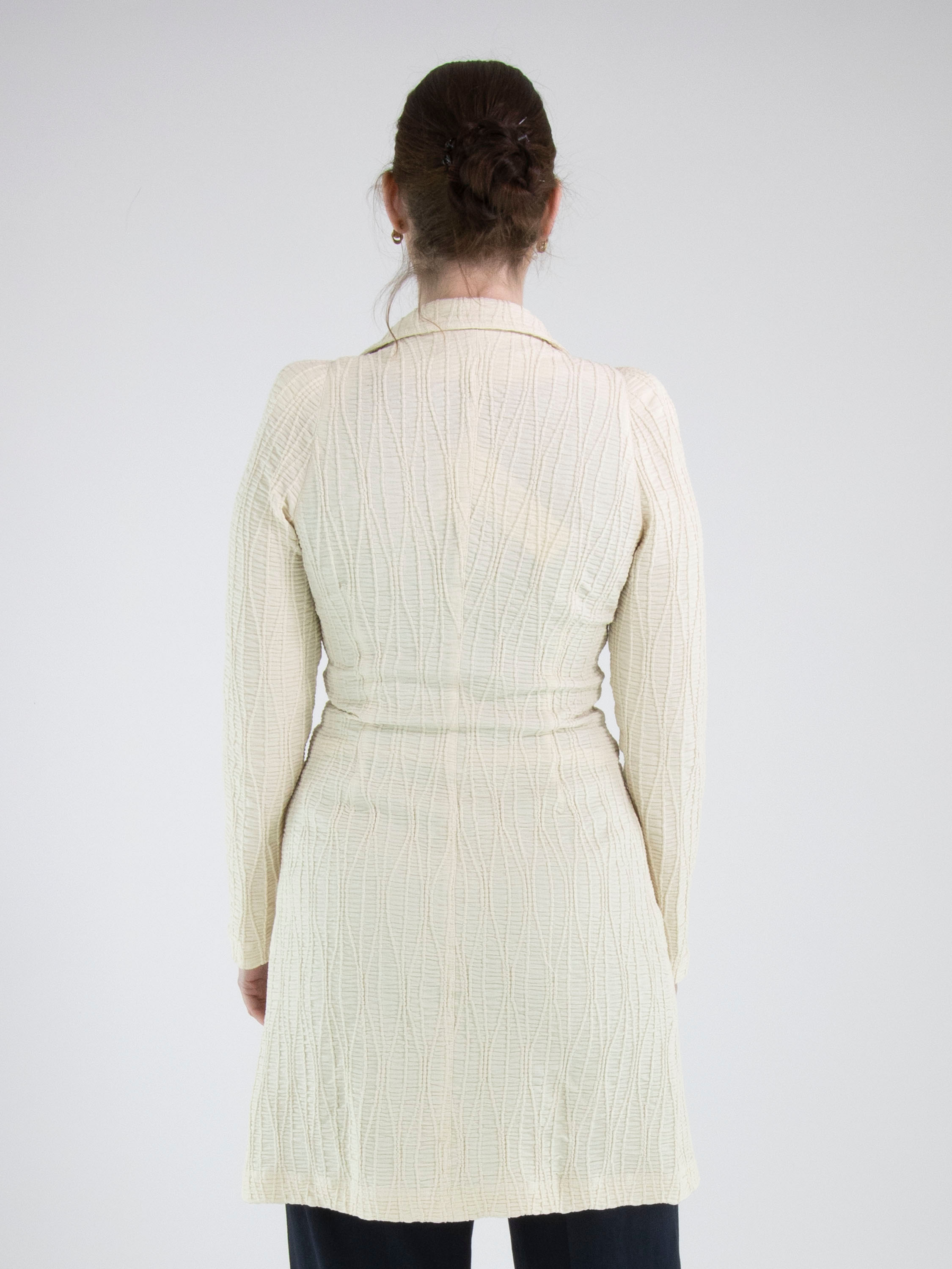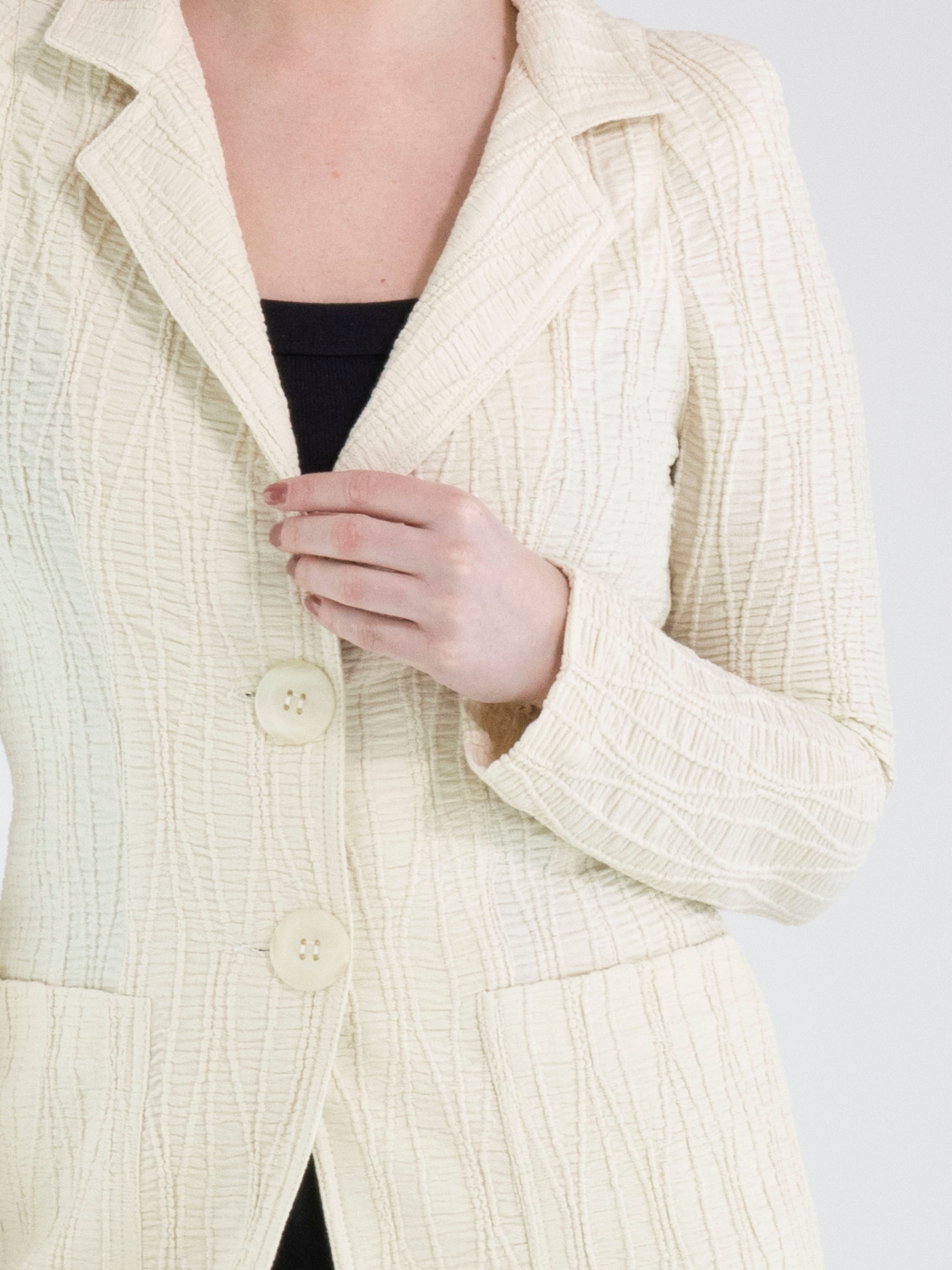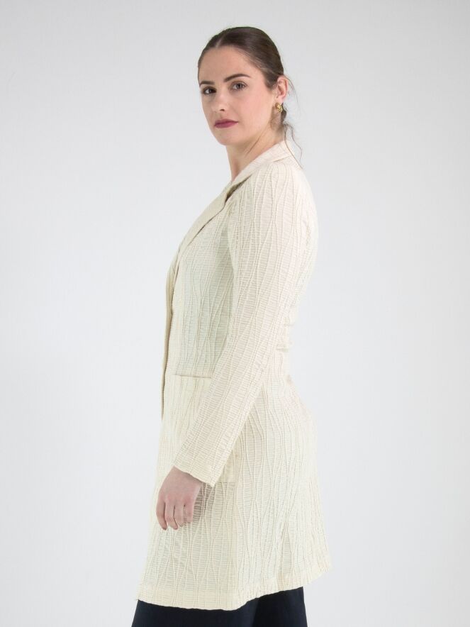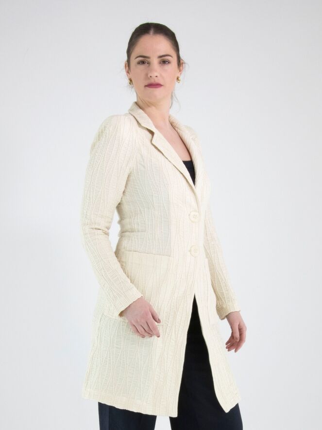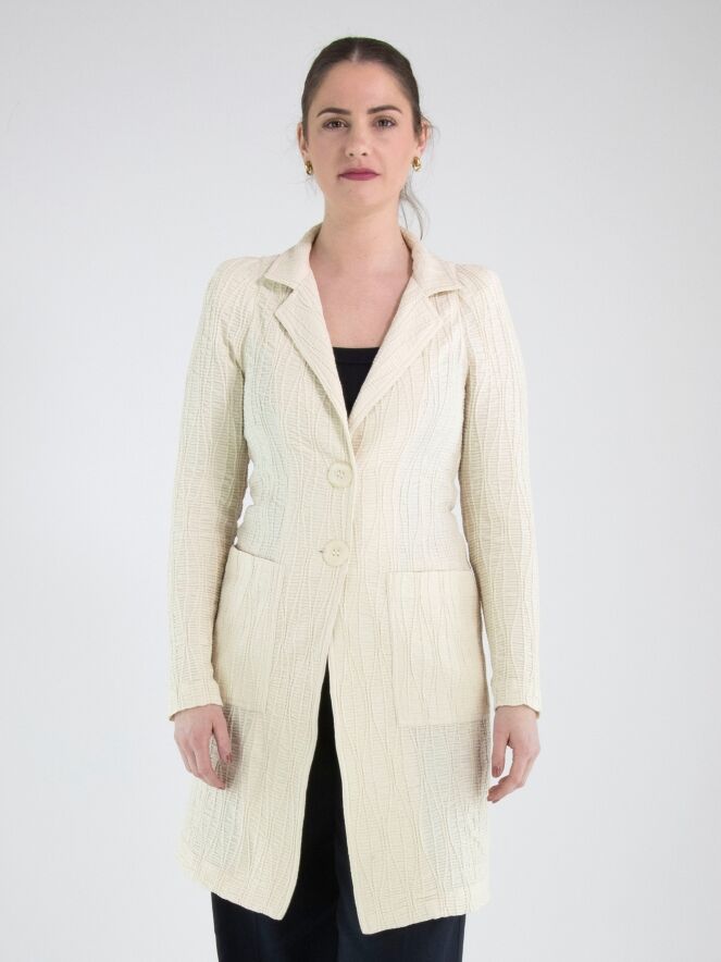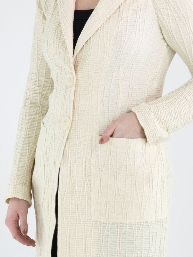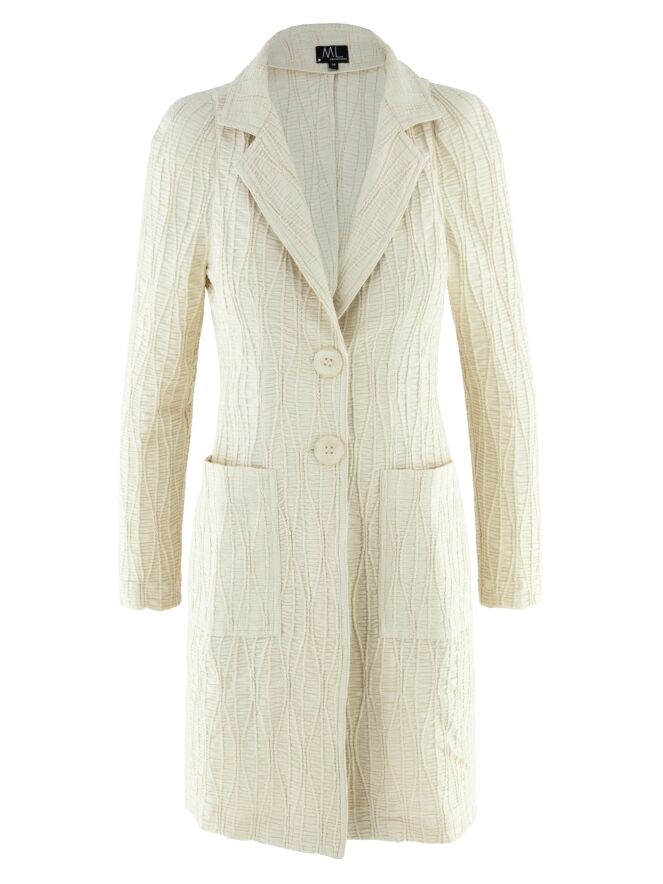 Un blazer long de ML Collections en beige. Le tissu est smocké horizontalement, rehaussé de lignes verticales ondulées. Le blazer est doté d’une fermeture à deux boutons et n’est pas doublé. Ce blazer ne doit pas être lavé.