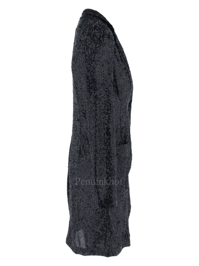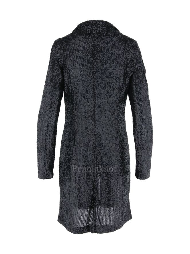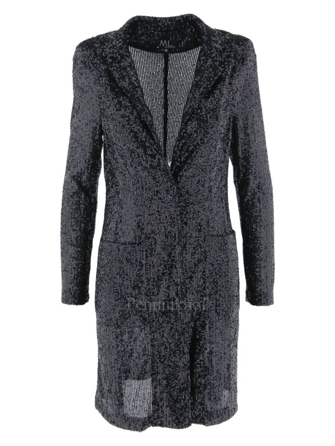 Luxueuse veste longue de la marque ML Collections, de couleur noire. La veste est transparente et entièrement recouverte de paillettes. Elle ferme à l'aide de 2 boutons pression et est dotée de 2 poches plaquées à l'avant. Lavage déconseillé.