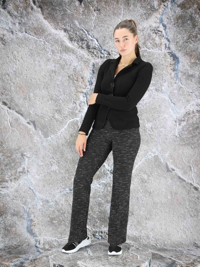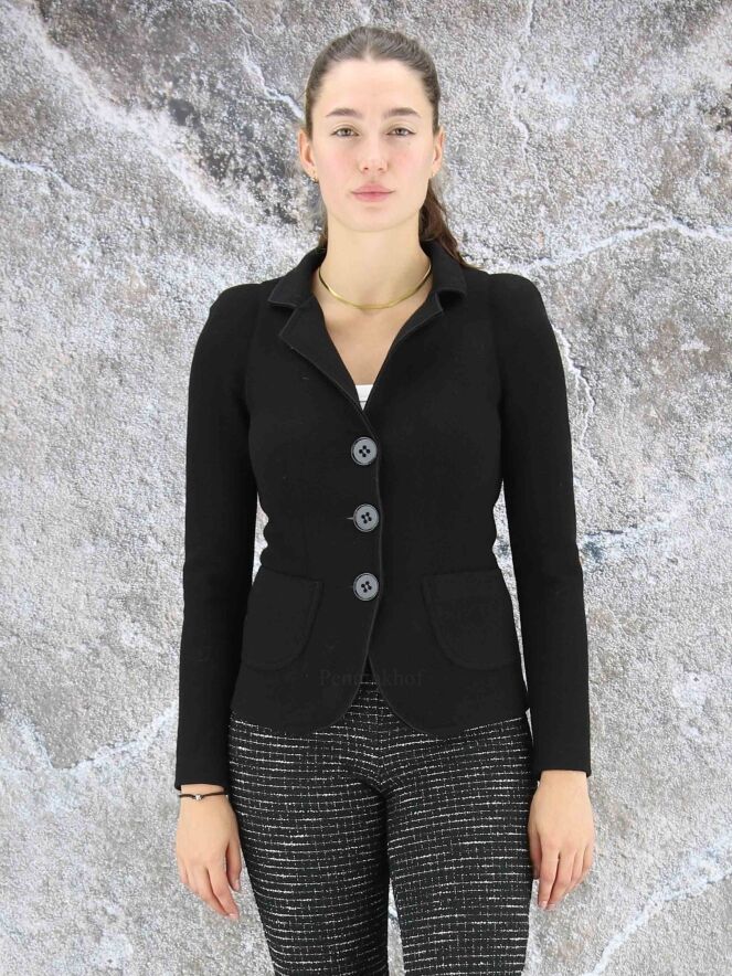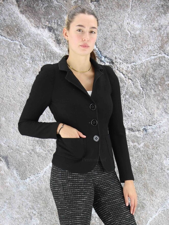 Veste de la marque ML Collections, de couleur noire. Un double tissu borde le revers du col et la patte de boutonnage. La veste ferme à l'aide de trois boutons et est dotée de poches plaquées à l'avant. Ce modèle n'est pas doublé. Lavage déconseillé.