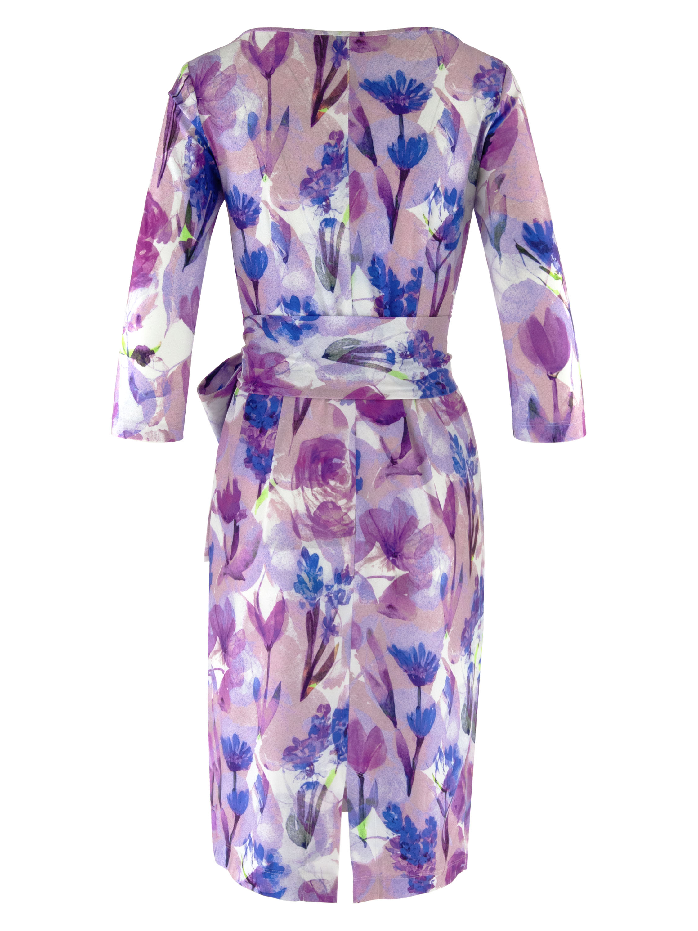Une robe de Moq avec un imprimé floral graphique dans plusieurs nuances de lilas, de rose, de bleu et de blanc. La robe présente une large encolure ronde et une ceinture à la taille réalisée dans le même tissu. Elle n’est pas doublée et possède des manches mi-longues. Cette robe peut être lavée à 40 degrés.
