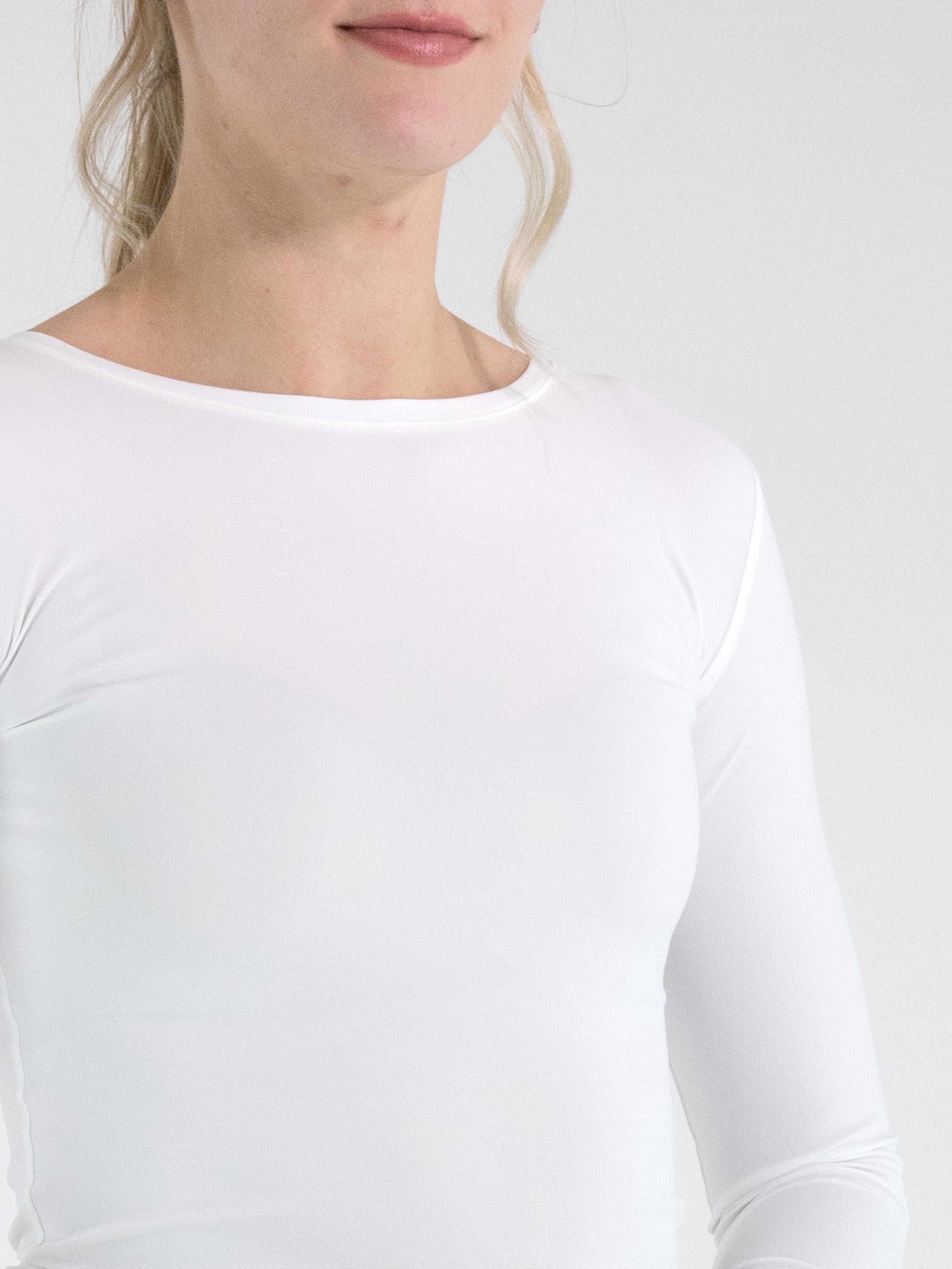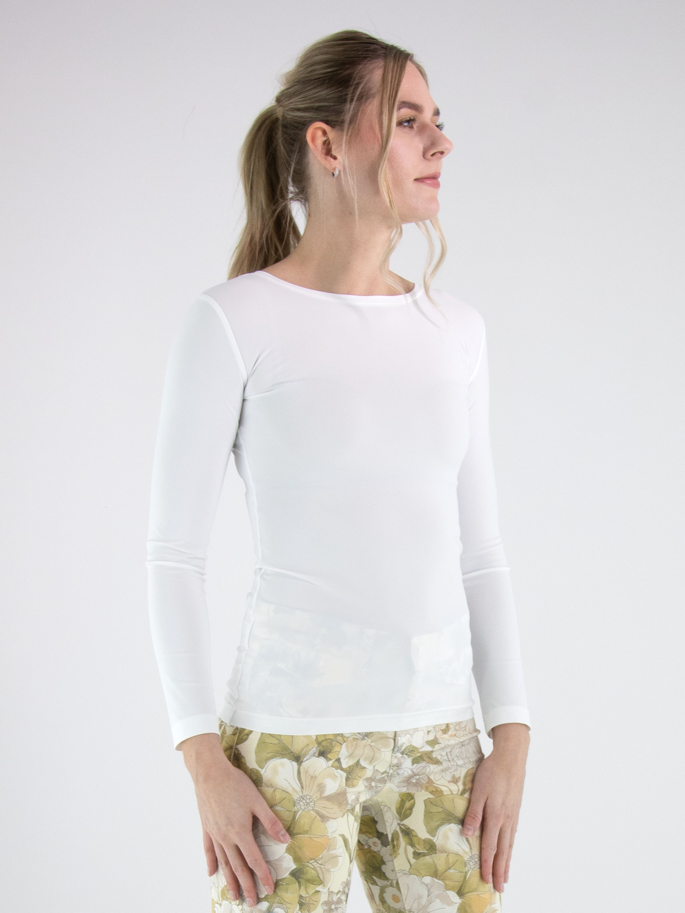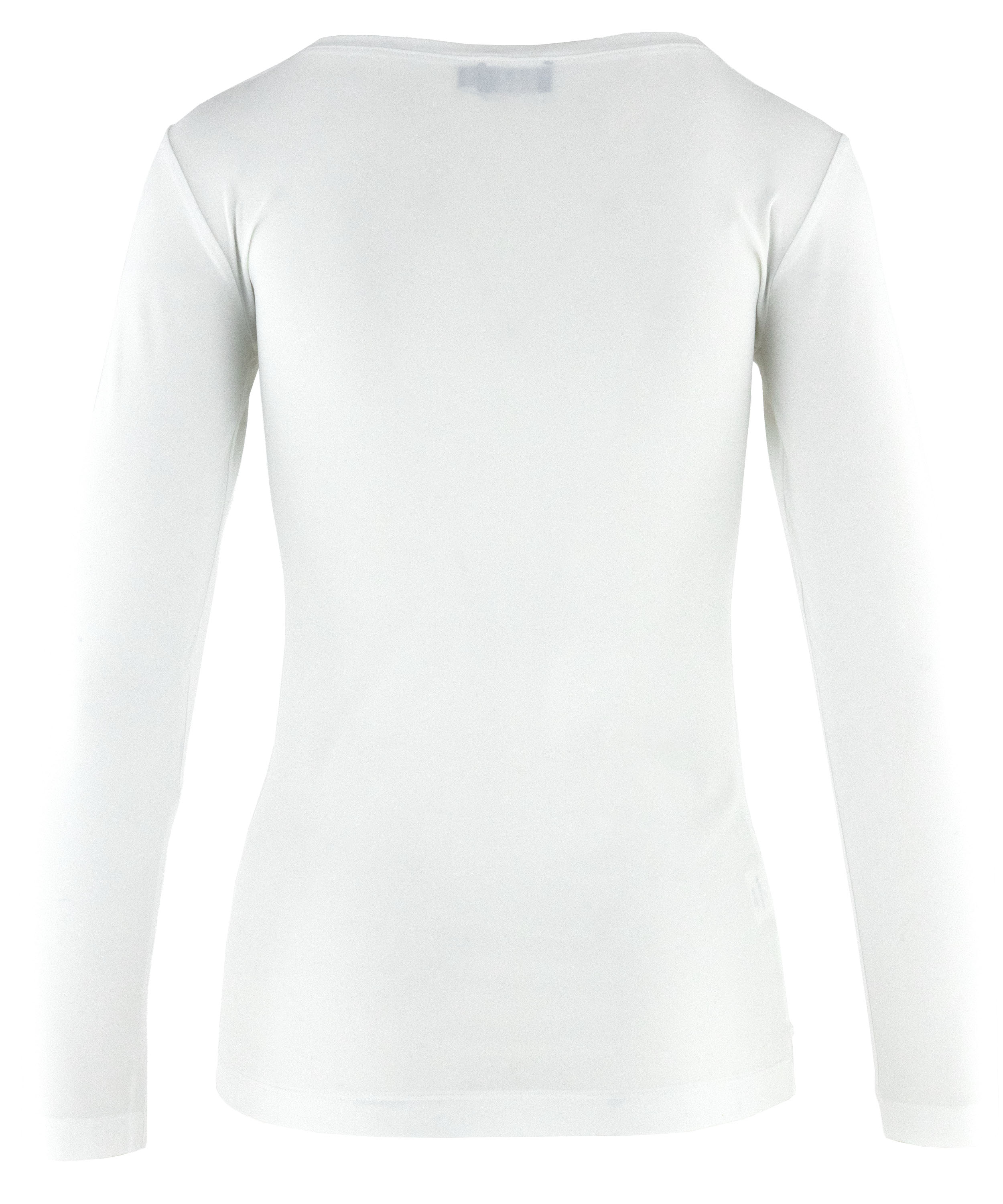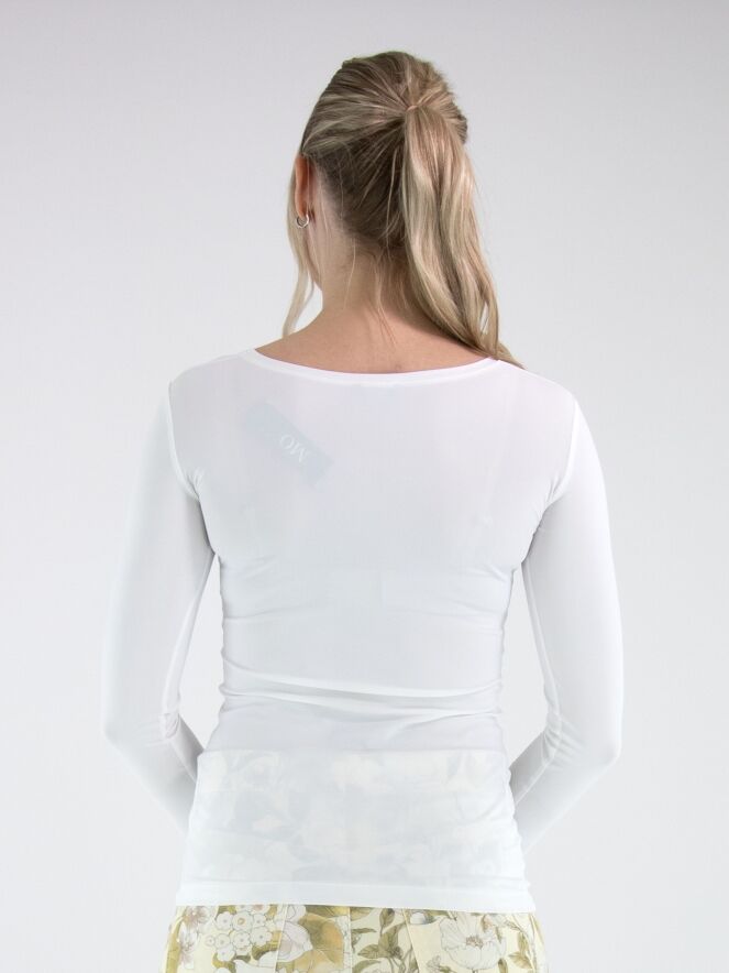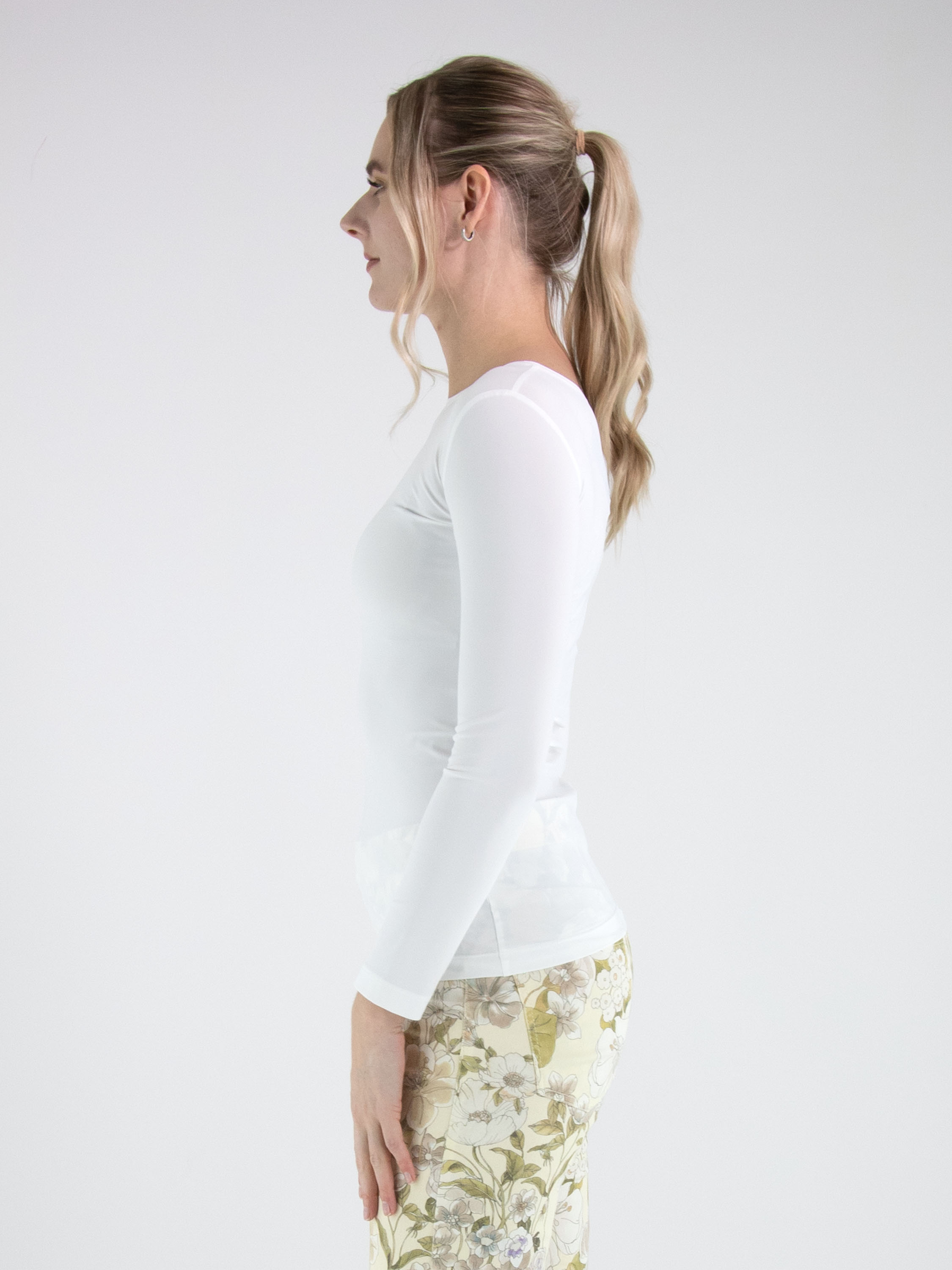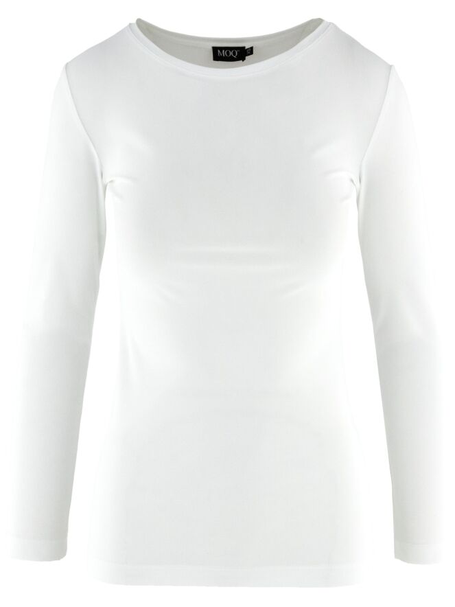 T-shirt de Moq en blanc crème. Doté d’un col rond et de manches longues, ce modèle est légèrement cintré pour offrir une silhouette féminine et confortable. Il peut être lavé à 40 degrés.