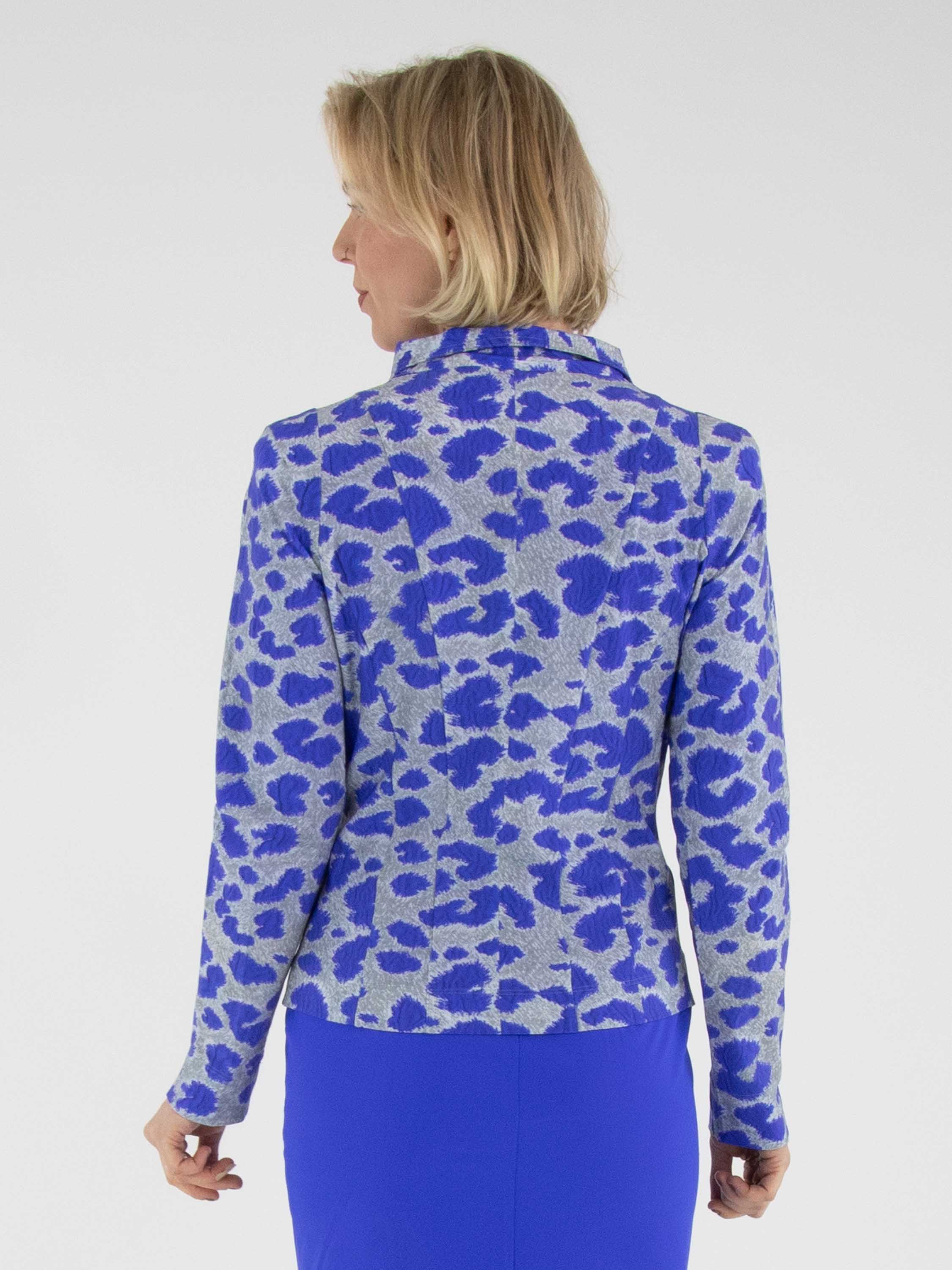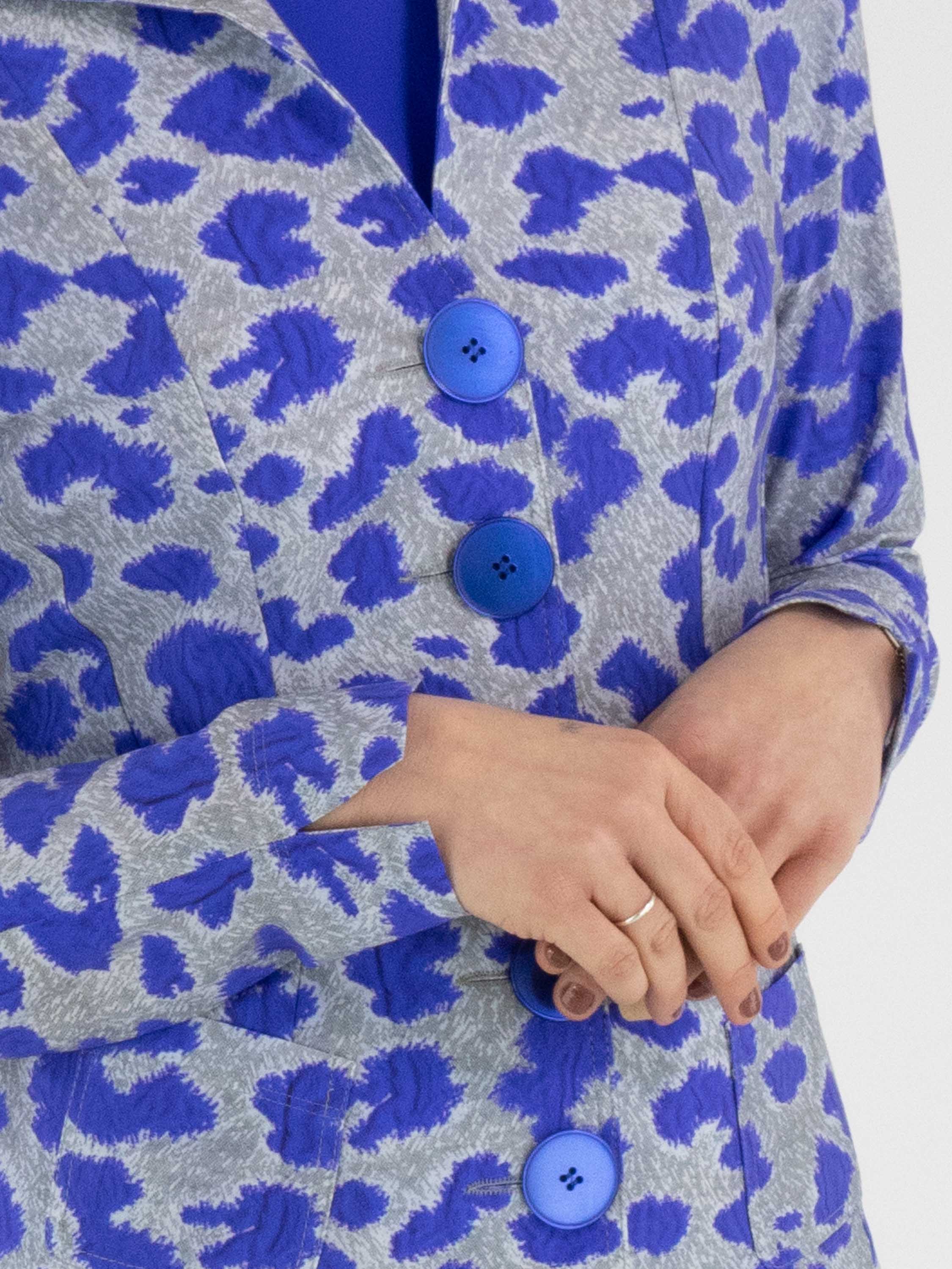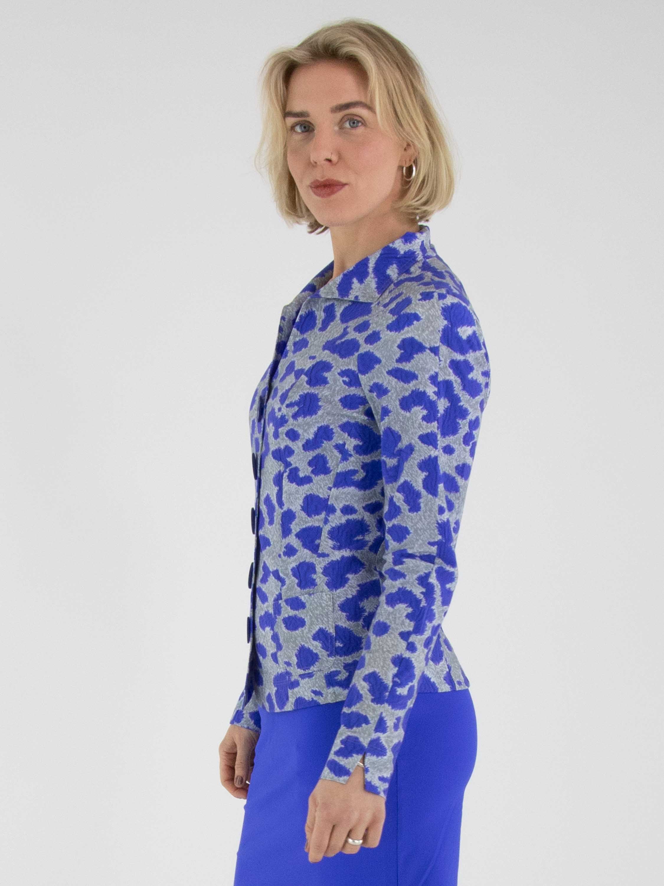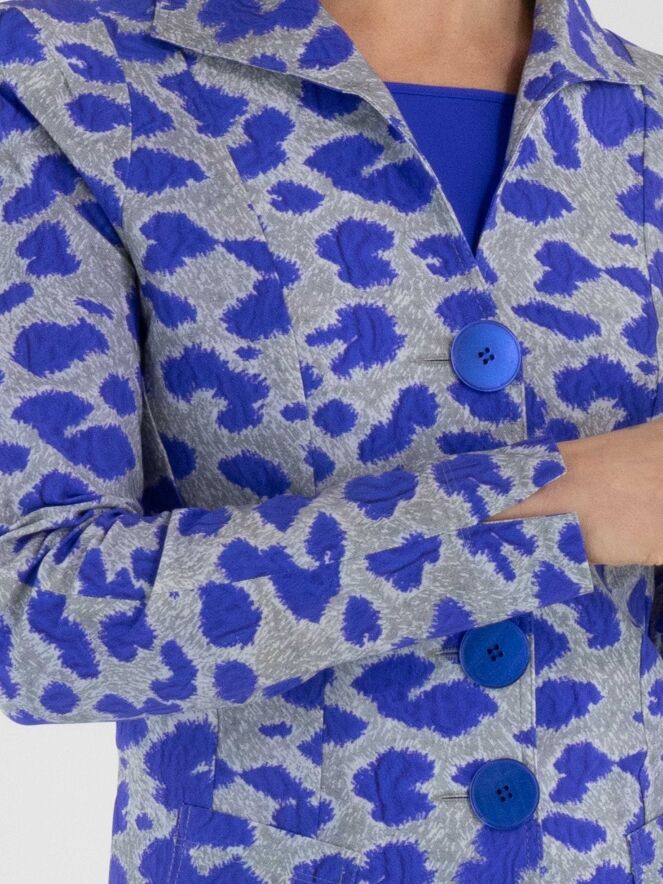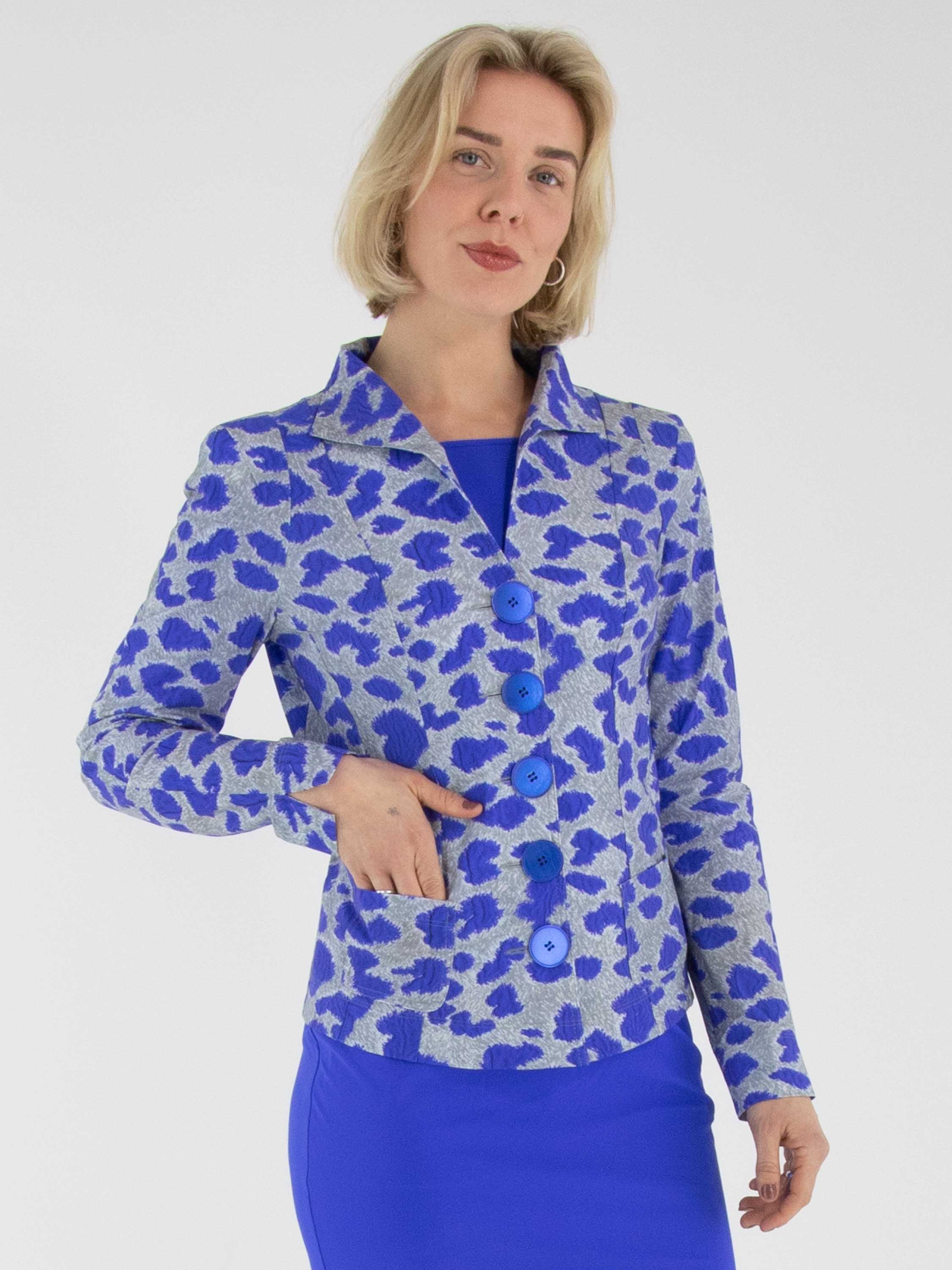 Un blazer de Mog avec un imprimé graphique dans les tons bleu cobalt et gris. Le blazer est doté d’une fermeture à cinq boutons bleu cobalt et n’est pas doublé. Ce blazer peut être lavé à 40 degrés.