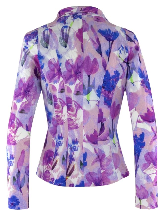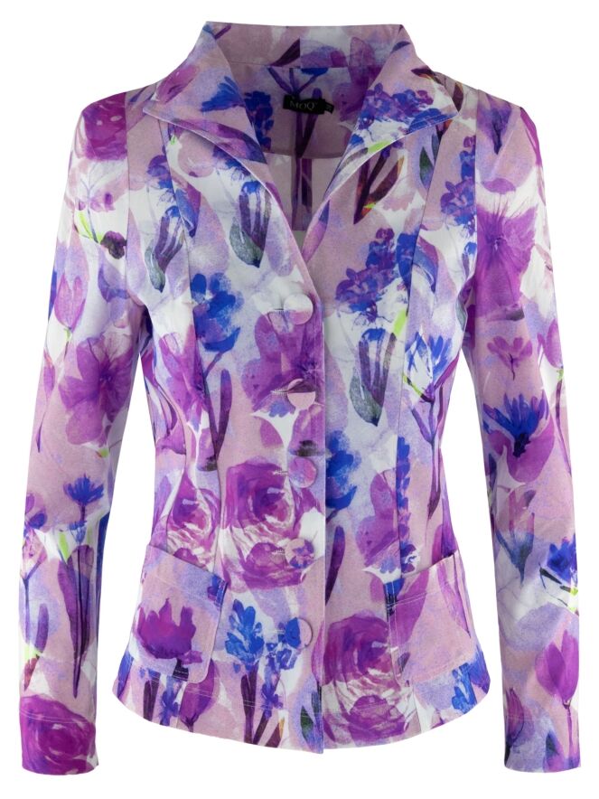 Un blazer de Moq avec un imprimé floral graphique dans plusieurs nuances de lilas, de rose, de bleu et de blanc. Le blazer est doté d’une fermeture à cinq boutons recouverts du même tissu que le blazer. Il n’est pas doublé et peut être lavé à 40 degrés.