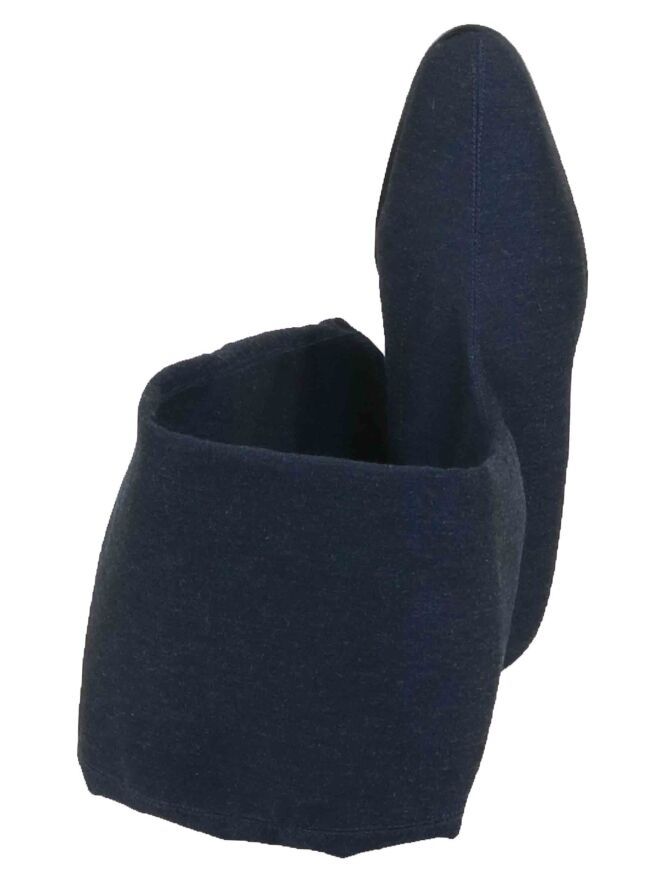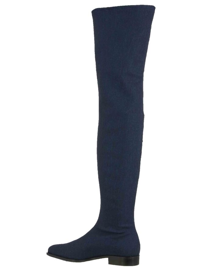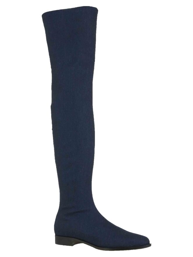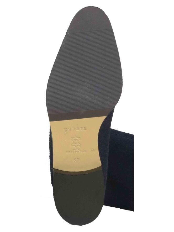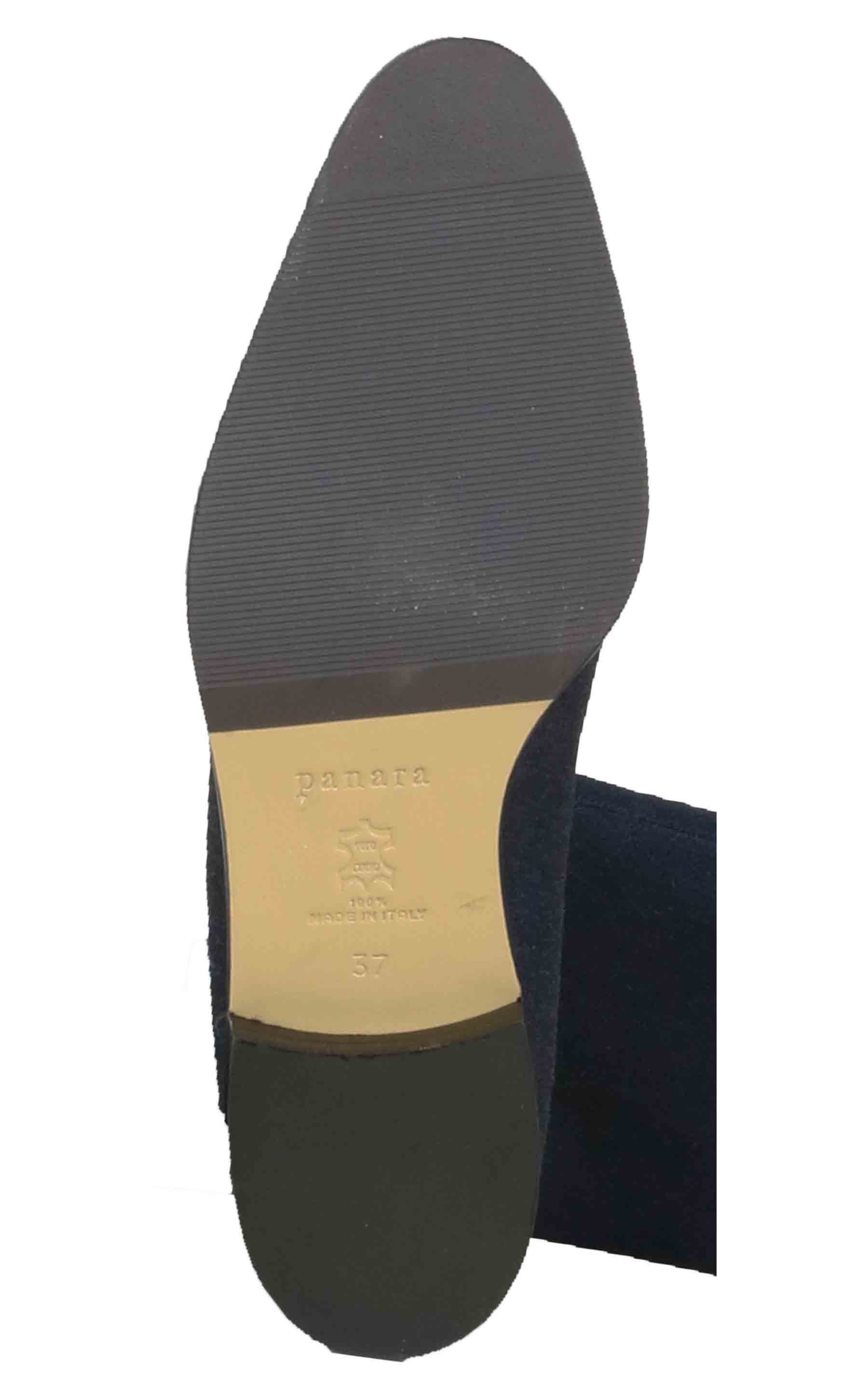 Bottine haute et fine en fin nubuck jeans foncé, de la marque Panara. La tige est élastique et s'adapte parfaitement à la jambe. Nez rond.
