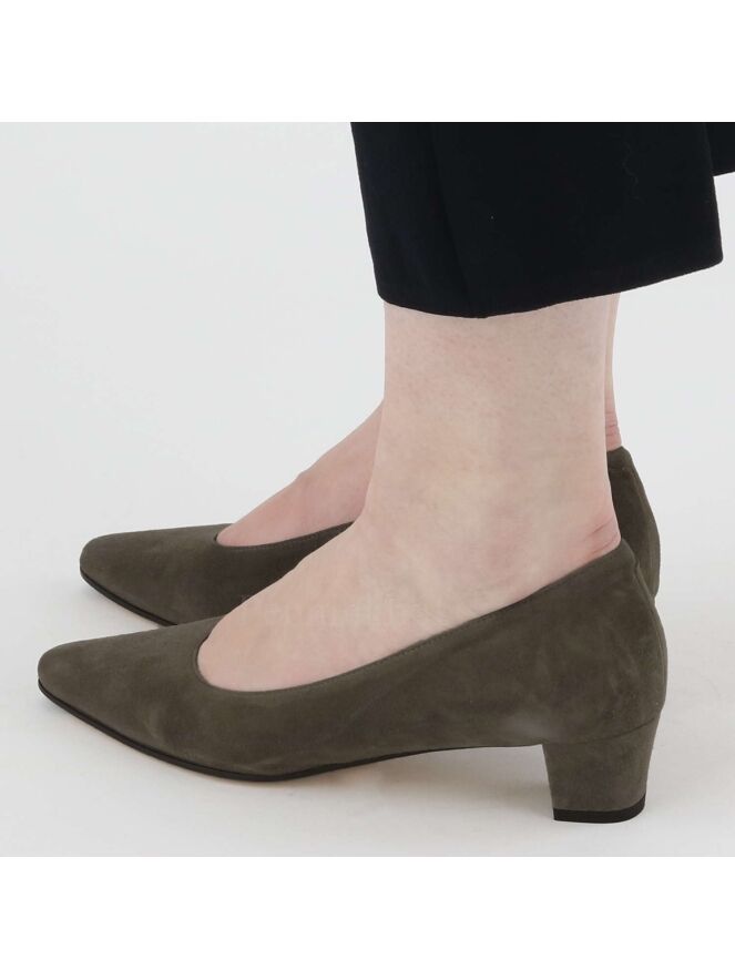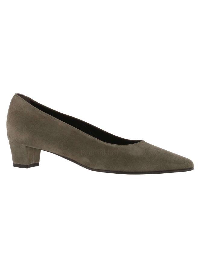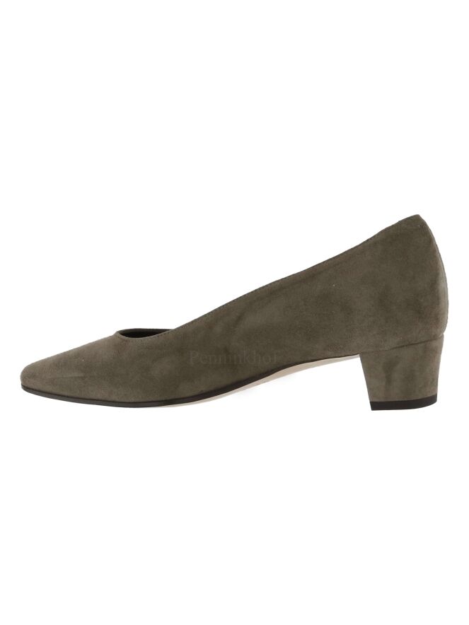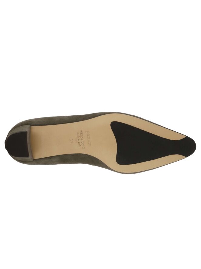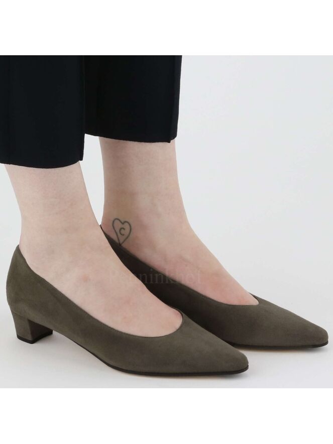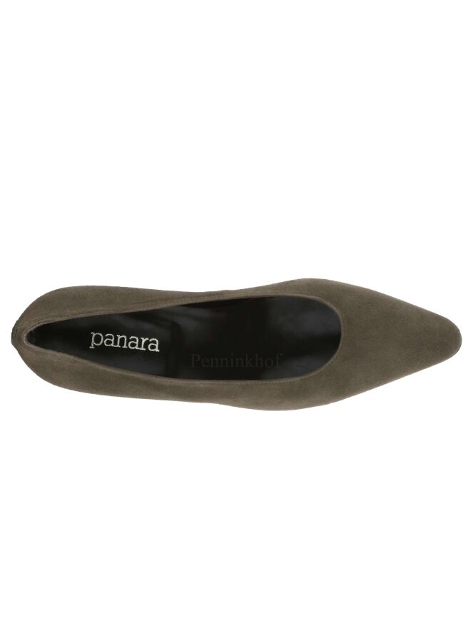 Escarpin de la marque Panara, de couleur taupe. L'escarpin a un nez pointu. Le talon bas et élégant est recouvert du même daim que l'escarpin. L'intérieur est doublé de cuir.