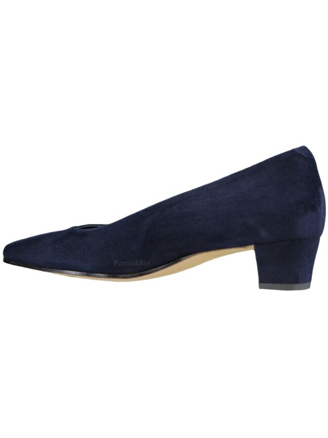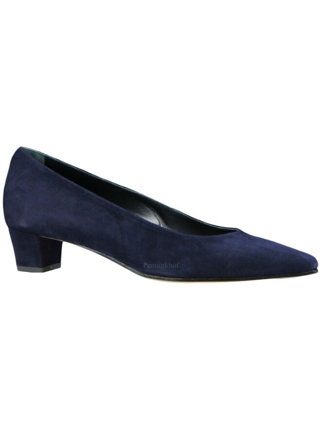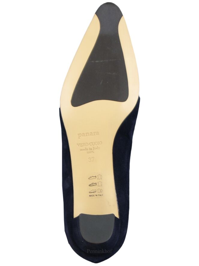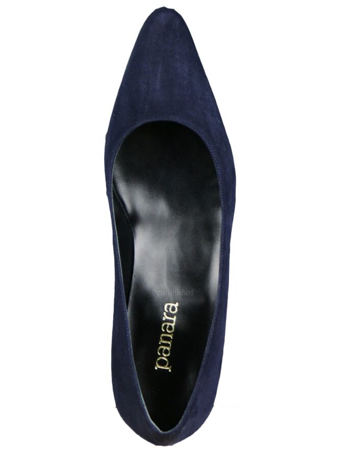 Escarpin de la marque Panara, de couleur bleu marine. L'escarpin a un nez pointu. Talon bas et élégant est recouvert du même daim que l'escarpin.
