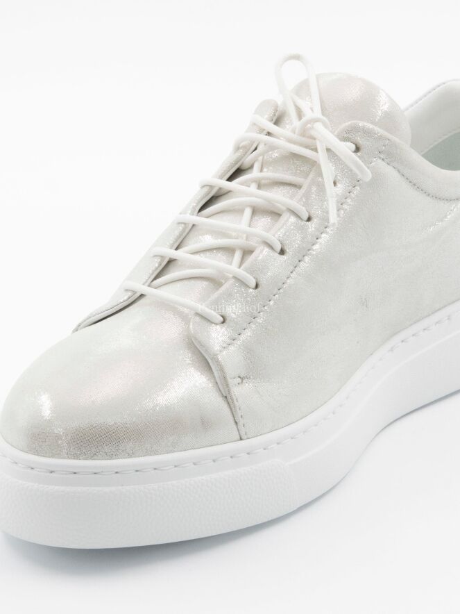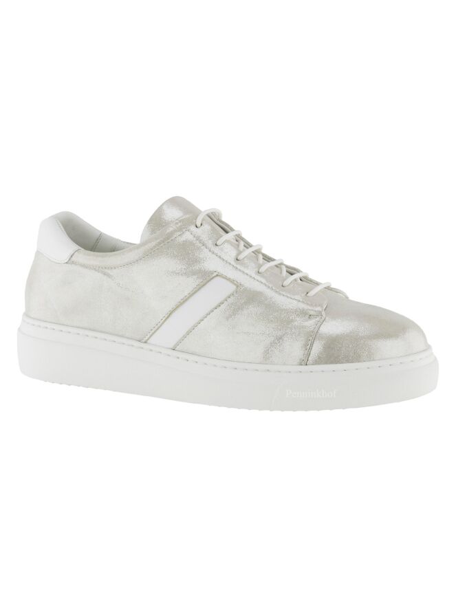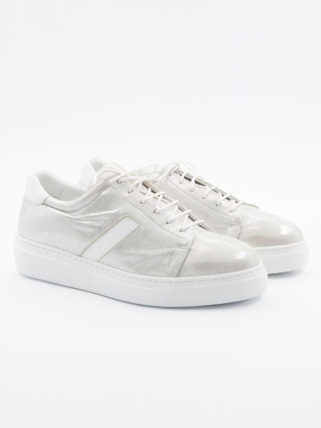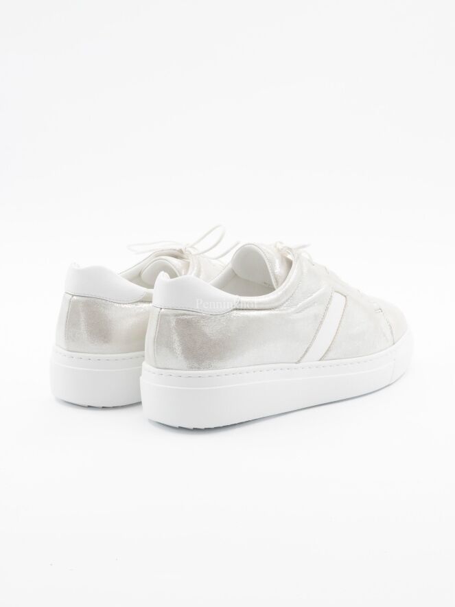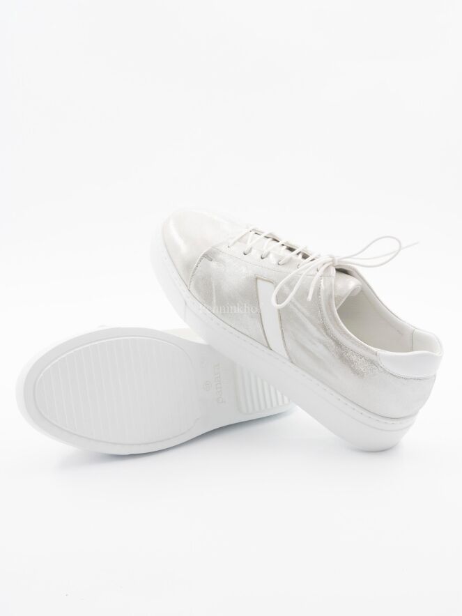 Sneaker sportive de la marque Panara, de couleur argentée. Sur le talon, la tige présente une pièce de cuir blanc, que l'on retrouve sur le côté extérieur de la chaussure.