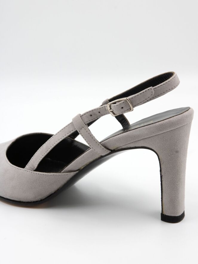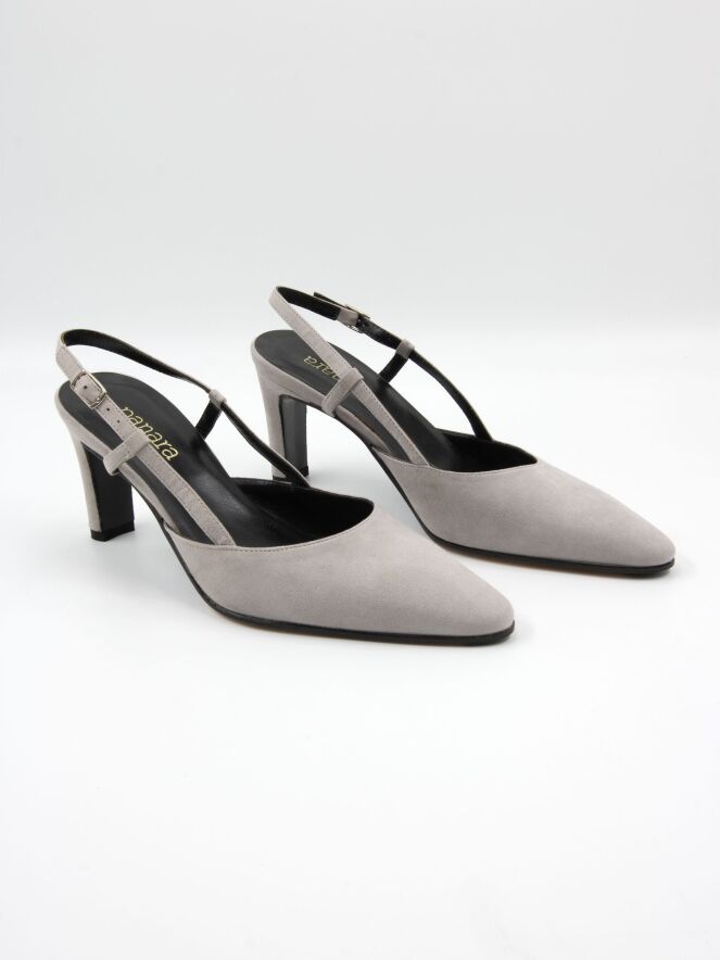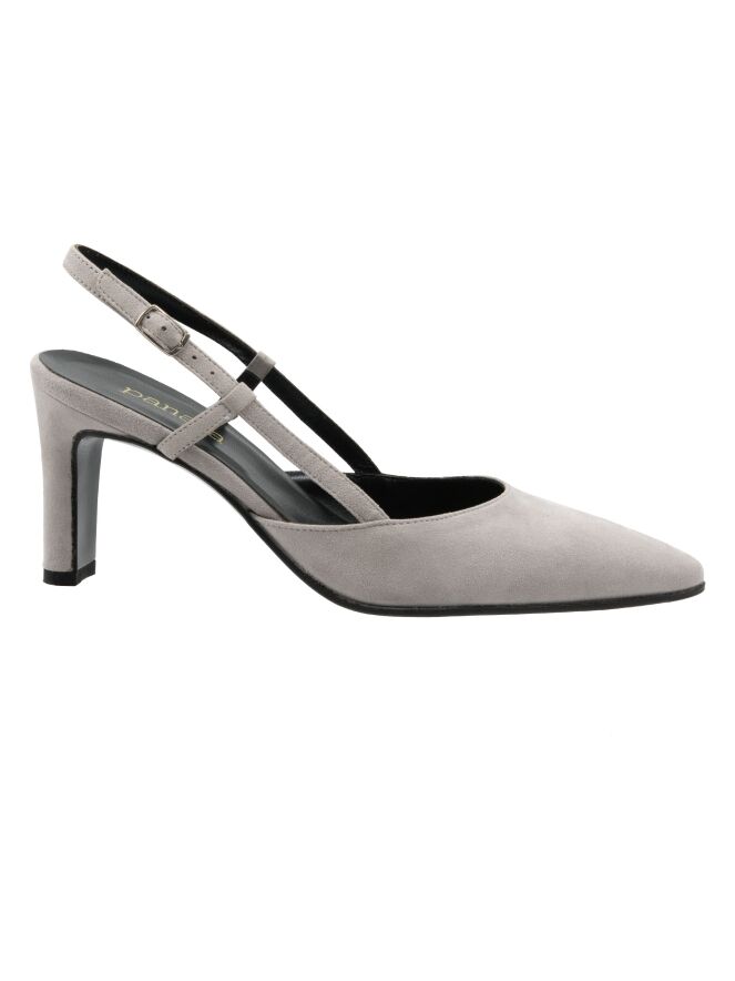 Escarpin à nez pointu, de la marque Panara, en nubuck gris clair. Cet élégant escarpin est ouvert à l'arrière, équipé d'une sangle de talon réglable avec une fixation de support sur les deux côtés.