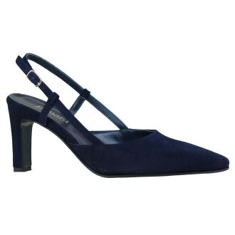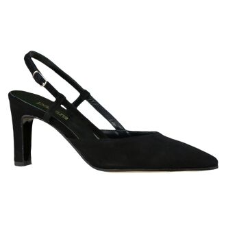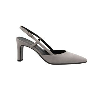 Escarpin à nez pointu, de la marque Panara, en nubuck gris clair. Cet élégant escarpin est ouvert à l'arrière, équipé d'une sangle de talon réglable avec une fixation de support sur les deux côtés.