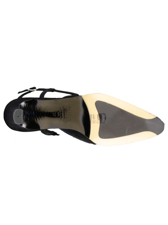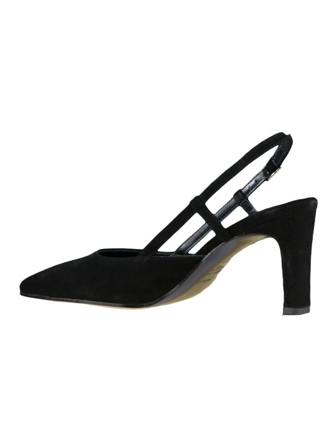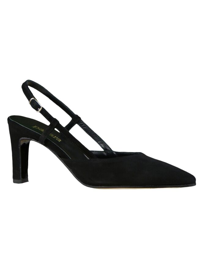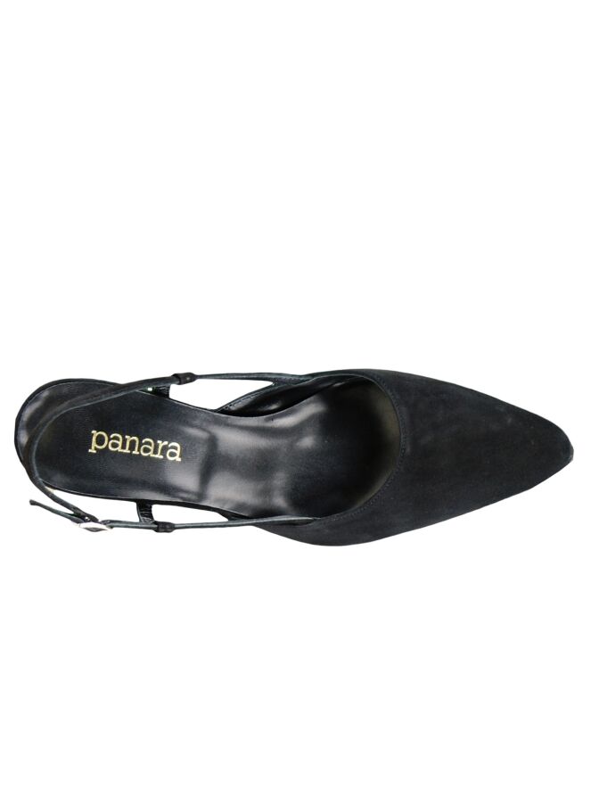 Escarpin à nez pointu, de la marque Panara, en nubuck noir. Cet élégant escarpin est ouvert à l'arrière, équipé d'une sangle de talon réglable avec une fixation de support sur les deux côtés.