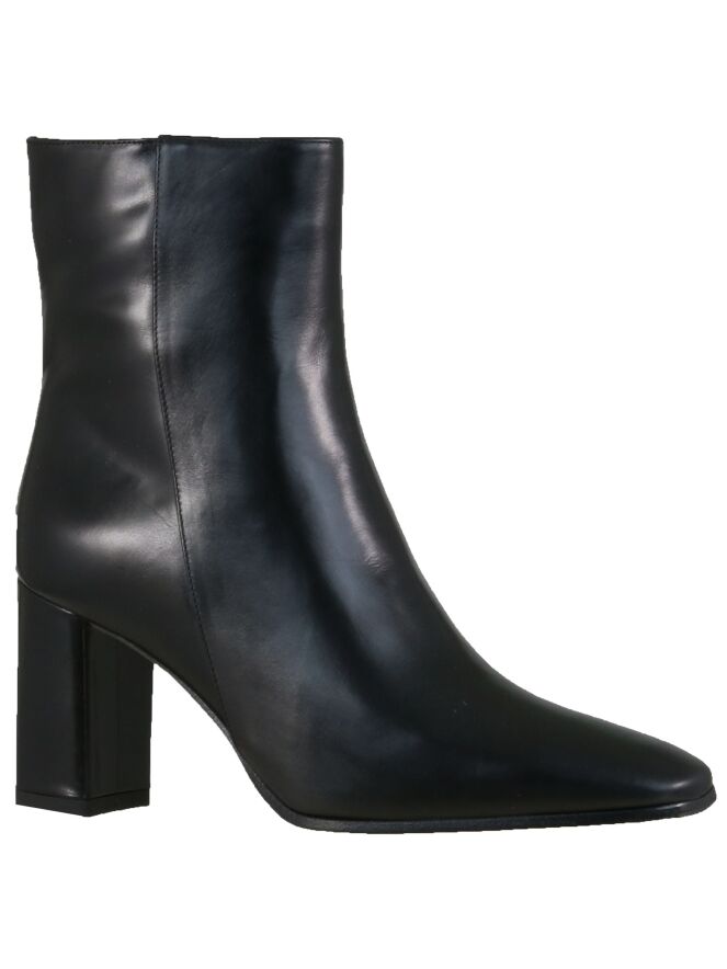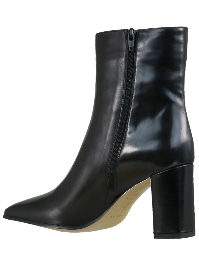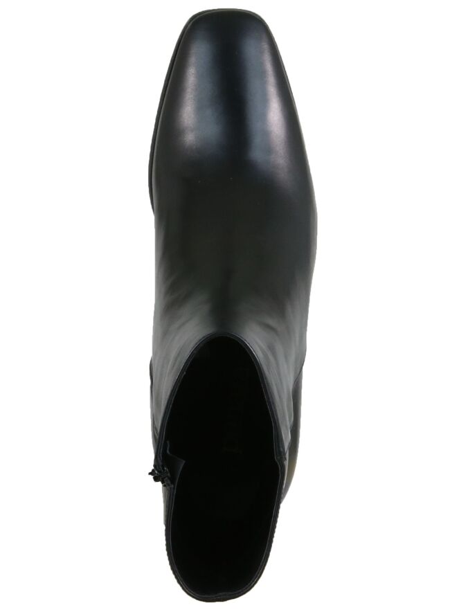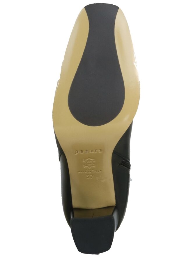 Elégante bottine tout en beau cuir nappa noir, de la marque hollandaise Panara. Son nez est de forme carré. La hauteur de la tige depuis le talon est de 15 cm, et sa circonférence de 27 cm. Intérieur doublé cuir.