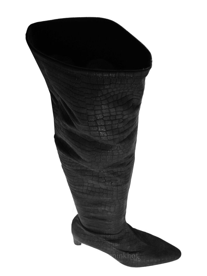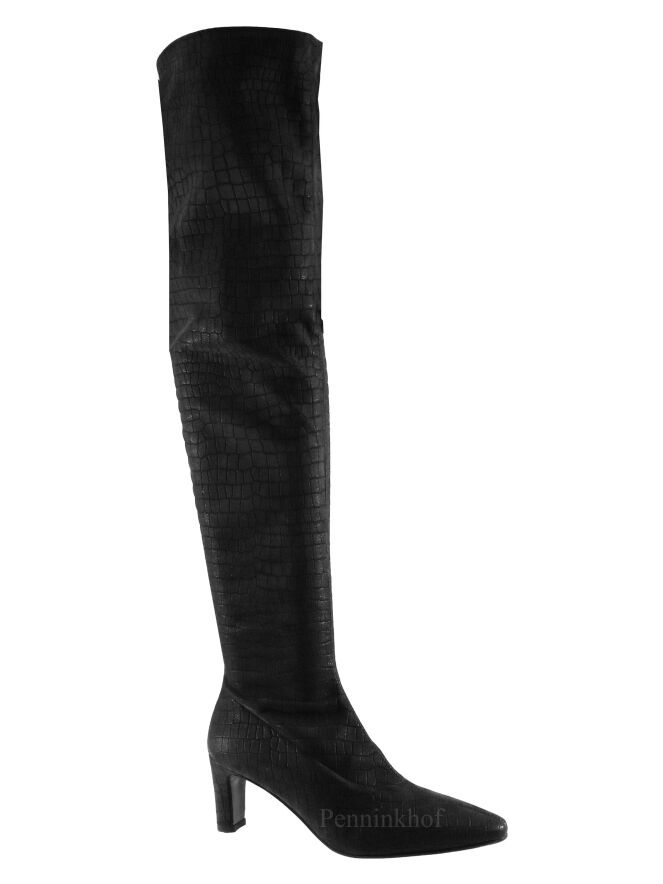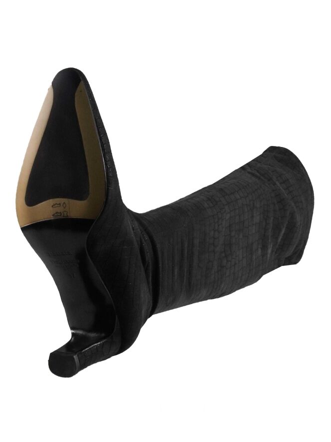 Botte haute en stretch de couleur noire de la marque Panara, imprimée d'un motif peau de girafe en relief. La botte présente un nez légèrement pointu et un talon recouvert du même tissue que le reste du modèle.