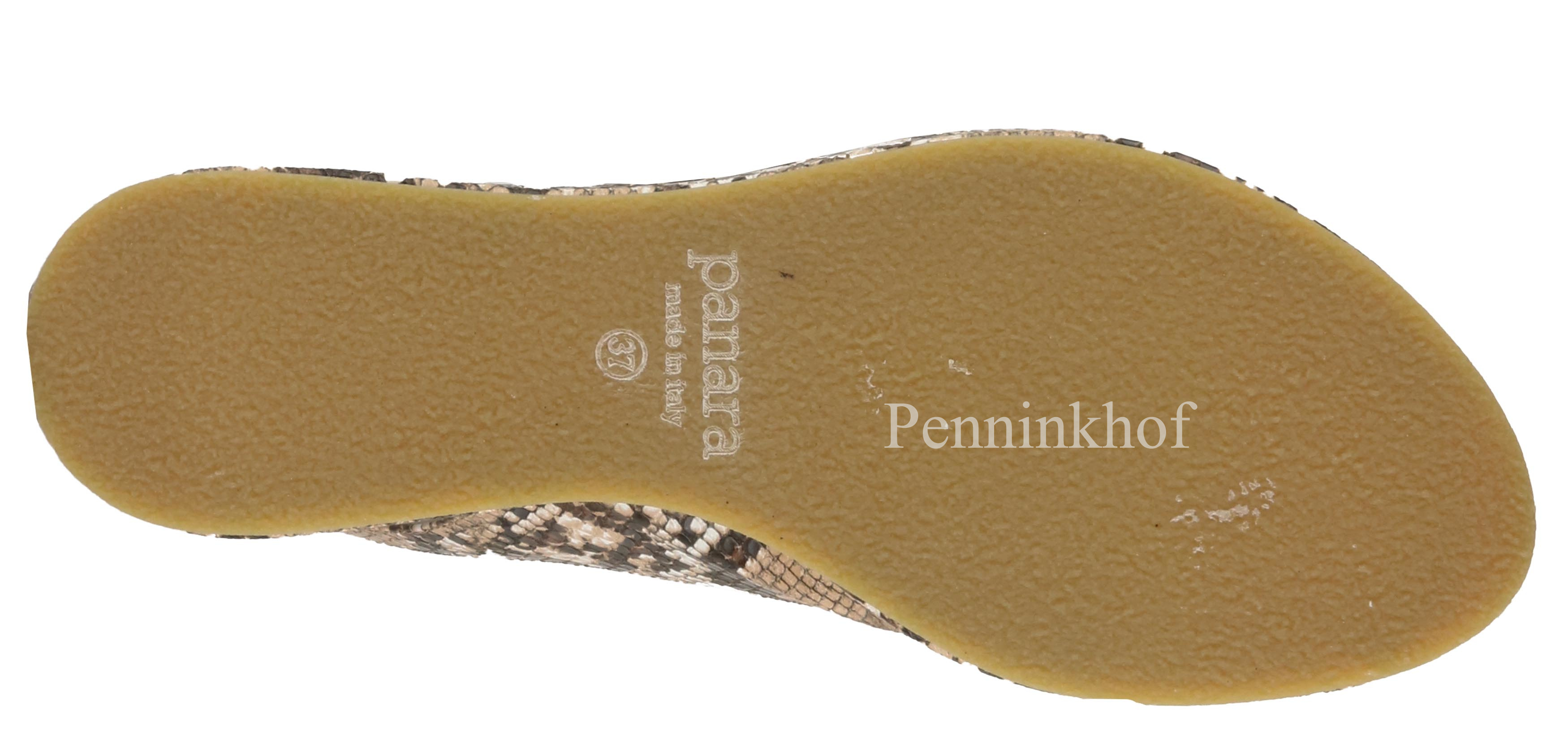 Sandale ouverte de la marque Panara, imprimée d'un motif python aux couleurs chamois, blanc et moka. La sandale est dotée d'une bride de talon. L'intérieur est doublé de cuir.