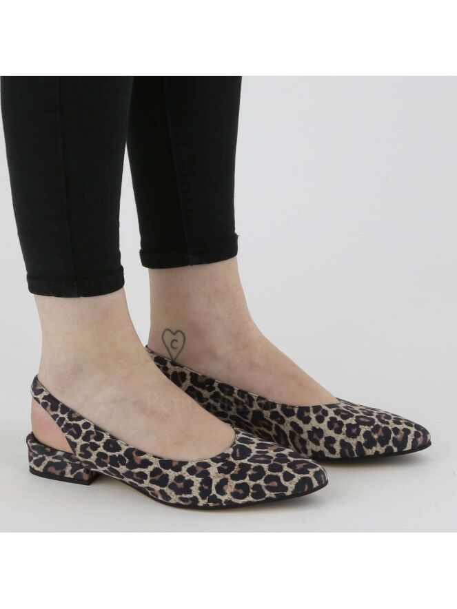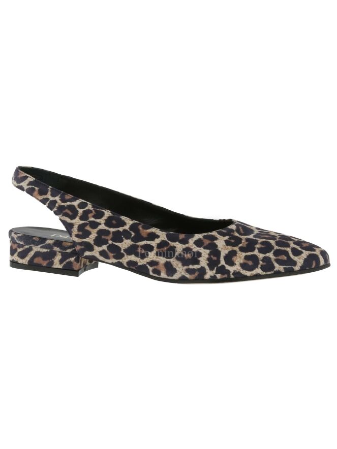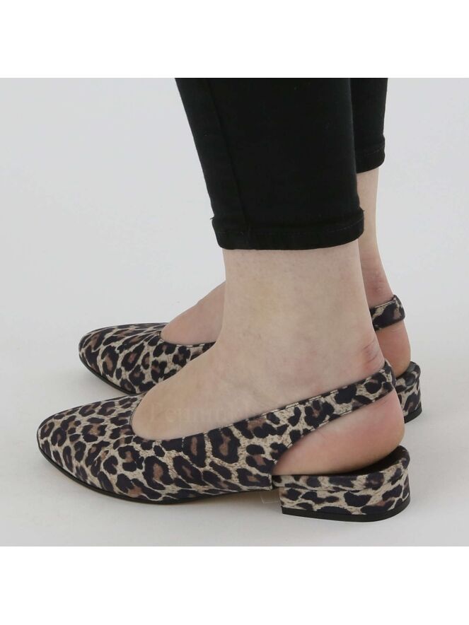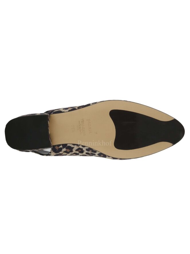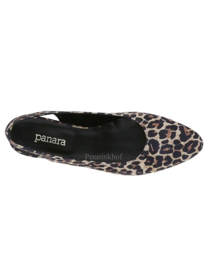 Sandale à talon ouvert de la marque Panara, imprimée d'un motif panthère aux multiples nuances de taupe, chamois et noir. La chaussure a un nez rond et un talon recouvert du même matériau que la chaussure. L'intérieur est doublé de cuir.
