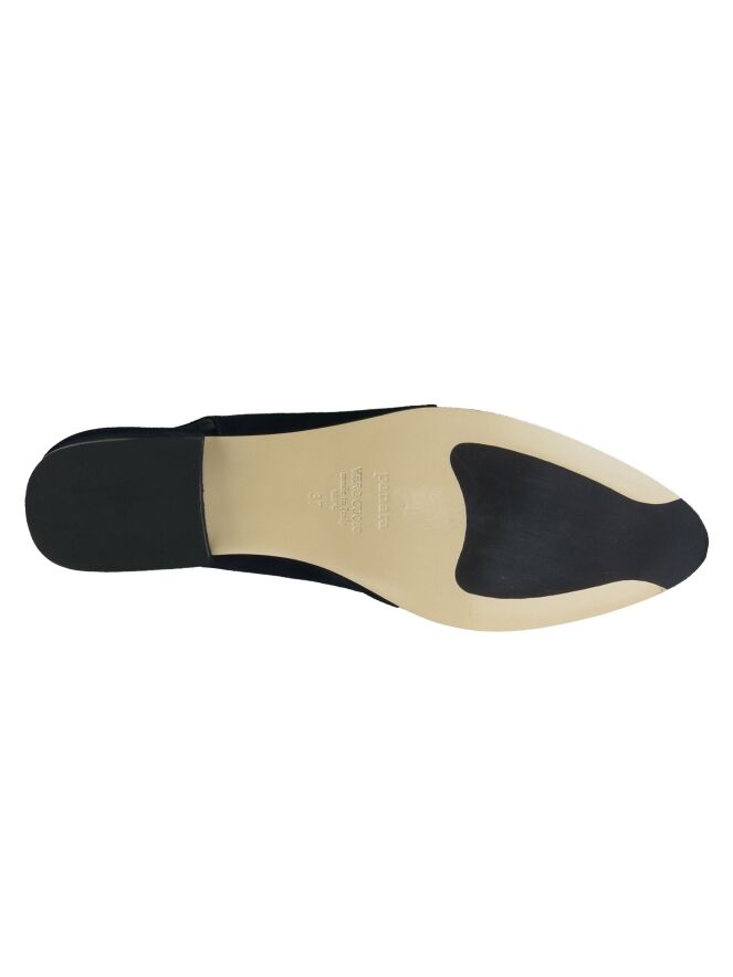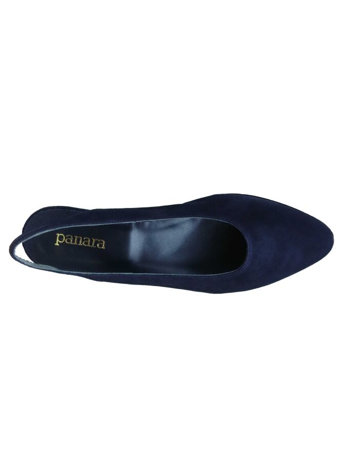 Mocassin en daim couleur bleu marine, de la marque Néerlandaise Panara. Modèle à nez rond, avec une bande étroite dans le même matériau que le slip-on. Modèle doublé cuir intérieur.