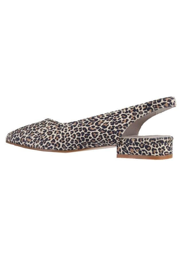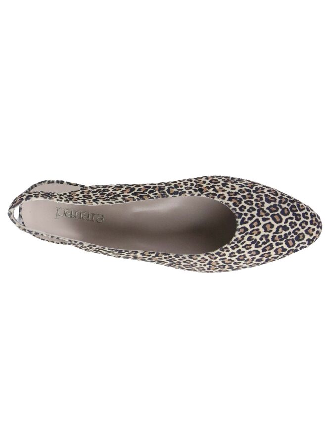 Sandale à talon ouvert de la marque Panara, imprimée d'un motif panthère aux multiples nuances de taupe, chamois et noir. La chaussure a un nez rond et un talon recouvert du même matériau que la chaussure. L'intérieur est doublé de cuir.