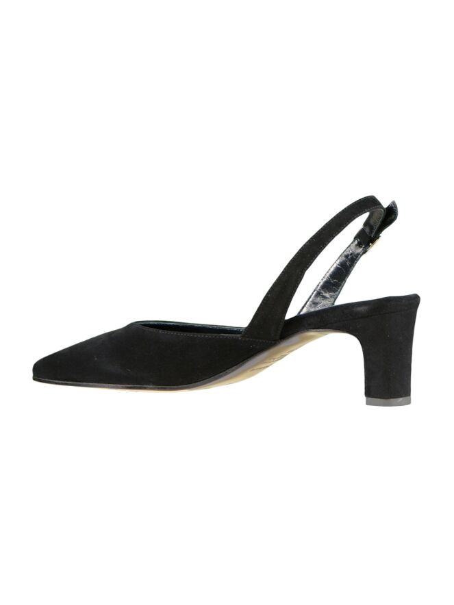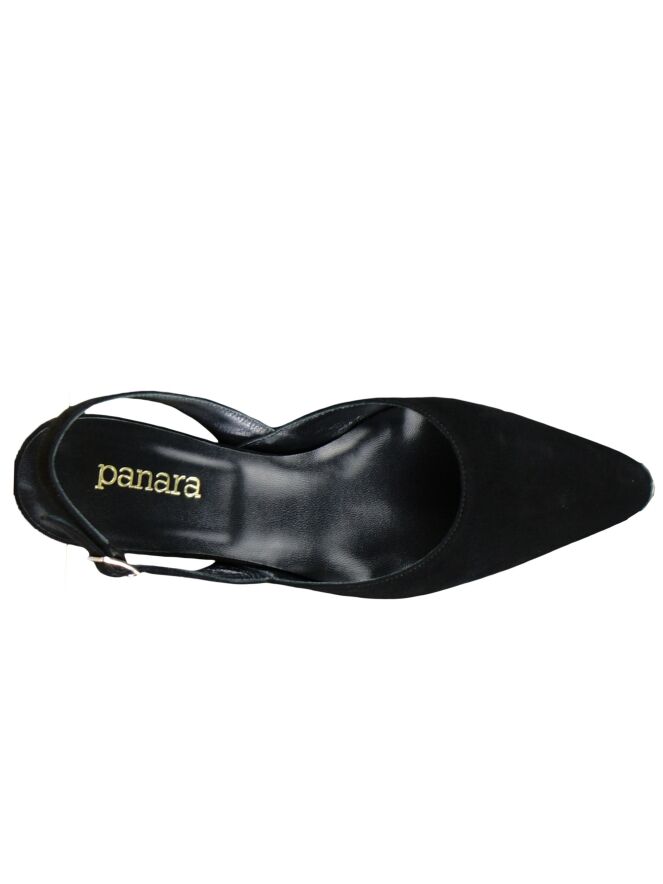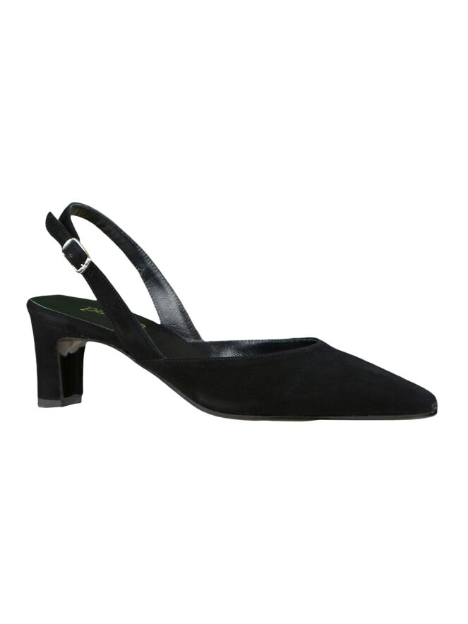 Escarpin à talon de 5 cm, de la marque Panara, en nubuck noir. Cet escarpin aux lignes pures à nez pointu est ouvert à l'arrière, équipé d'une fine sangle réglable. Talon plat également recouvert de nubuck. L'intérieur est garni de cuir noir.