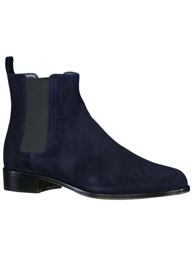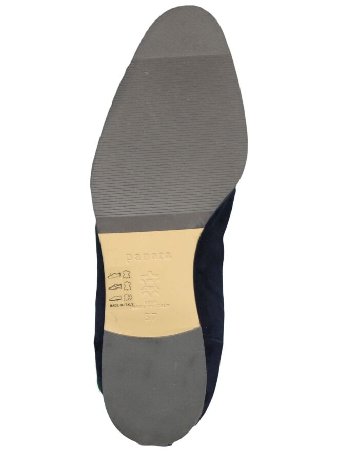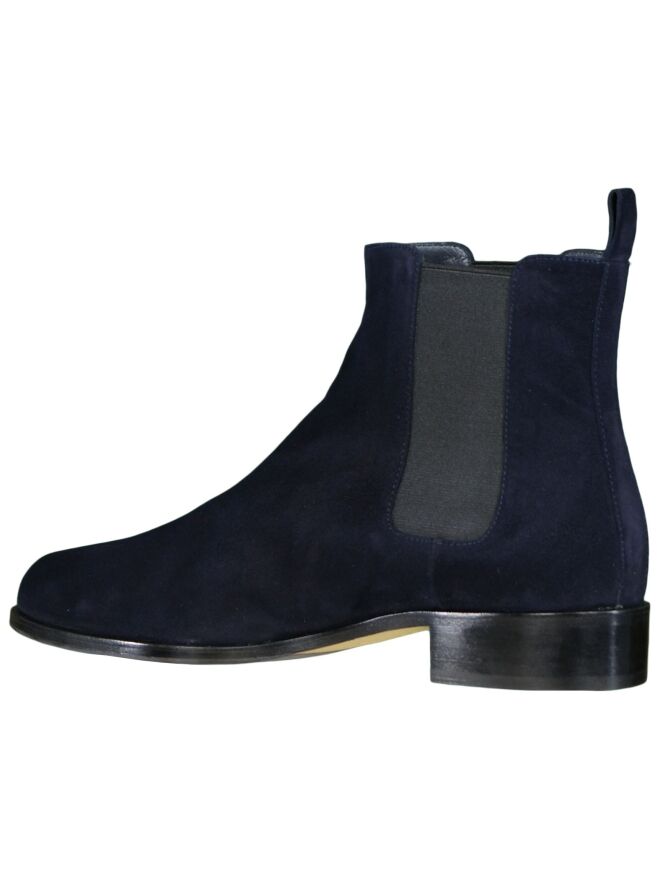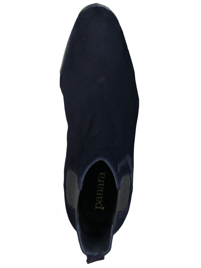 Petite bottine en nubuck couleur bleu marine, de la marque Panara. Elle s'enfile grâce aux deux bandes élastiques noires situées de chaque côté. Modèle à bout rond. Doublure cuir à l’intérieur.