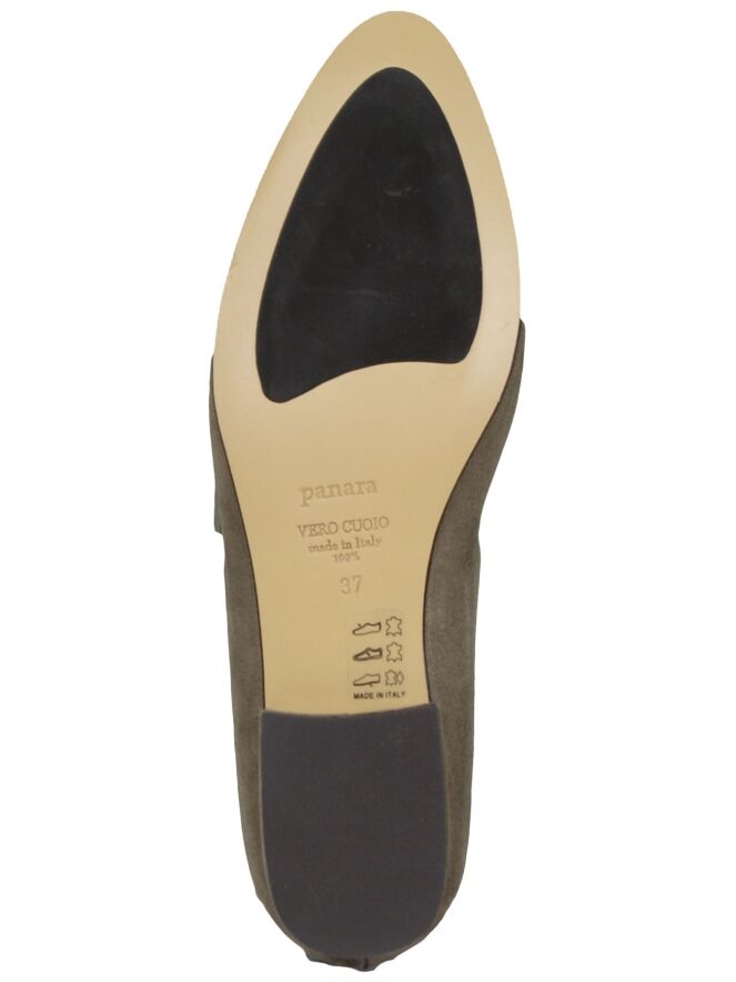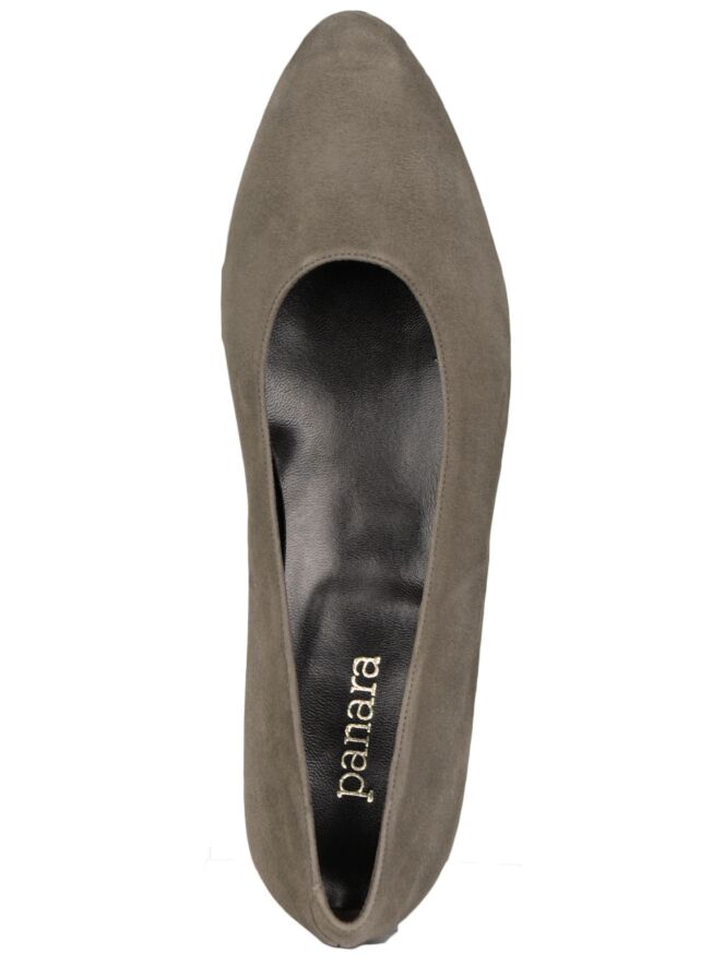 Ballerine fine en nubuck couleur taupe, de la marque Néerlandaise Panara. Modèle à bout rond et doublure cuir à l’intérieur.