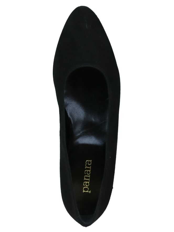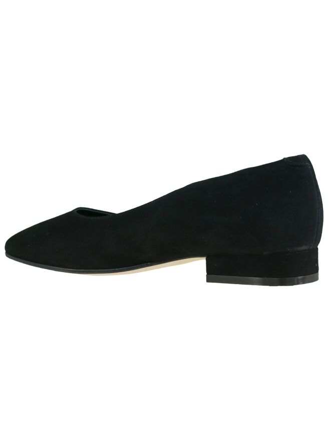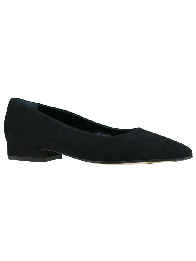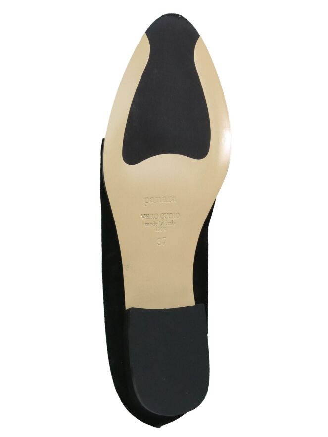 Ballerine plate en daim noir, de la marque Néerlandaise Panara. Modèle à nez rond. Intérieur doublé cuir.