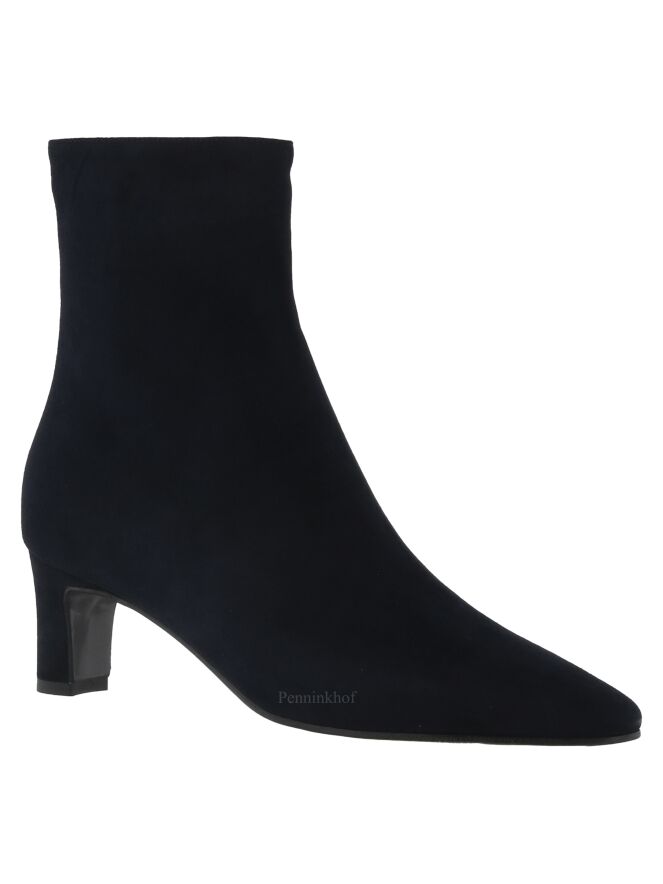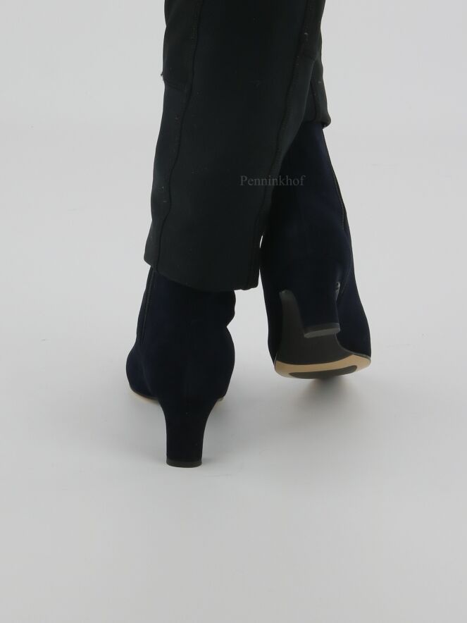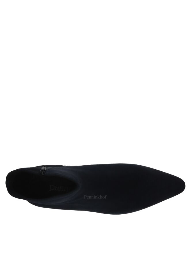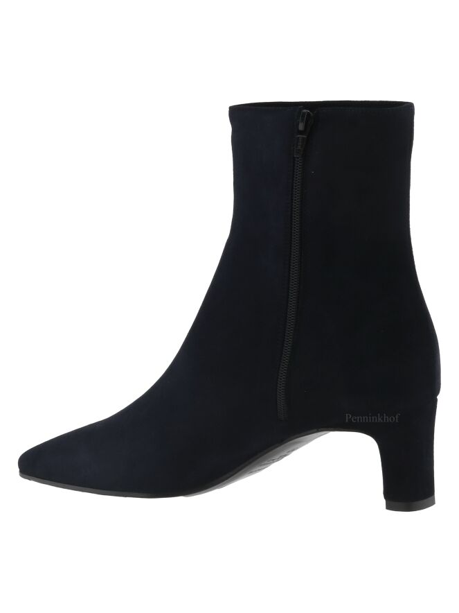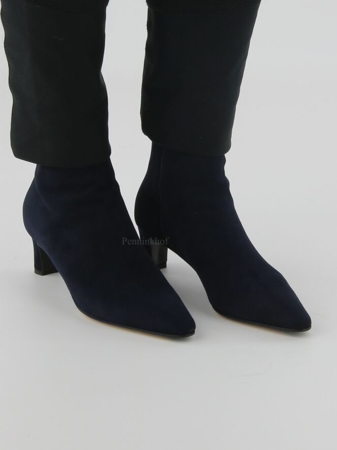 Bottine de la marque Panara, en camoscio souple de couleur bleu marine. Elle est équipée d'un zip de fermeture sur l'intérieur. L'avant-pied présente un nez coupé mince. L'intérieur de la bottine est doublé de cuir.