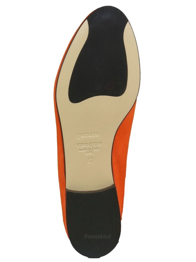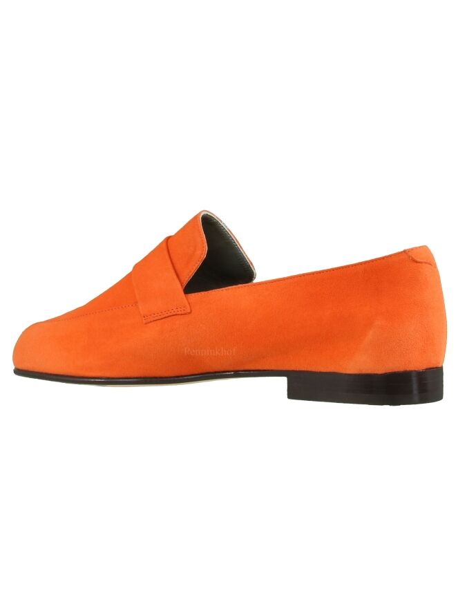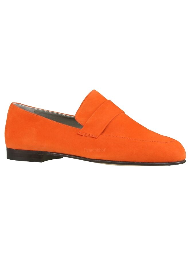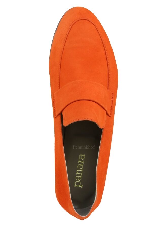 Mocassin en daim couleur orange, de la marque Néerlandaise Panara. Modèle à nez rond, avec une bande étroite dans le même matériau que le slip-on. Modèle doublé cuir intérieur.