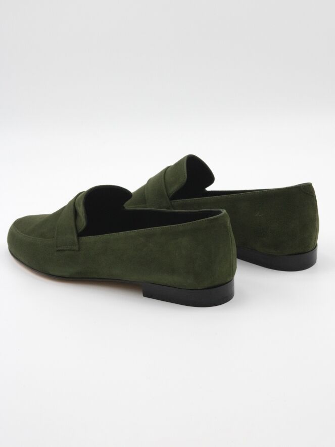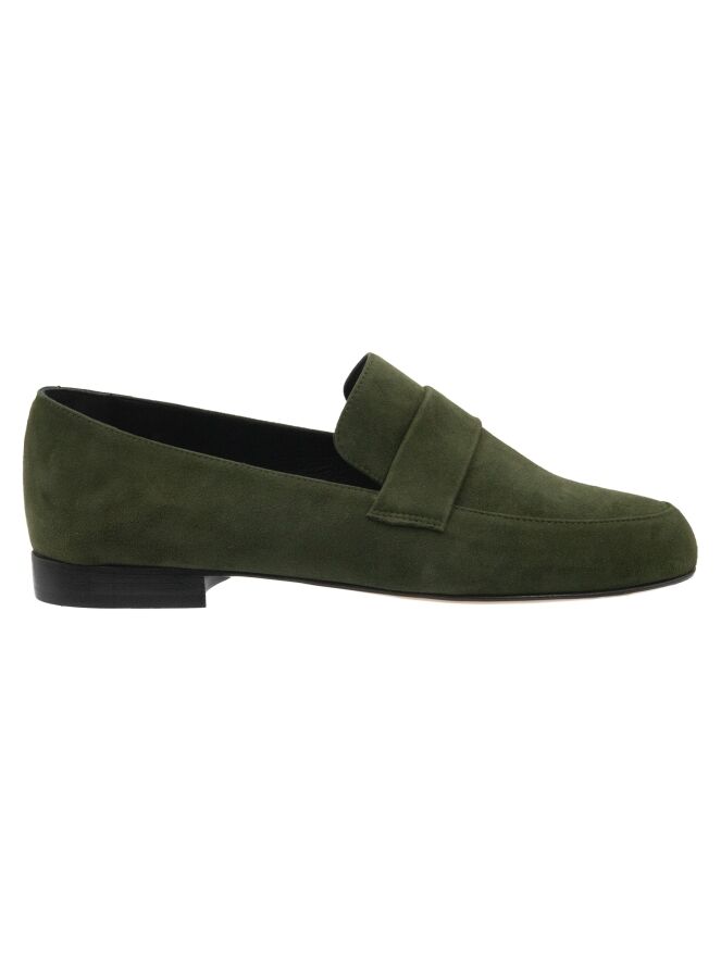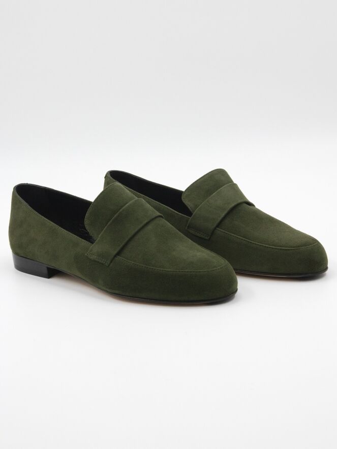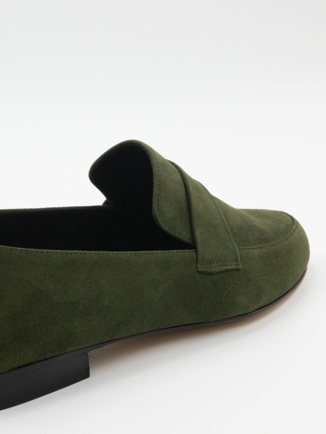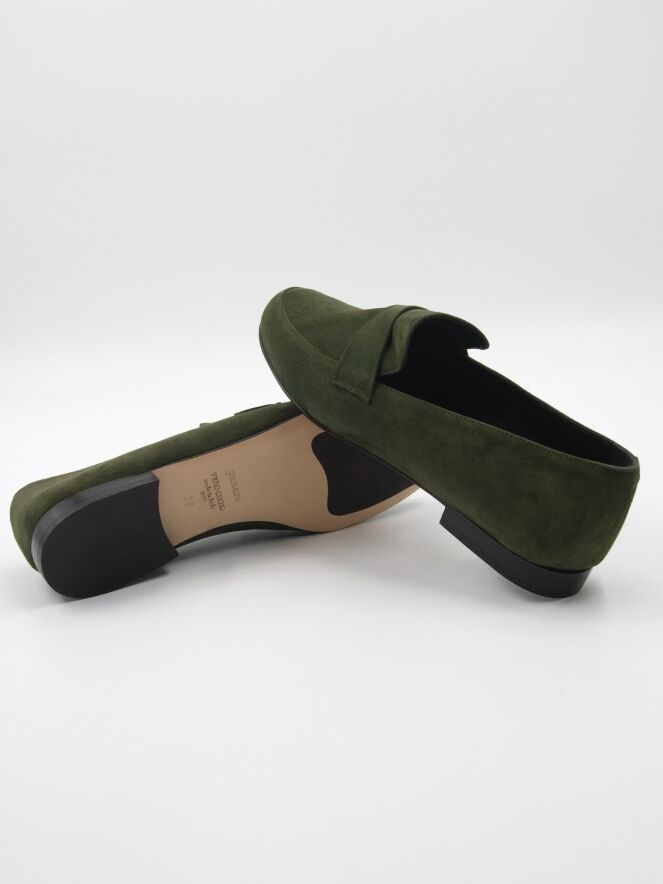 Mocassin de la marque Panara en vert olive. Une fine bride, réalisée dans le même matériau que la chaussure, traverse l’avant arrondi. L’intérieur est doublé de cuir.