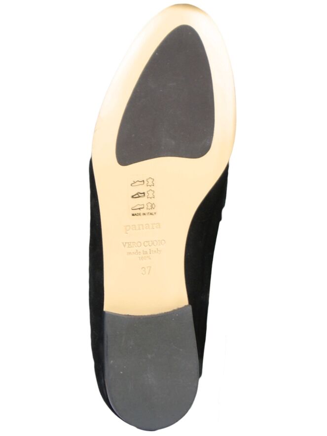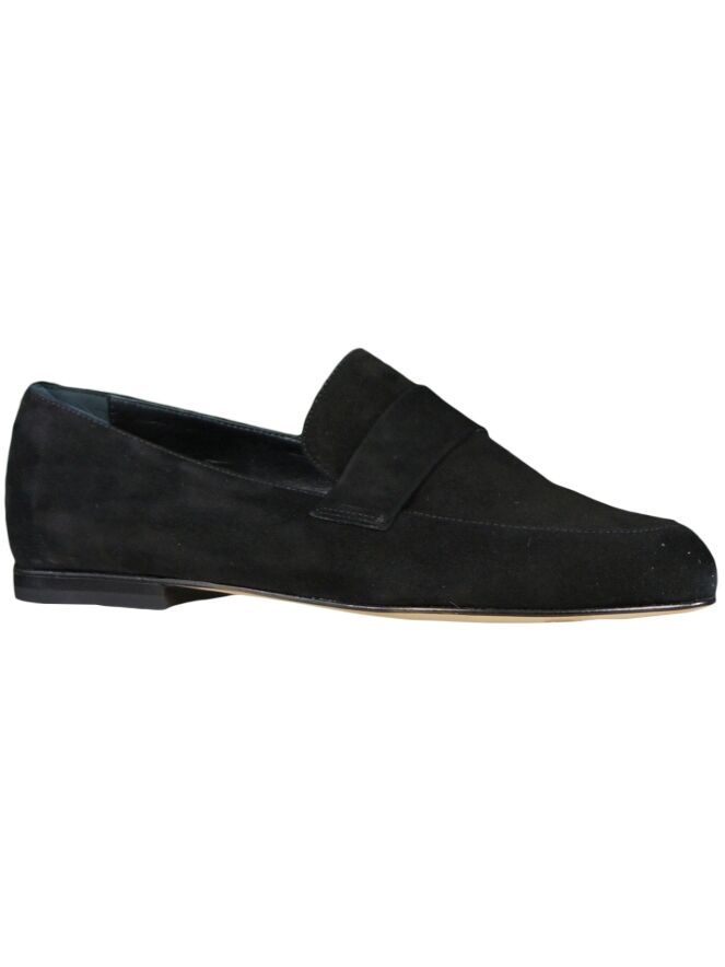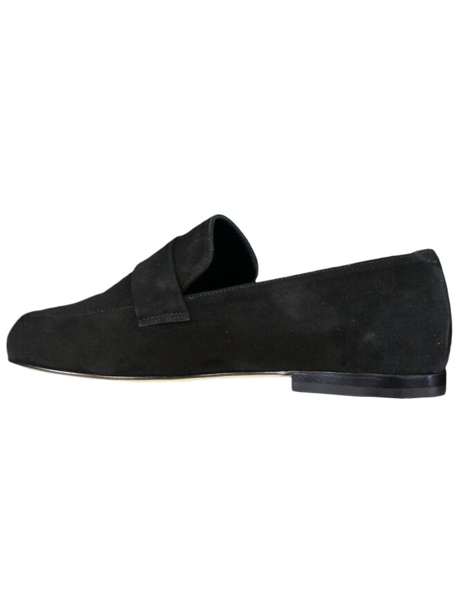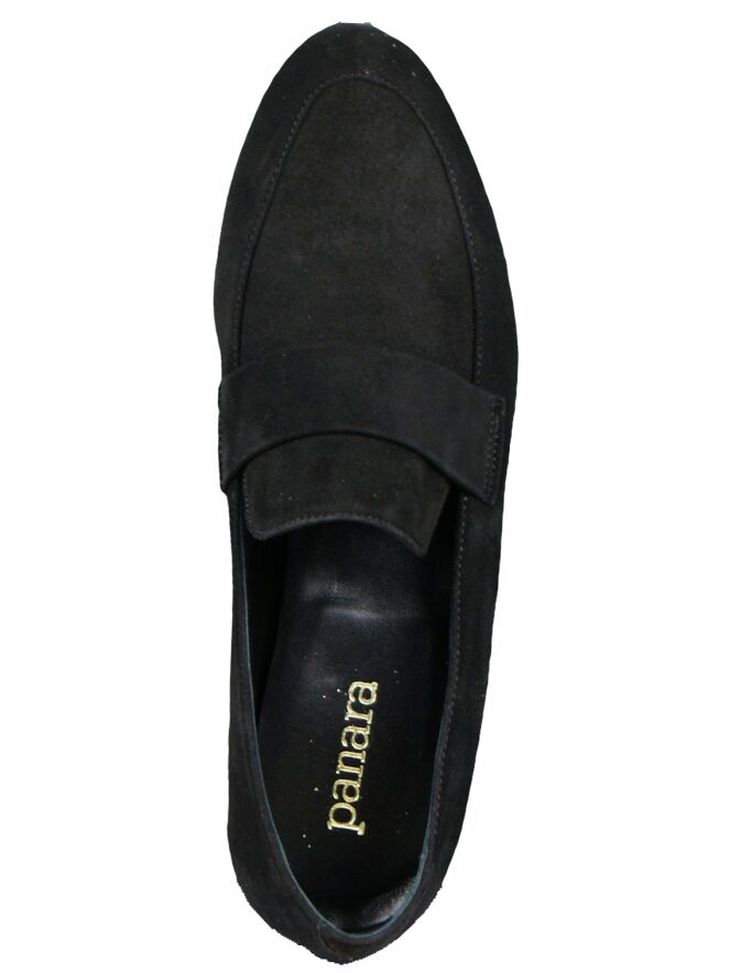 Mocassin en nubuck noir, de la marque Panara. Sur son nez légèrement arrondi, une étroite bande du même matériau traverse l'avant du pied. Modèle doublé cuir.