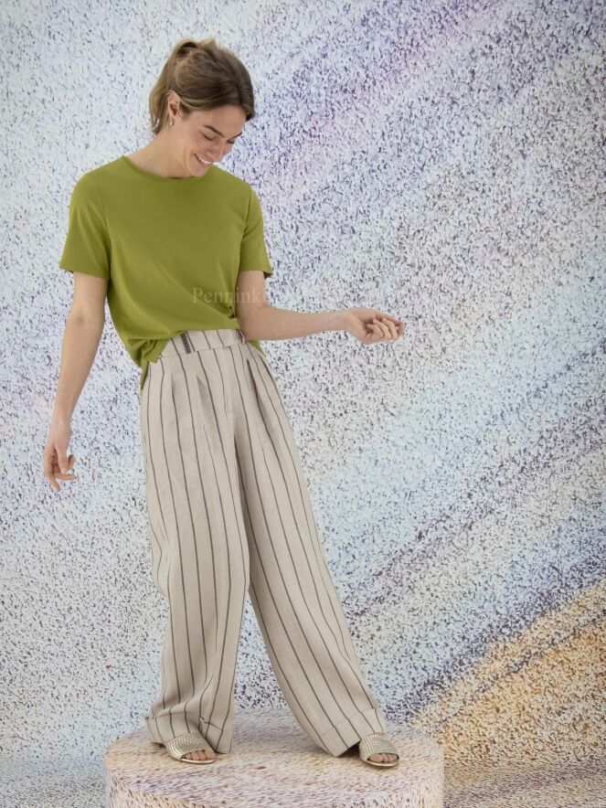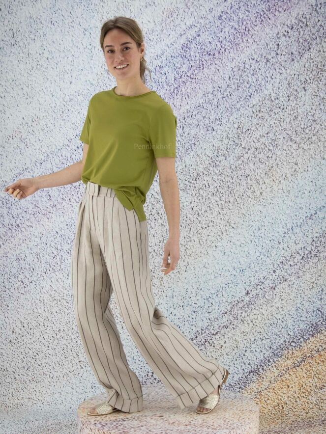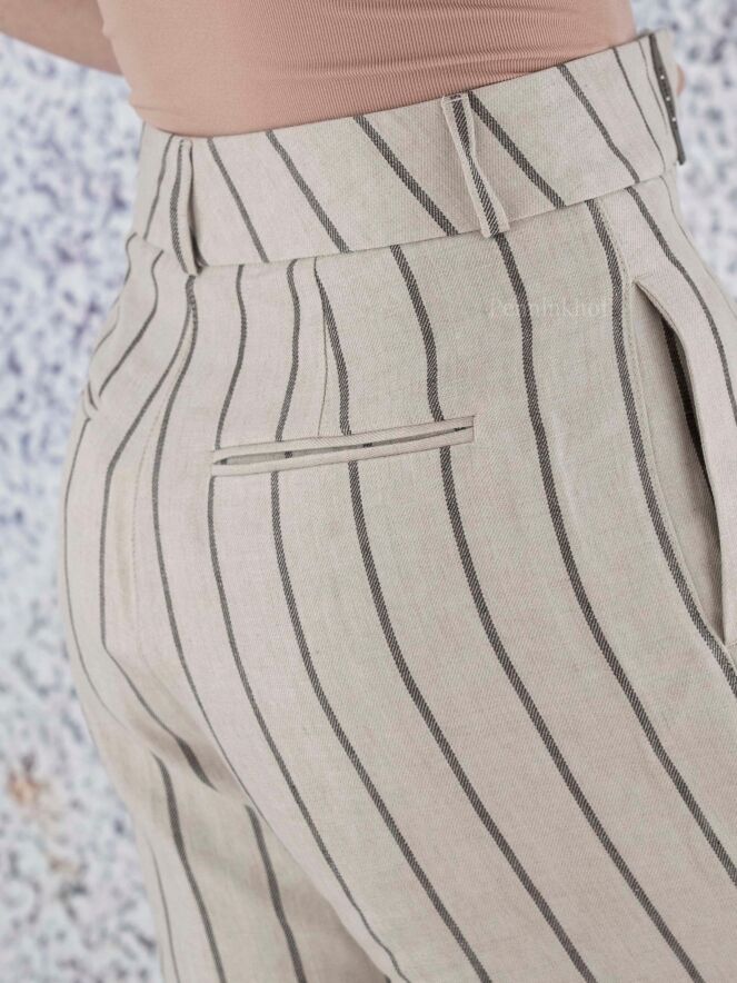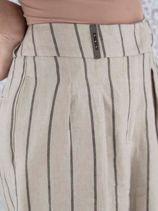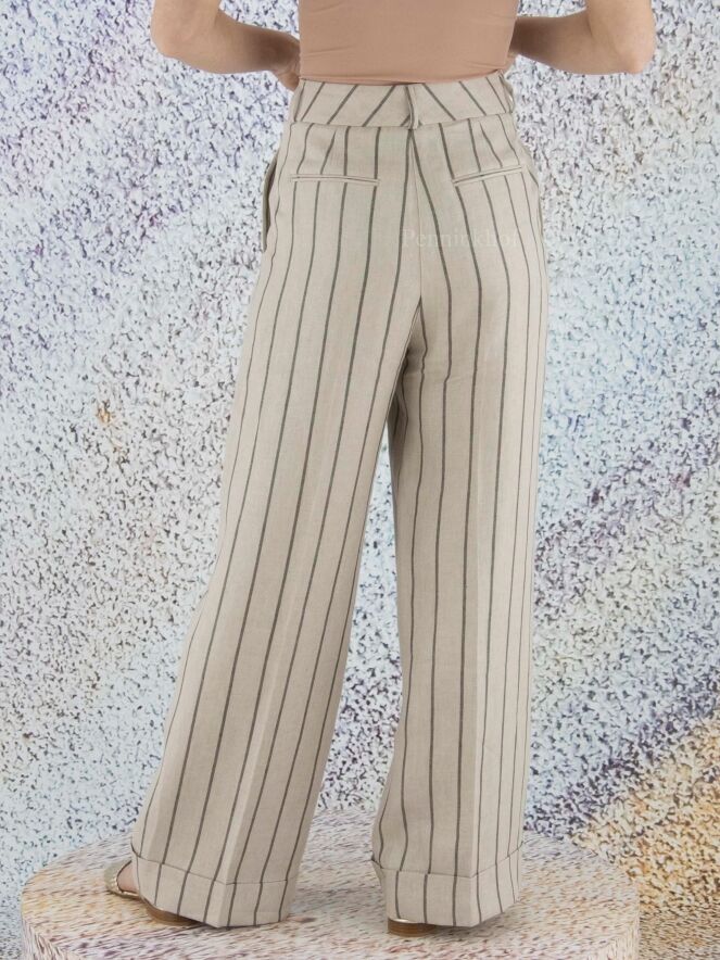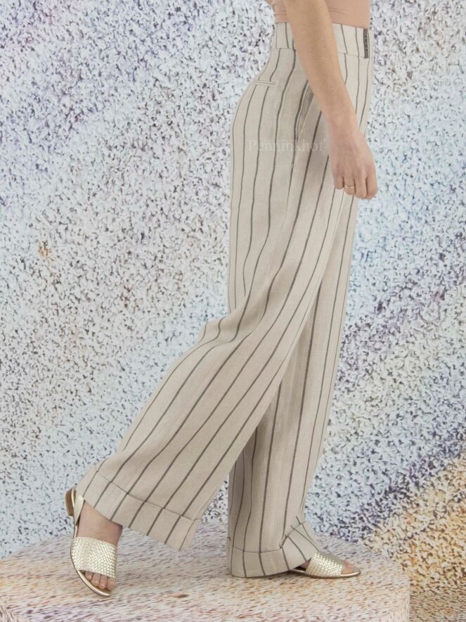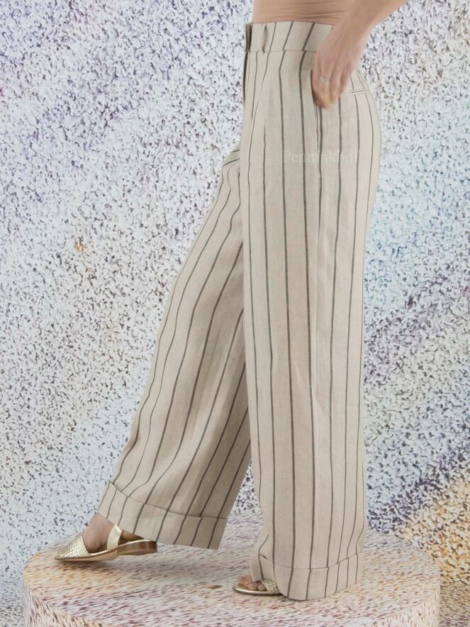 Pantalon à pinces et jambe large de la marque Peserico, à rayures gris foncé sur un fond de couleur beige. À partir de la taille, la jambe est ornée d'un pli central qui descend sur un large revers. Le pantalon est doté de poches latérales. Lavage à la main.