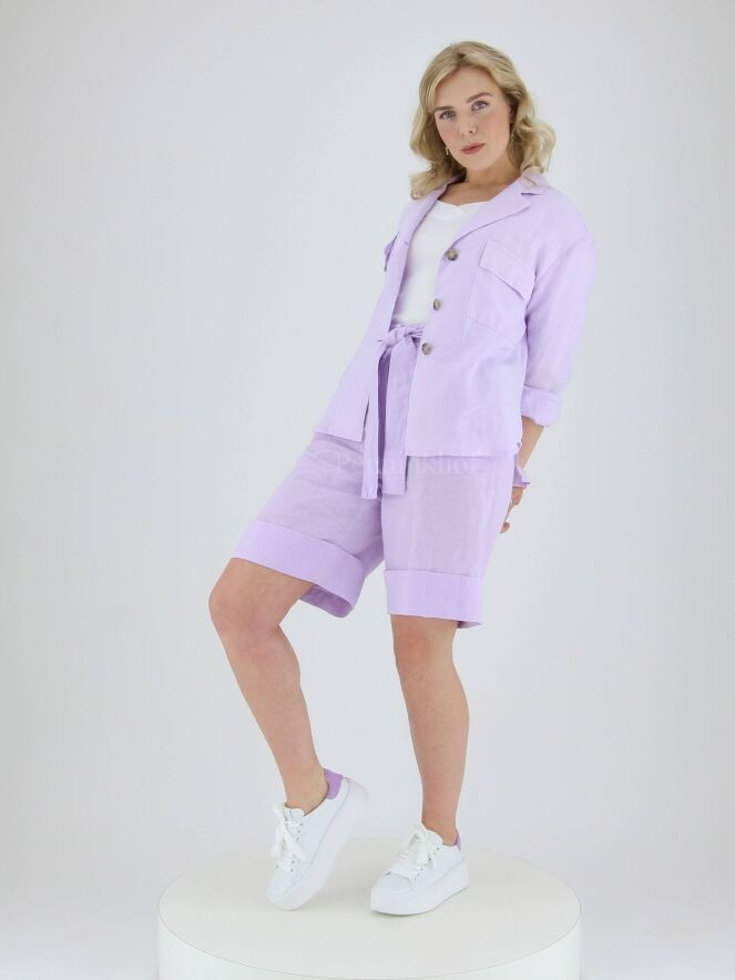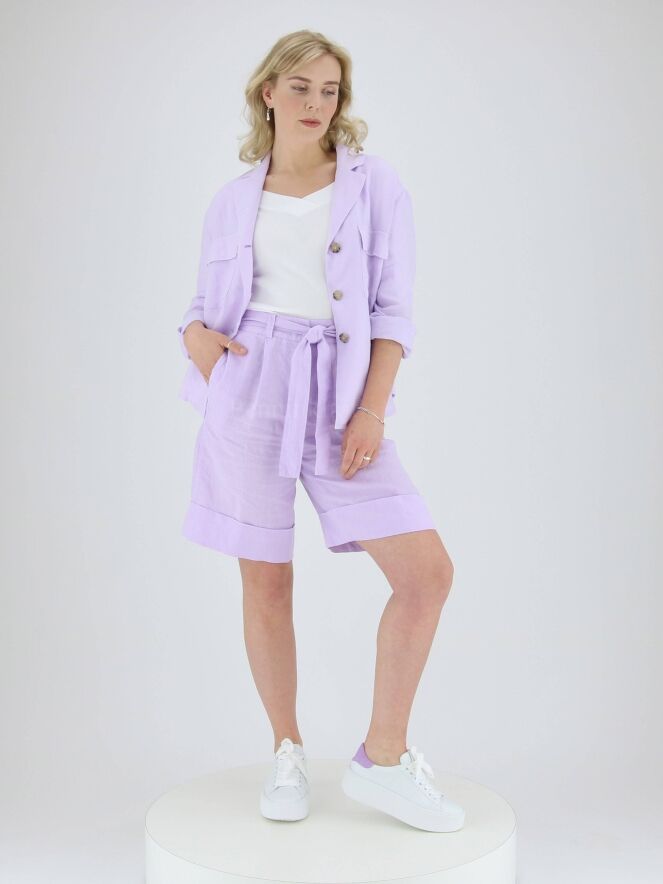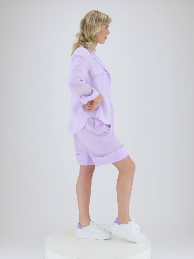 Bermuda de la marque Peserico, de couleur lilat. La taille est équipée d'une bande élastique finement froncée dans le dos et d'une ceinture dans le même tissu. Poches latérales et large revers au bas des jambes. Lavage à 30 degrés.