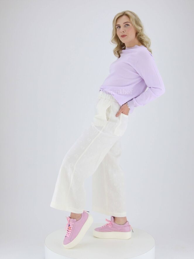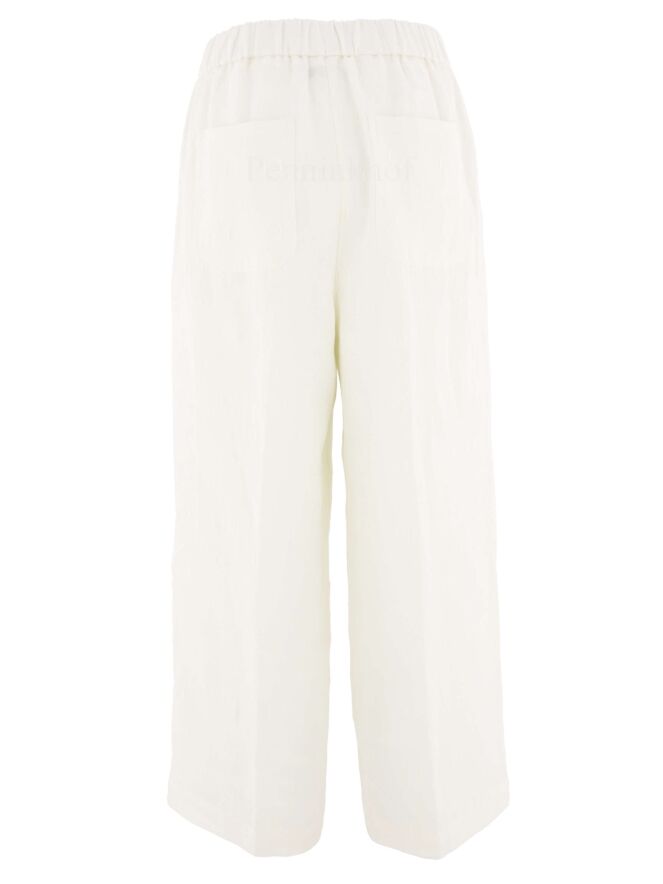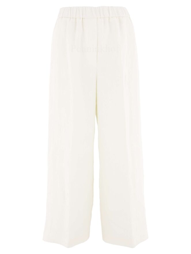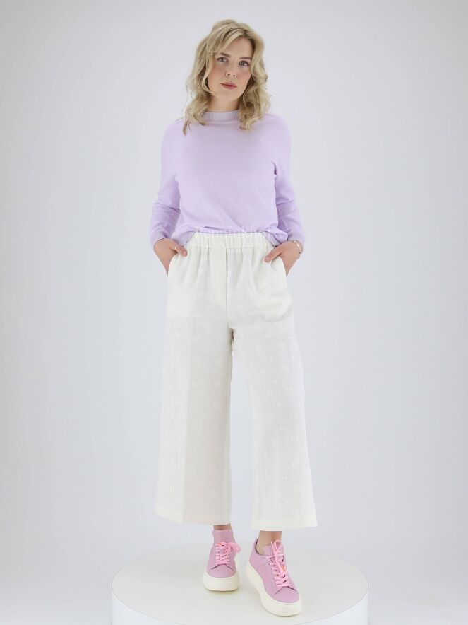 Pantalon large de la marque Peserico, de couleur blanc crème. Le tissu présente des petits et grands cercles en relief. La taille est équipée d'une fine bande élastique à fronces. Lavage à la main.