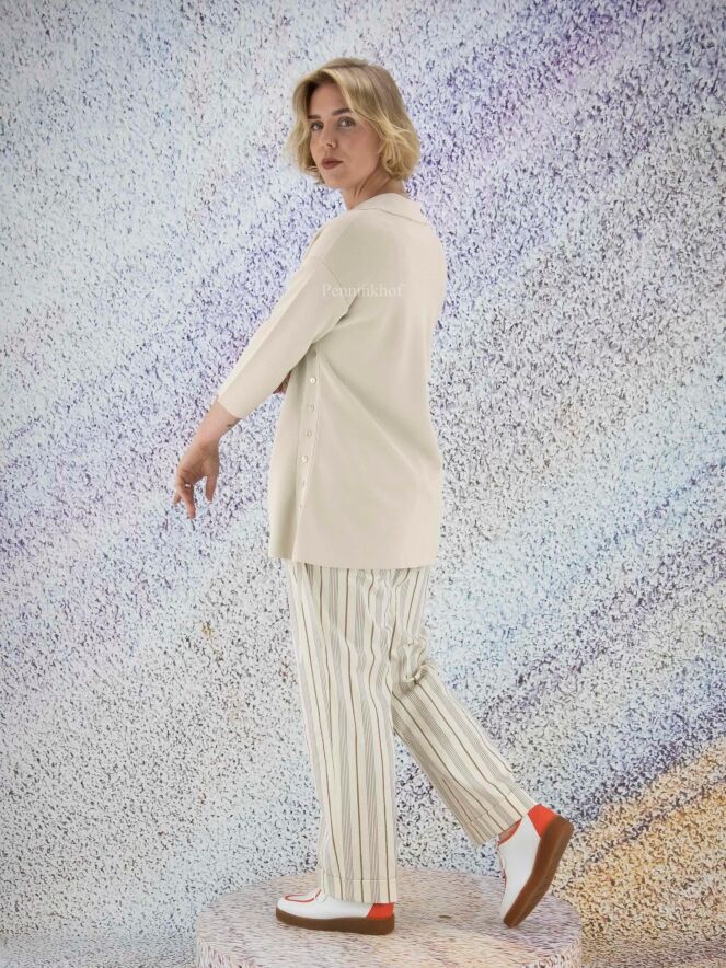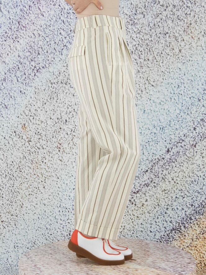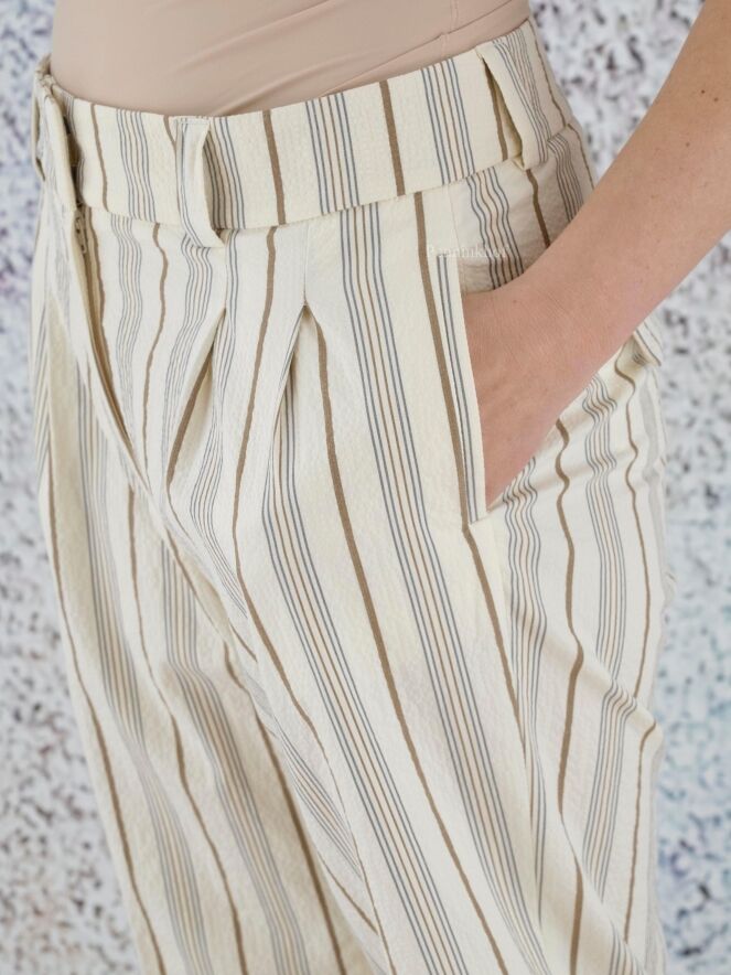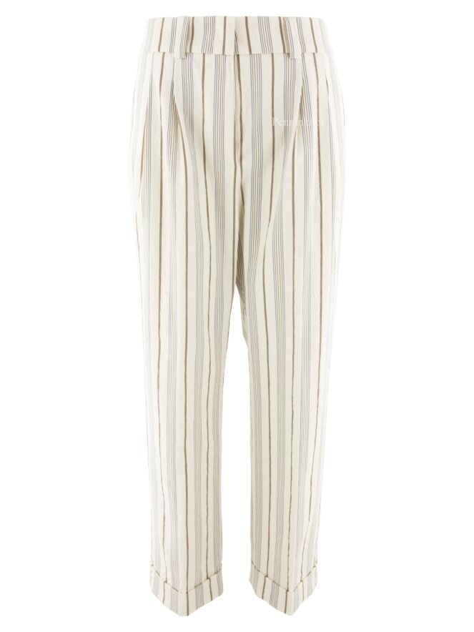 Pantalon de la marque Peserico, à motif rayé aux couleurs beige, gris et marron. À partir de la taille, il présente des pinces. Le bas des jambes est orné d'un revers. Des poches latérales sont prises dans la couture. Lavage déconseillé.