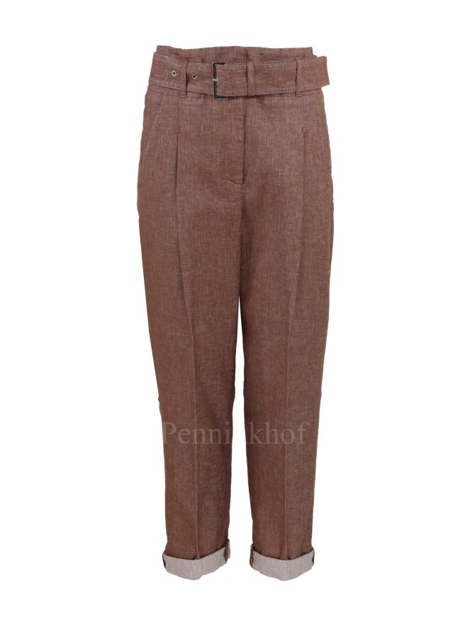 Pantalon large de la marque Peserico, de couleur marron chiné. Il est doté d'une large ceinture dans le même tissu que le pantalon. Il présente un pli de repassage sur la jambe et est équipé de poches latérales. Un revers vient habiller le bas du pantalon. Lavage à 40 degrés.